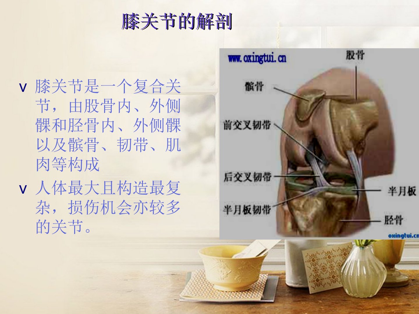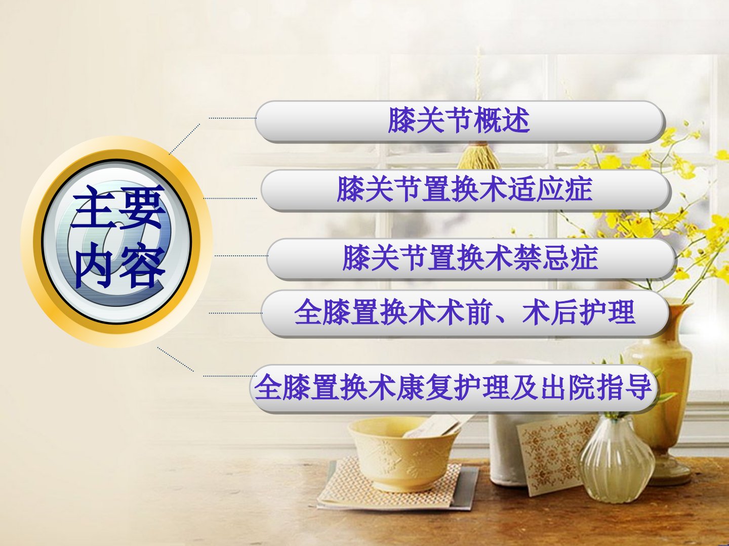 全膝关节置换术护理及康复摘要膝关节作为人体最大且构造复杂的关节病损会严重影响患者活动功能和生活质量。全膝关节置换术是目前最有效的关节重建手术之一短期和中期随访优良率接近90。一、手术相关人工全膝关节包括股骨、胫骨和髌骨假体由金属和超高分子量聚乙烯制成。手术适应症与禁忌症需严格把握绝对禁忌症为活动性感染病灶或膝关节感染相对禁忌症为肌肉瘫痪或神经性关节病变等。二、护理要点(一)术前护理包括心理准备与疏导、术前检查、全身情况评估、健康教育及康复锻炼指导等。(二)术后护理1一般护理:呼吸道、卧位、患肢、饮食护理等。2病情观察:严密观察生命体征、伤口渗血、患肢感觉运动功能等。3并发症护理:包括感染、深静脉血栓形成、假体松动、出血、血管神经损伤、骨折、关节僵硬、血肿、侧副韧带损伤、髌韧带损伤等并发症的观察与预防。三、康复护理(一)康复目的与原则旨在恢复膝关节功能遵循患者耐受、循序渐进的原则。(二)康复教育包括手术当日、术后1天至3周等不同时间段的康复锻炼指导如股四头肌收缩锻炼、踝关节屈伸活动、被动伸膝抬高练习等。四、出院指导包括伤口护理、预防关节感染、日常生活注意事项、假体保护等方面。