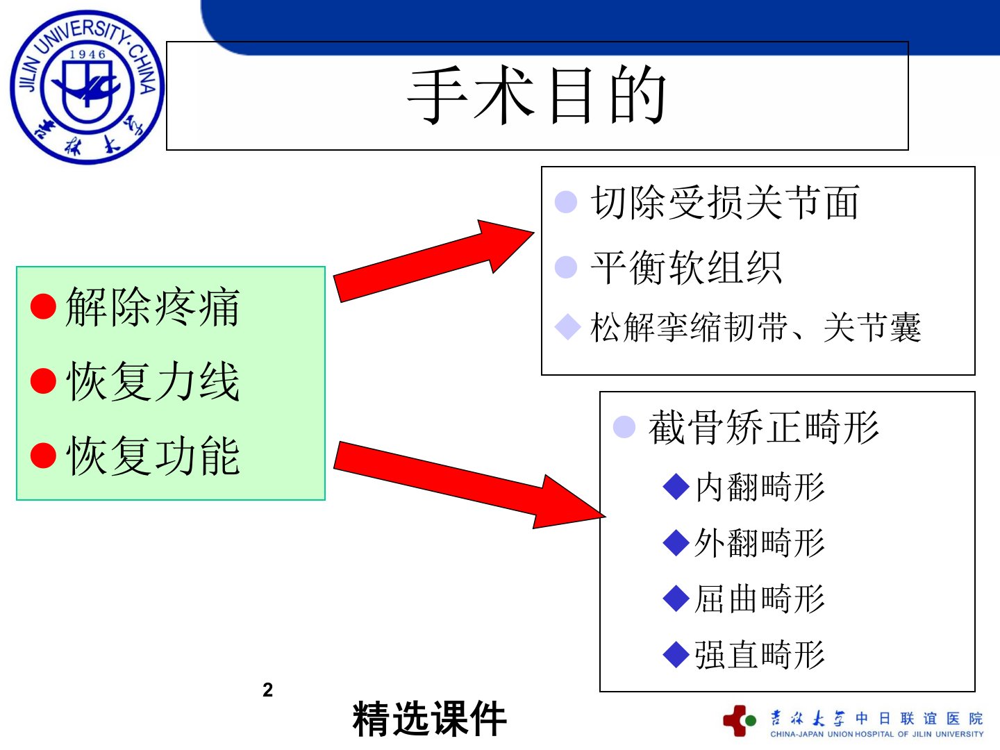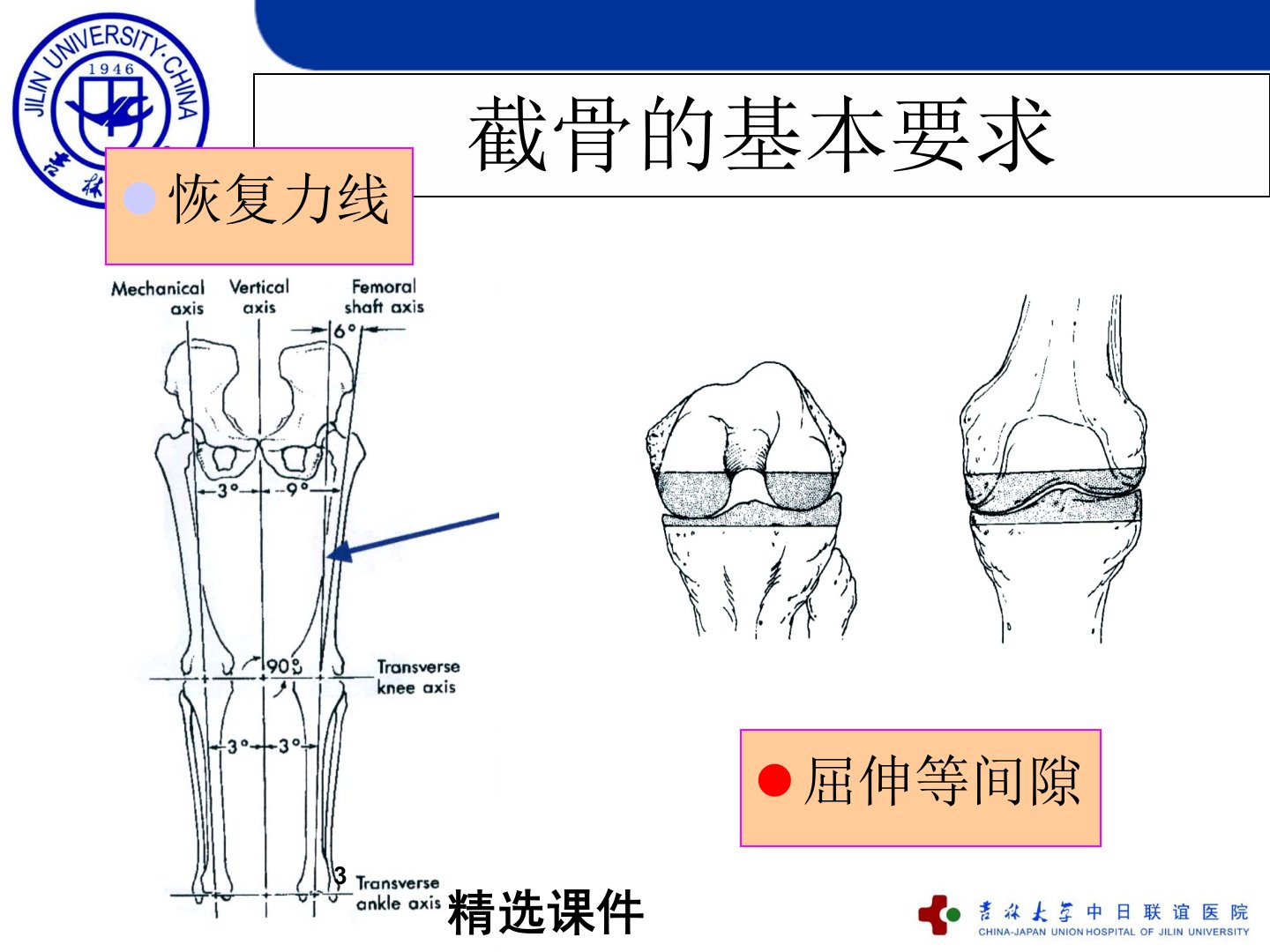 全膝关节置换术中截骨原则至关重要手术目的是解除疼痛、恢复力线与功能这涉及切除受损关节面、平衡软组织、松解挛缩韧带及关节囊并通过截骨矫正内翻、外翻、屈曲、强直等畸形。截骨的基本要求是恢复屈伸等间隙与力线其中解剖基础与软组织平衡是恢复力线的关键有助于提高人工关节功能延长其使用寿命。具体操作中截骨顺序与定位是核心股骨截骨可采用髓内定位需注意股骨远端前弓对入点计划及假体安放的影响同时拍片时下肢应处于旋转中立位避免矢状面曲度转化为冠状面曲度。股骨髁截骨需测定前后截骨量旋转定位可参照后髁轴外旋3度或采用上髁轴等更可靠的解剖标志。胫骨近端截骨采用髓外定向需注意后倾角截骨量参照术前计划以缺损较少的一侧为准避免过量截骨。在截骨后若出现屈伸间隙不等的情况需根据具体原因调整截骨量或进行软组织松解。手术成功的要点在于精确且个体化的截骨以恢复力线与软组织平衡重建稳定、功能良好的膝关节。