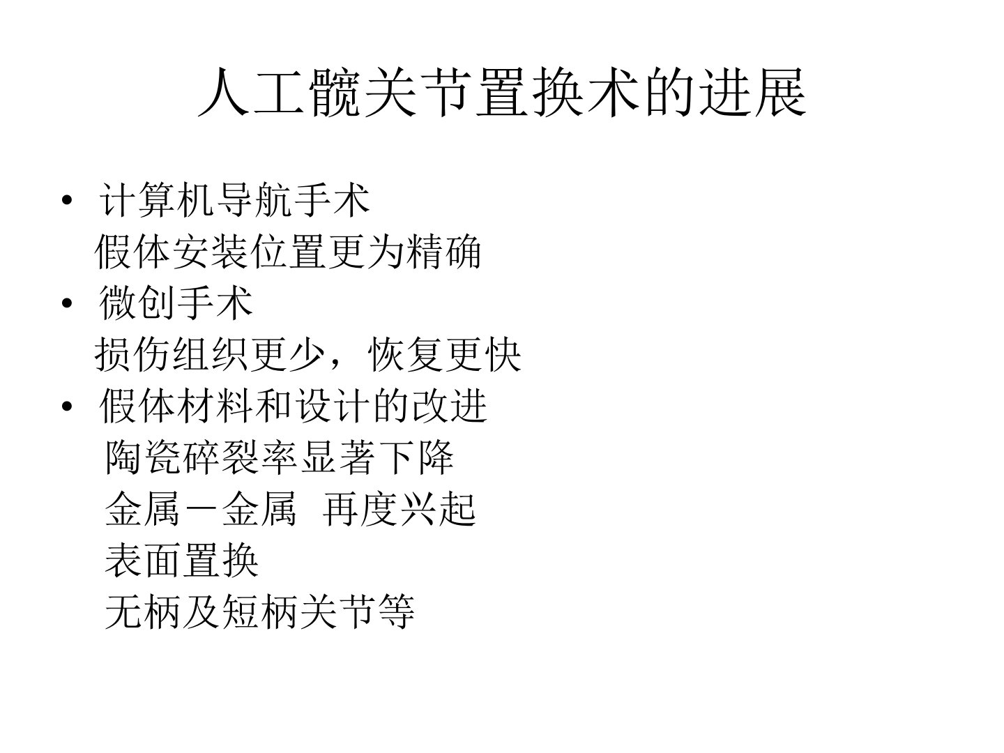 全髋关节置换术疗效确切近期和远期均表现良好但存在并发症风险。常见问题包括术后关节脱位、假体周围感染、松动下沉、骨折及神经血管损伤等。关节脱位发生率随技术提升而下降但仍是翻修手术中常见问题原因包括假体安装位置不良、软组织松弛等治疗需根据脱位原因处理。假体周围骨折多因骨质疏松、操作失误等处理需恢复假体稳定必要时植骨。假体周围感染发病率下降但仍需重视预防包括改善手术环境、应用抗生素等治疗需根据感染分型处理。假体无菌性松动是人工关节置换术失败主因预防需减少假体磨损、正确安装、使用耐磨材料等。周围神经损伤和血管损伤虽不常见但后果严重预防需注意外科操作技术、避免肢体过度延长、仔细轻柔操作等。