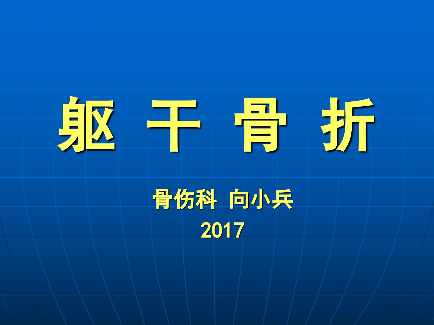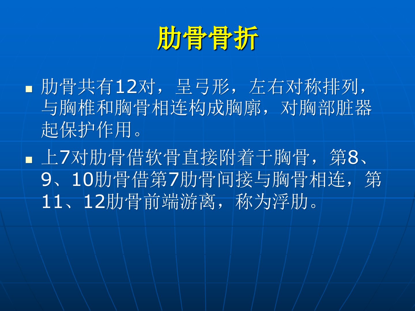 躯干骨折骨伤科知识摘要肋骨骨折1解剖:由12对肋骨组成上7对直接连胸骨810对间接连11、12对为浮肋保护胸部脏器。2病因:直接暴力致骨折端移位可穿破胸膜及肺脏;间接暴力多在腋中线附近致伤;肌肉收缩致疲劳骨折多见于体质虚弱者。3诊查:有外伤史受伤后局部疼痛说话等活动时加剧呼吸浅快胸廓挤压征阳性常见血气胸等并发症。早期X线片可能“阴性”胸部CT可早期发现病变。4治疗:重点是止痛和预防肺感染。单纯骨折一般不需整复;多根或多节段骨折移位明显时需复位和固定整复方法有挤按手法、肋骨牵引法等固定可用胶布、尼龙扣带或弹力绷带必要时手术治疗。药物治疗分内治和外治并发症需针对性处理。脊柱骨折1解剖:由3334块椎骨组成有四个生理弯曲脊髓位于椎管内发出31对脊神经“三柱概念”划分胸腰椎结构。2病因:包括屈曲型、过伸型、垂直压缩性型等多种损伤类型。3诊查:有外伤史伤后脊柱疼痛、活动障碍。影像学检查首选X线片CT扫描显示结构清晰MRI扫描对脊髓损伤检查有效还有电生理检查辅助判断。稳定性损伤如单纯椎体压缩性骨折不超过13等不稳定性损伤如骨折脱位等。4治疗:急救先判断损伤部位和瘫痪类型。整复方法多样固定用牵引结合