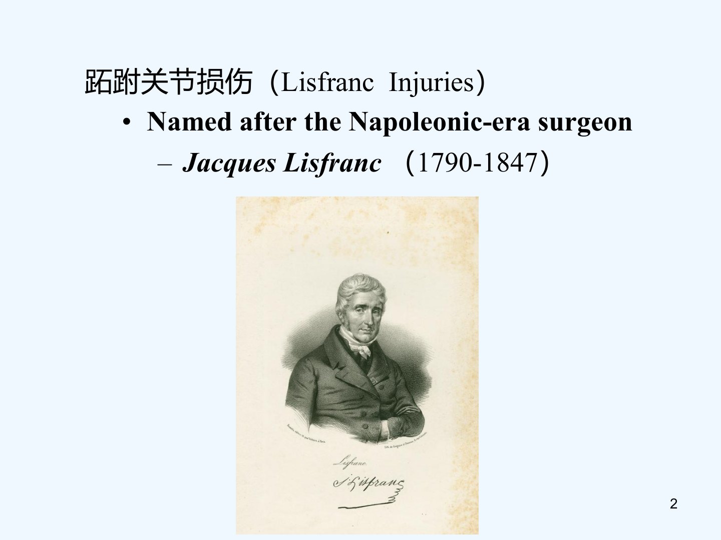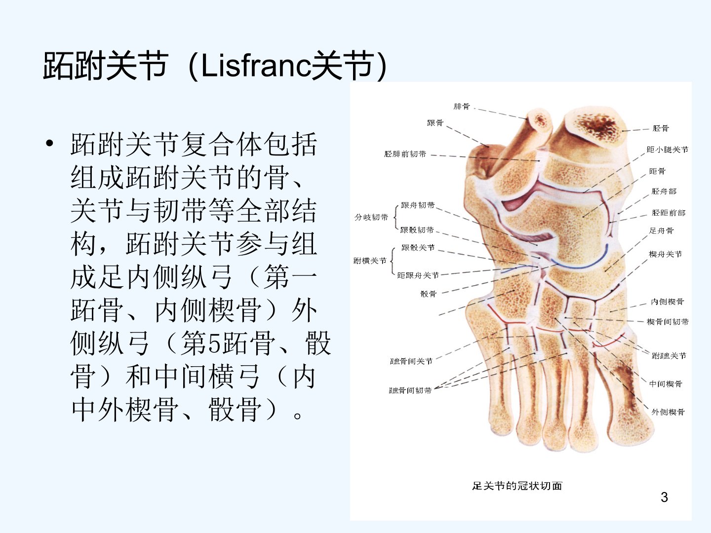 前中足骨折脱位跖跗关节损伤摘要前中足骨折脱位跖跗关节损伤以拿破仑时代外科医生JacquesLisfranc命名。跖跗关节复合体包括骨、关节与韧带参与足内侧、外侧纵弓及中间横弓构成维持足弓稳定和负重功能。Lisfranc关节损伤由纵向挤压、扭转和外翻力造成第1、2跖骨基底间软组织薄弱损伤后易移位还可能引起骨筋膜间室综合征及前足坏死。损伤分型采用Myerson分类分A、B、C三型。诊断依赖临床表现、体格检查和X线、CT等放射学评估。治疗金标准为解剖复位、稳定内固定非移位损伤可保守治疗移位损伤需手术治疗包括切开复位内固定和关节融合。并发症有创伤性关节炎、筋膜间室高压症等功能恢复需一年以上复位不完全会增加畸形和慢性足痛发病率。处理需重视诊断、分型、切口和内固定选择。此外文本还简要介绍了跖骨骨折和跖趾关节脱位、趾间关节脱位及趾骨骨折的病因病理、临床表现、诊断及治疗方法。