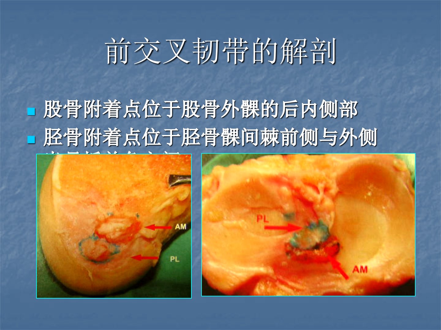 浅谈前交叉韧带损伤摘要前交叉韧带股骨附着点在股骨外髁后内侧部胫骨附着点在胫骨髁间棘前侧与外侧半月板前角间分前内侧束和后外侧束。屈曲位时后外侧束松弛前内侧束在屈膝位紧张维持膝关节前向稳定性;接近伸直位时后外侧束紧张防止胫骨平台旋前不稳。前交叉韧带断裂70以上由运动损伤导致篮球、足球等剧烈运动中常见非运动损伤有交通伤、生产生活意外伤等。损伤机制包括屈曲位胫骨前移受暴力、膝关节过度内旋、突然减速运动。急性期表现为疼痛、肿胀、活动受限等;慢性期有膝关节慢性疼痛、不稳、易再次受伤及继发损伤。诊断可用轴移试验、Lachman试验、前抽屉试验。还有特殊类型即ACL胫骨止点撕脱骨折但交叉韧带无断裂。前交叉韧带是膝关节运动与稳定的重要装置确诊损伤后应尽快手术。