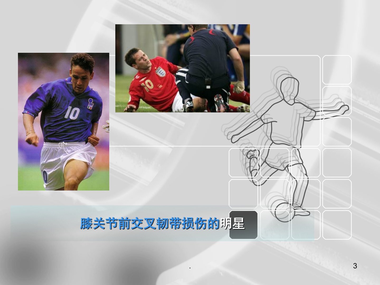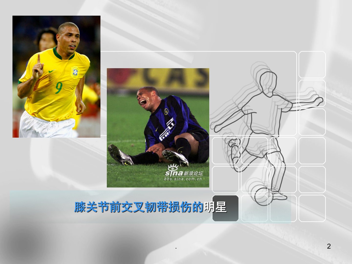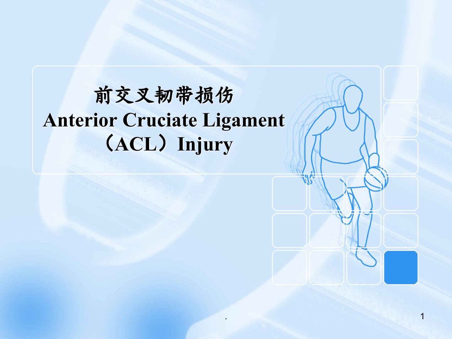 前交叉韧带损伤摘要发病率全美每年ACL发病超10万人575万患者接受重建手术在骨科手术中排第六。运动员中足球、篮球等项目风险较高女性比例高于男性;非运动员中男性比例更高。研究历史前交叉韧带损伤研究历史悠久3000BC古埃及即有记载300BC希波克拉底描述了ACL断裂病例19世纪起生物力学特性、发生机制、重建手术等研究陆续开展。2016年Pubmed上“anteriorcruciateligament”检索结果达16166条涵盖解剖学、生物力学等多方面研究。解剖与功能ACL起自股骨外髁内侧面向远、前、内斜行穿过髁间窝止于胫骨平台内侧是重要的静力与动力性稳定结构与其他韧带共同保持胫骨关节的正常运动。主要功能包括防止胫骨前移、控制膝关节旋转与内外翻、阻止过伸及本体感受。损伤机制常见机制包括屈膝外翻伤、内翻伤、过伸伤及撞击伤。屈膝外翻伤最常见多见于足球、滑雪等运动。临床表现1症状:疼痛、肿胀、功能障碍、交锁、不稳。2体征:肿胀、膝关节过伸、股四头肌萎缩等。特殊检查包括Lachman试验、前抽屉试验、轴移试验。辅助检查X线可见Segond征MRI最有诊断价值关节镜可直接观察KT2000可测量关节
