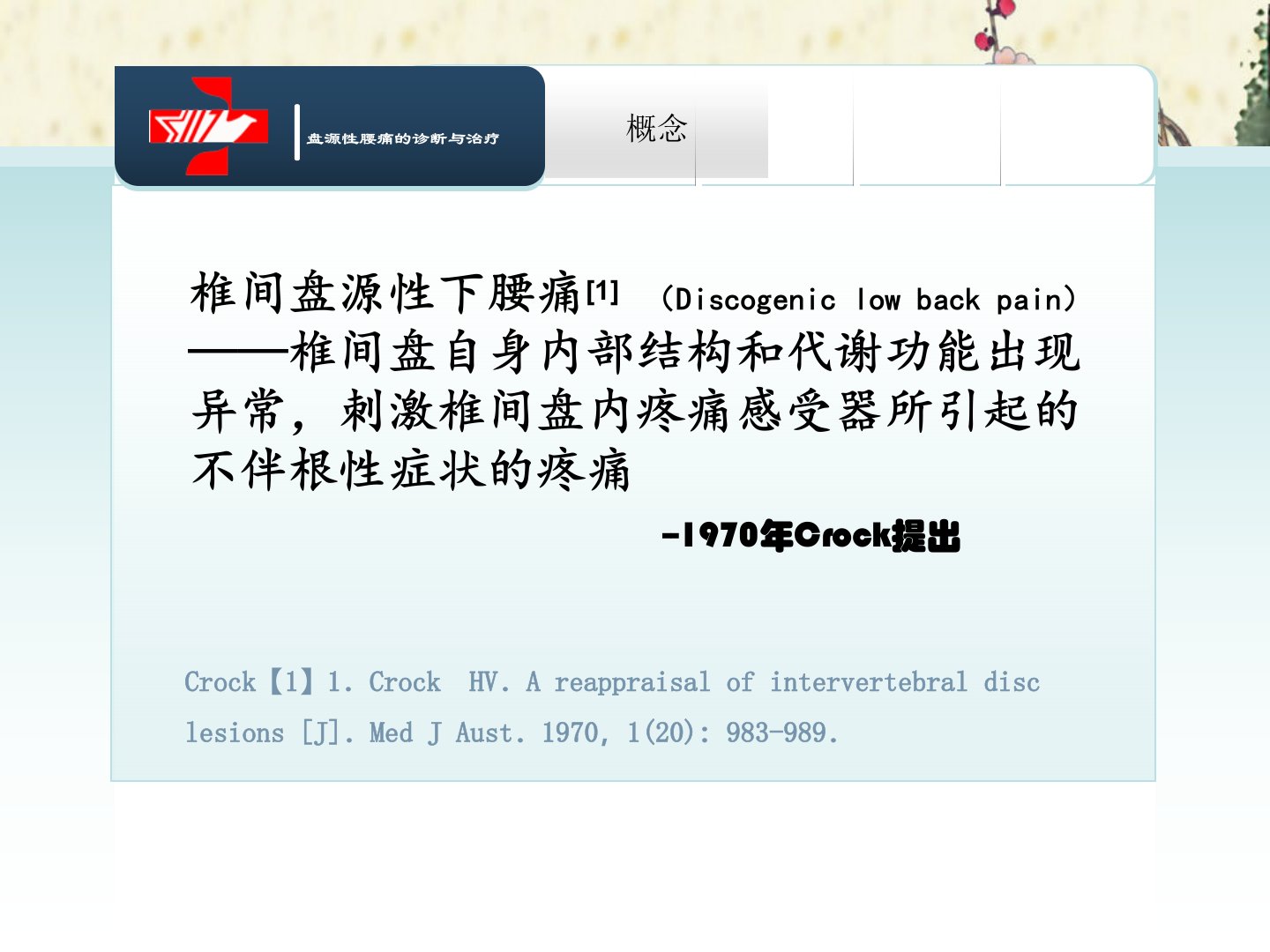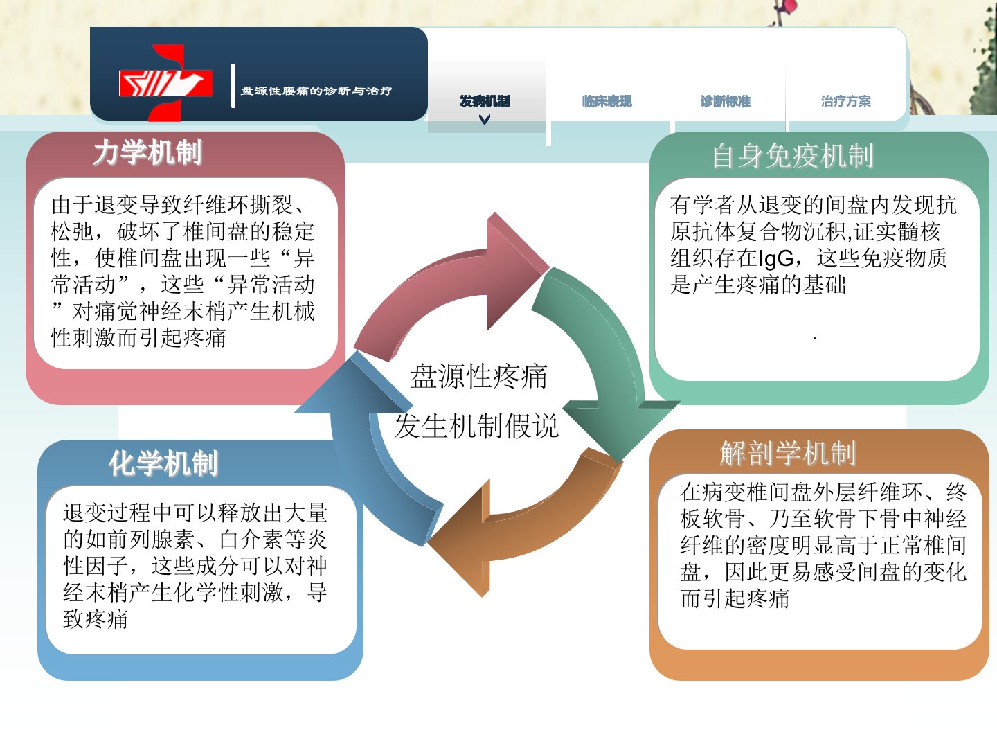 椎间盘源的诊断治疗摘要本文介绍了椎间盘源性腰痛的概念、发病机制、临床表现、诊断标准及治疗方案。椎间盘源性腰痛由椎间盘内部结构和代谢功能异常引起不伴根性症状1970年由Crock首次提出。发病机制包括化学、力学、解剖学及自身免疫机制。临床表现主要为深在的下腰痛活动加重伴有臀部、腹股沟、大腿内侧的疼痛但运动、感觉和反射一般无异常。诊断标准包括外伤史、症状反复发作半年以上、MRI上病变椎间盘低信号部分出现高信号区(HIZ)、椎间盘造影阳性等。影像学诊断方法包括X线片、CT、MRI及腰椎间盘造影术其中椎间盘造影术是公认的诊断金标准。治疗方案包括非手术治疗和手术治疗非手术治疗包括卧床休息、药物、物理康复等大多数患者不需外科治疗。手术治疗包括微创治疗和开放手术治疗如融合手术、动力稳定装置、人工髓核置换术、人工椎间盘置换术等各有适应症和禁忌症。