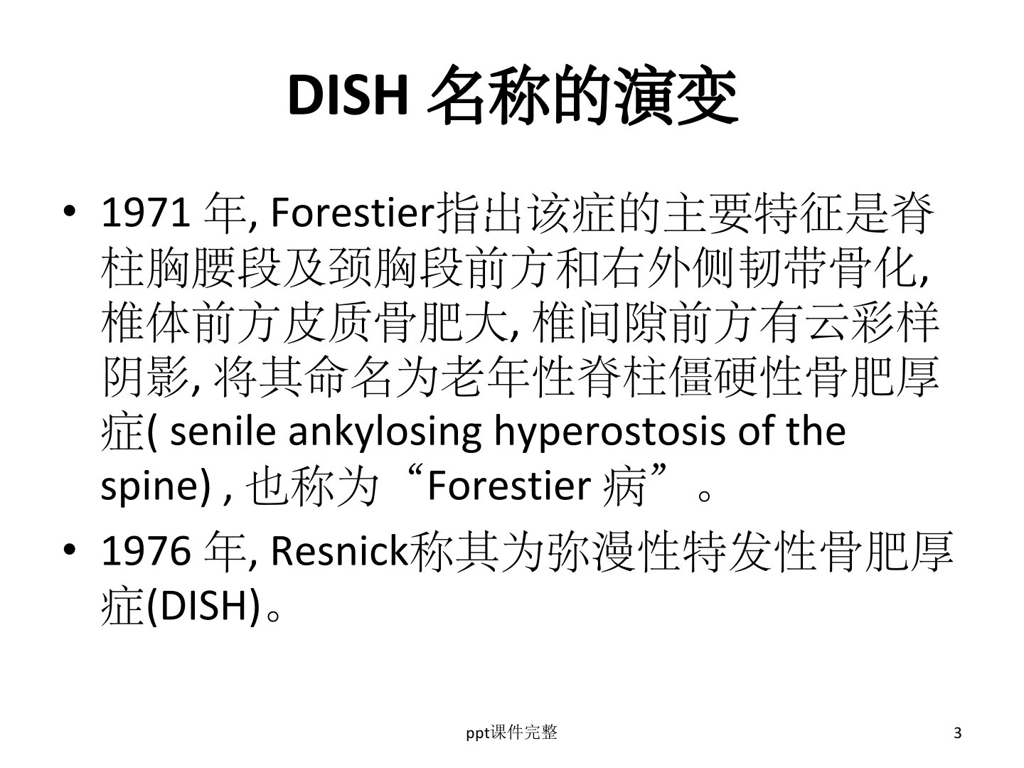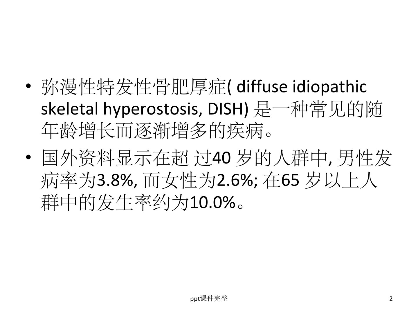 弥漫性特发性骨质增生症(DISH)是随年龄增长而增多的常见疾病国外资料显示40岁以上人群中男性发病率38女性2665岁以上发生率近100。1971年Forestier首次描述该病特征将其命名为老年性脊柱僵硬性骨肥厚症1976年Resnick正式命名为DISH。DISH病因不明或与内分泌失调、高血糖、肥胖有关。病理改变主要为脊椎前纵韧带、椎旁结缔组织和纤维环的钙化或骨化伴血管增生和慢性炎症细胞浸润。临床症状包括脊柱僵硬、疼痛外周关节炎及骨化神经系统异常以及吞咽困难、咽喉痛、声音嘶哑等。体格检查可见胸背部脊柱骨骼压痛脊柱及外周骨关节活动受限。约40的DISH患者有隐性或临床糖尿病部分血维生素A水平升高。诊断标准包括至少4个相邻椎体前外侧连续性骨化等。需与强直性脊柱炎、脊柱退行性骨关节病、氟骨症等鉴别。X线检查为首选CT可更清楚显示椎体后缘增生。治疗原则与骨关节炎类似包括非手术治疗和手术治疗。