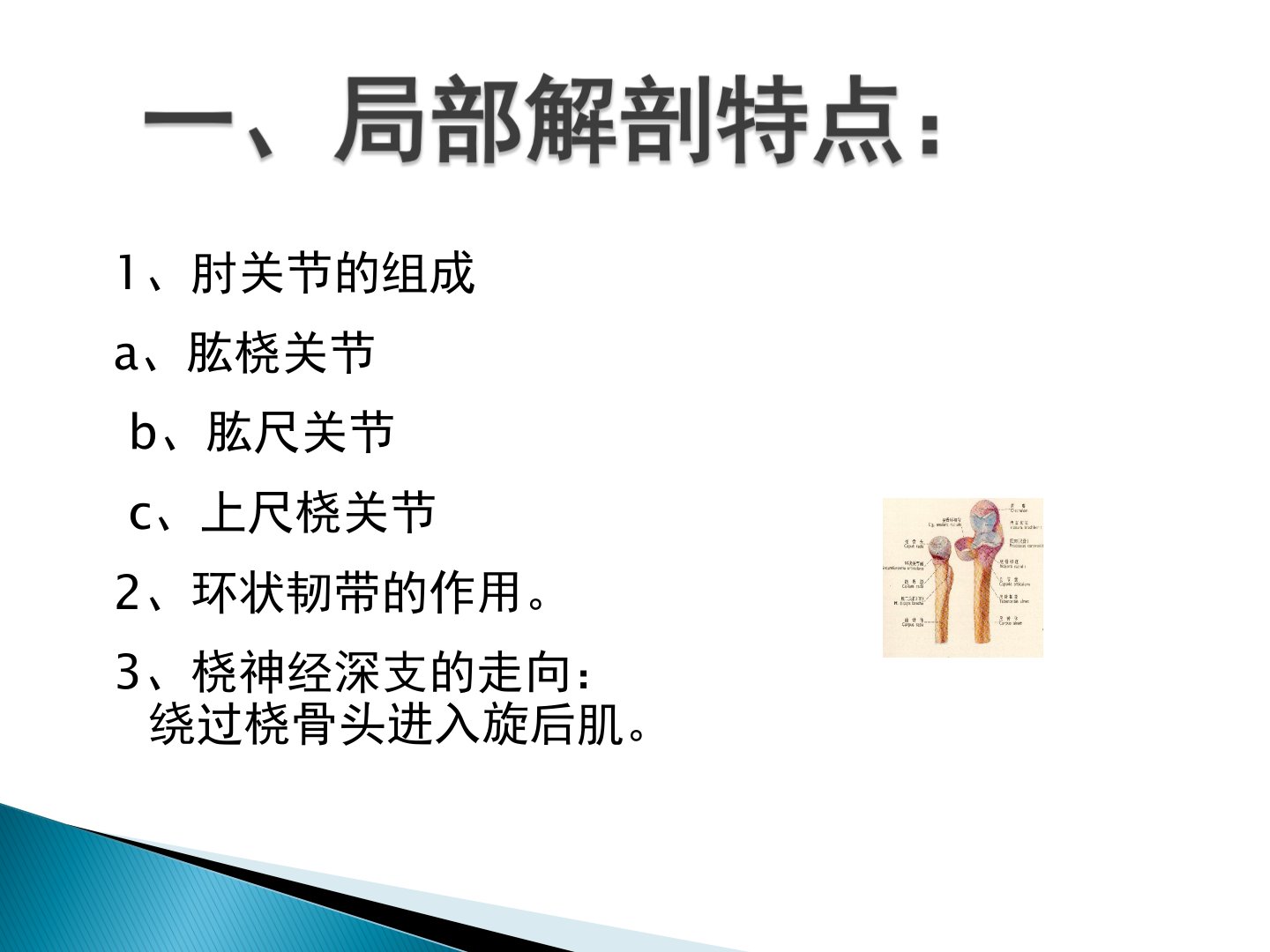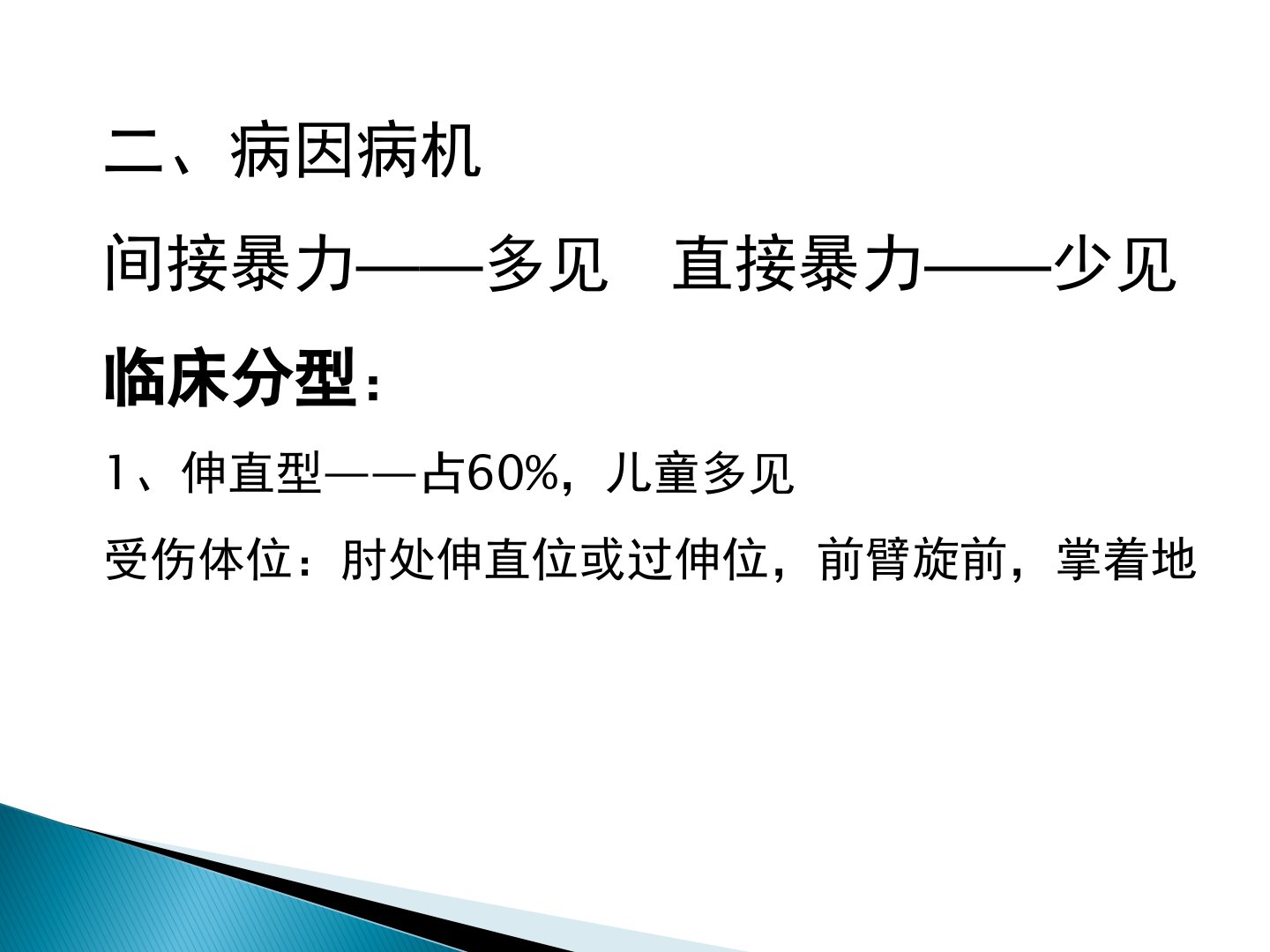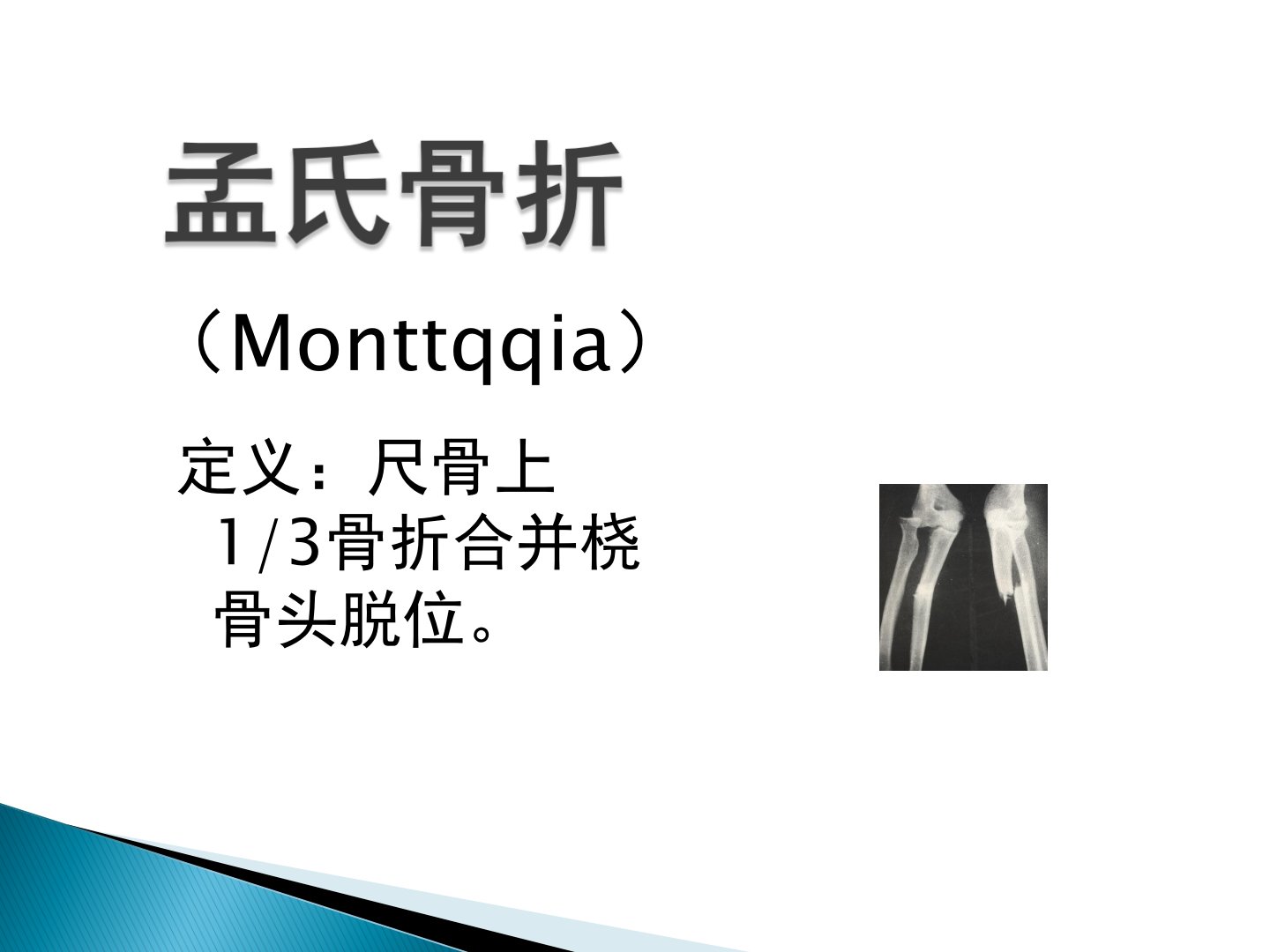 孟氏骨折指尺骨上13骨折合并桡骨头脱位。其局部解剖涉及肘关节组成、环状韧带作用及桡神经深支走向。病因上间接暴力多见直接暴力少见。临床分型有:伸直型(占60儿童多见肘伸直或过伸位受伤尺骨上13骨折伴桡骨头向前外脱位)、屈曲型(占15成人多见肘微屈位受伤尺骨横断或短斜形骨折伴桡骨头向后外脱位)、内收型(占20幼儿多见肘伸直内收位受伤尺骨冠状突下方骨折伴桡骨头向外脱位)。诊断要点包括伤后肘部及前臂肿胀、畸形X线片检查需包含肘关节必要时含腕关节。治疗原则为先整复桡骨头脱位再整复骨折。固定方法有夹板或石膏外固定陈旧性骨折等特殊情况需手术处理。盖氏骨折指桡骨下13骨折合并下尺桡关节脱位临床分三型诊断要点为伤后前臂肿胀疼痛有畸形X线片需包含腕关节。治疗根据骨折类型进行手法复位和固定。