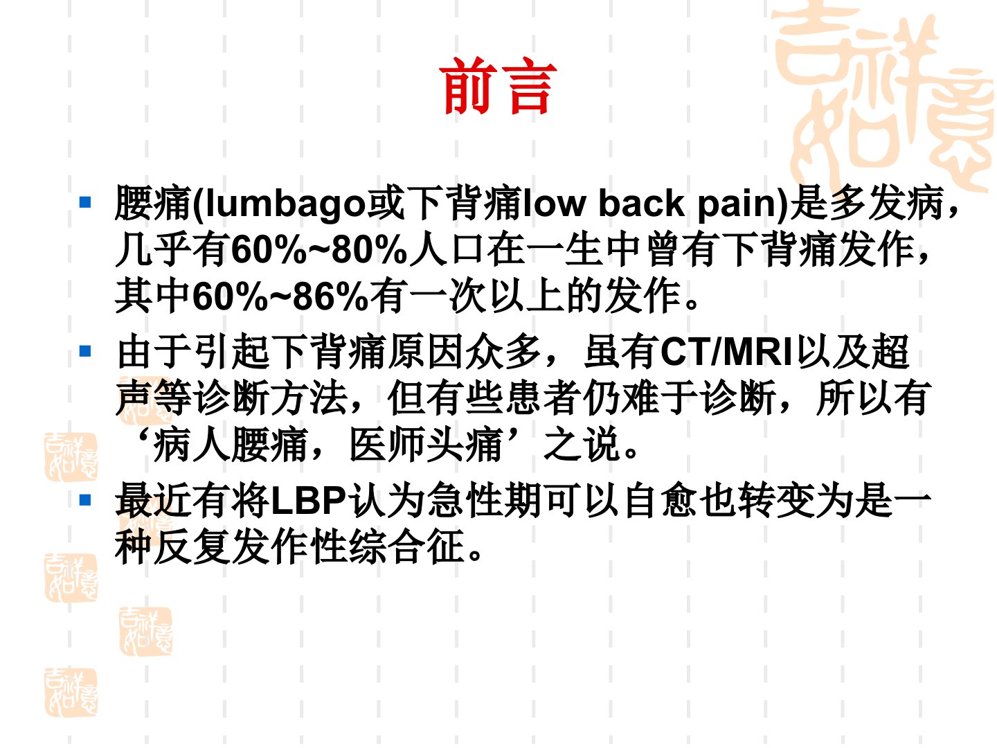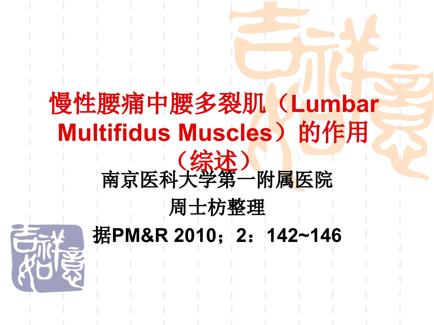 慢性腰痛中腰多裂肌的作用(综述)摘要南京医科大学周士枋对腰多裂肌(LMM)在慢性腰痛中的作用进行综述。下背痛(LBP)是多发病病因复杂部分患者难以诊断。稳定脊柱疗法(重点发展腰背肌肌力)在缓解疼痛、减轻功能受限、用药量以及复发率方面效果较好。LMM是腰椎中心区重要稳定肌群短而壮高横截面(CSA)使其能在较小收缩范围产生较大力。功能上LMM深层纤维以张力性为主适合稳定;浅层纤维具有相位性功能。LMM萎缩常与下背痛相关其萎缩可能因背支综合征由椎体间关节病变产生疼痛导致反射性萎缩。影像学检查(MRI、CT、超声)可识别LMM萎缩。Danneels等发现动力静力抗阻治疗组LMMCSA明显增大;Van等发现视觉反馈改善LMM等长收缩训练效果;Sung发现增强脊柱稳定性训练改善LMM功能并减轻疼痛。结论:LMM是脊柱中心区重要稳定肌群其萎缩可降低对脊柱中心带的控制并产生LBP症状萎缩源于疼痛脊柱产生的抑制弧以静力抗阻为主的肌力训练可治疗LBP并改善功能。