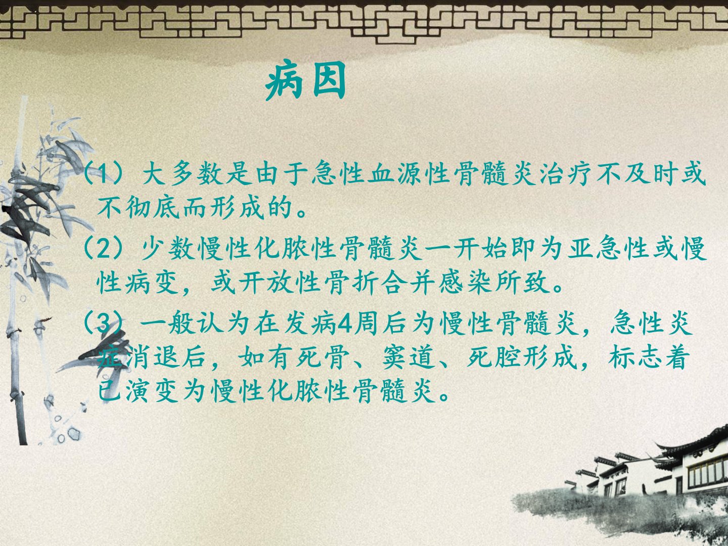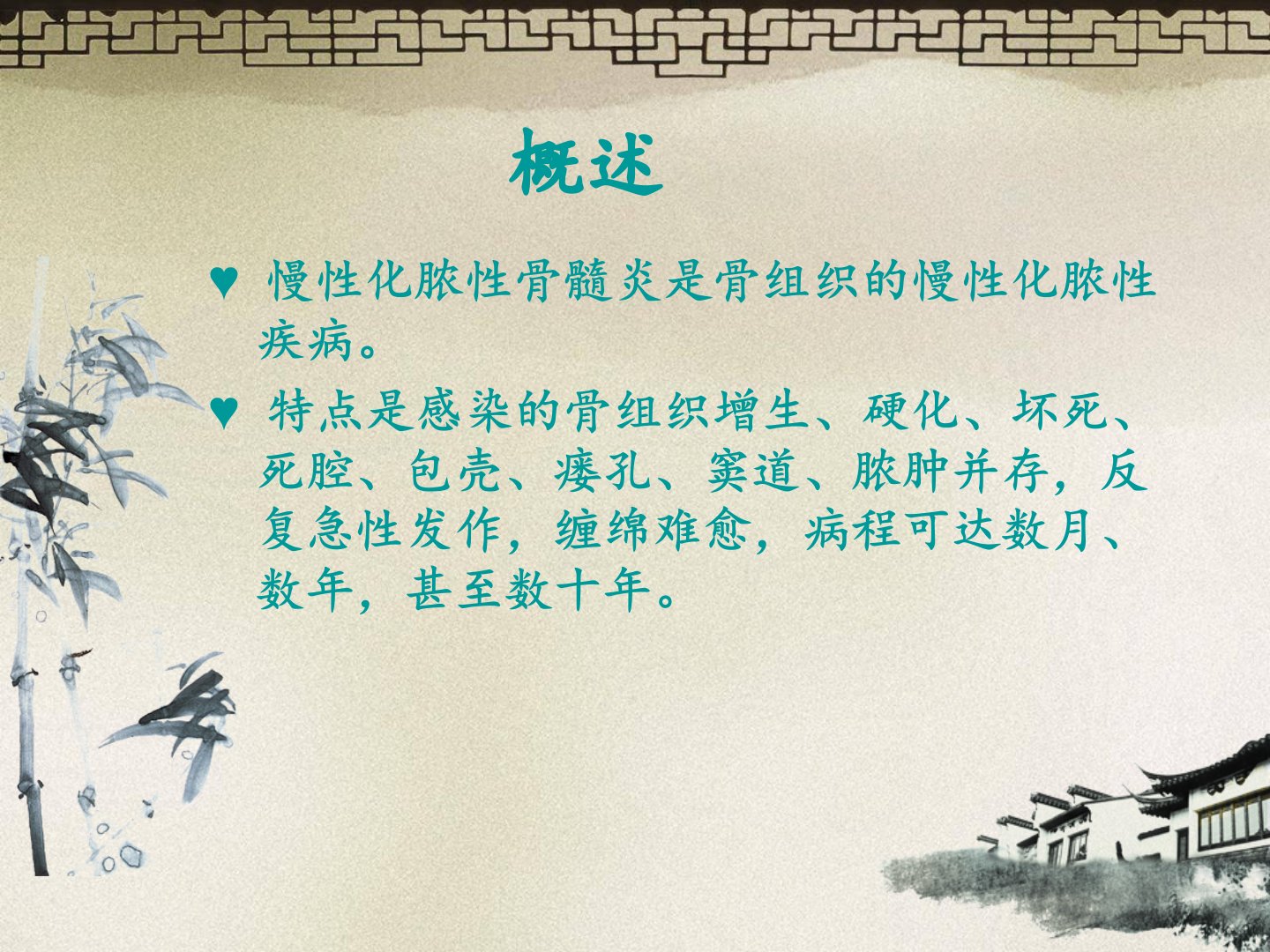慢性化脓性骨髓炎是骨组织的慢性化脓性疾病病程缠绵可达数年甚至数十年。其大多因急性血源性骨髓炎治疗不及时或不彻底形成少数一开始即为亚急性或慢性病变或开放性骨折合并感染所致。病因病理包括窦道、死骨形成及骨包壳和感染性死腔产生。临床表现上炎症静止期可无症状肢体有增粗、变形等畸形窦道口有肉芽增生;急性发作期局部红肿热痛全身有发热等症状。实验室检查中静止期无异常急性发作期白细胞计数增高、血沉增快。X线检查显示骨干不规则增粗、增厚有死骨和破坏空洞透光区。CT能清楚显示相关病变情况窦道造影可了解窦道与骨腔及死骨的关系。治疗包括支持、局部制动、抗生素、中医药、手术、康复疗法等其中抗生素用于急性发作期等中医药分急性、非急性发作期治疗手术方法多样需根据适应证选择。