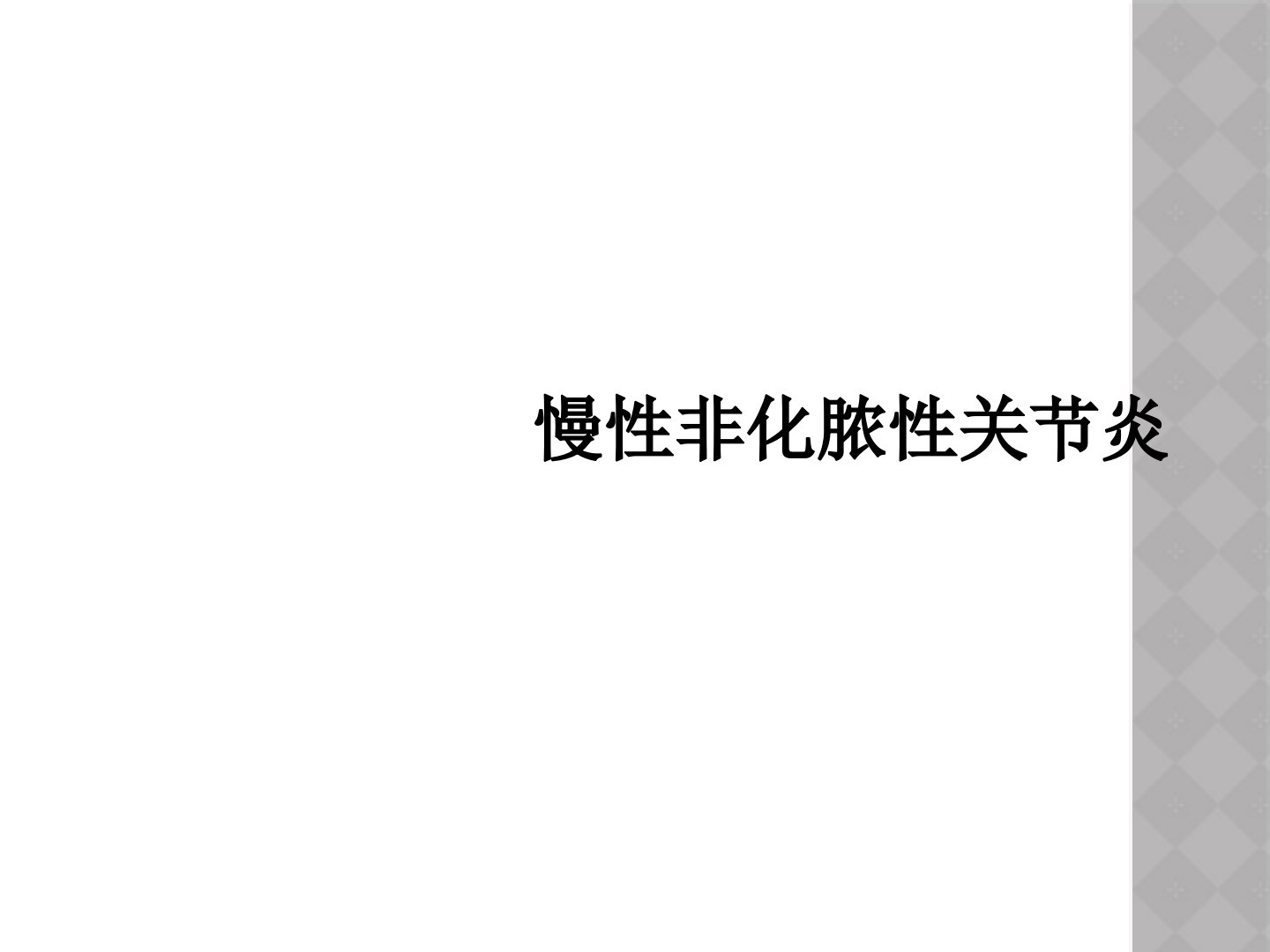 慢性非化脓性关节炎涵盖多种类型包括骨关节炎、类风湿性关节炎、强直性脊柱炎、痛风性关节炎等。其中骨关节炎发病机理为关节软骨变性磨损、脱落病因分原发性和继发性临床表现有疼痛、肿胀等影像学检查可用X线、CT、MRI治疗包括保守和手术;强直性脊柱炎病因有基因和感染因素病理为滑膜炎等青壮年男性多见有家族史实验室检查HLAB27阳性、血沉加快X线检查可见骶髂关节和脊柱等变化治疗用消炎镇痛药、激素等必要时手术;类风湿性关节炎是全身免疫性疾病关节病变机理为滑膜炎等好发于1655岁女性有全身症状实验室检查有血红蛋白降低等X线检查可见关节周围软组织肿胀等诊断有标准治疗用药物、手术和理疗;痛风病因是血尿酸升高发病机理为尿酸沉积等临床表现多样实验室检查血尿酸增高等X线检查可见软组织肿胀等治疗有饮食控制、药物和手术。