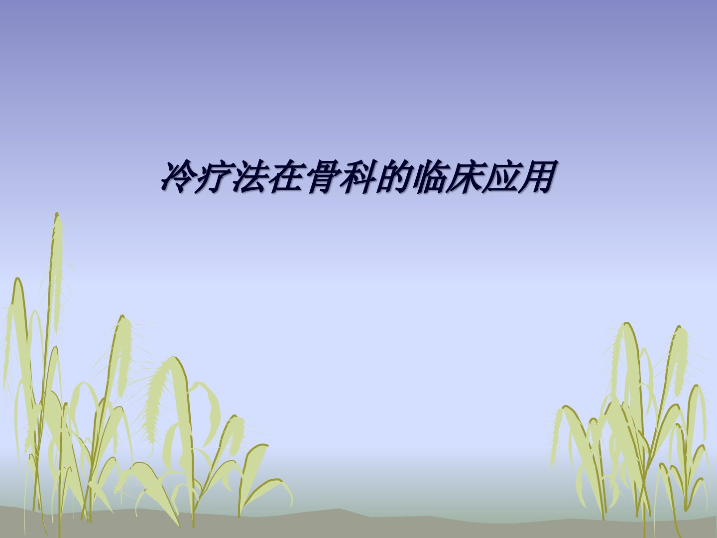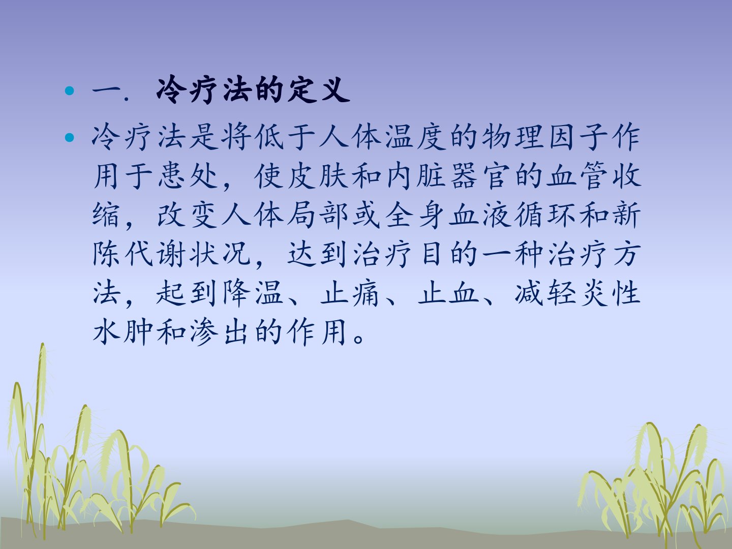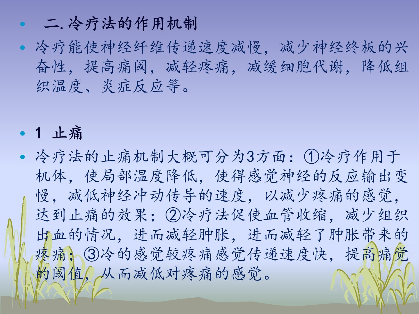 冷疗法在骨科的临床应用摘要冷疗法是将低于人体温度的物理因子作用于患处改变血液循环和新陈代谢状况起到降温、止痛等作用。其作用机制主要有三方面:一是使神经传递速度减慢提高痛阈减轻疼痛;二是减缓细胞代谢控制肿胀;三是降低温度减缓血流有利术后消肿和减少渗血。在骨科各类疾病康复中应用广泛对闭合性软组织损伤冷疗法在急性期有抗炎等作用持续冷疗疗效更优;骨折术后冰袋冷敷能减轻疼痛、减少出血量;关节置换术后可减轻肿胀等但对深静脉血栓形成的影响尚有争议;膝关节镜术后冷冻疗法效果肯定。临床常用冷疗方式有冰袋冰敷、冰水疗法、冰按摩、冷喷雾等。冷疗不良反应较少见主要是冻伤及周围神经麻痹绝对禁忌证包括雷诺病等患者相对禁忌证包括心血管疾病等患者。冷疗法在骨科临床作用显著但确切疗效未完全证实在冷疗时间、温度控制等方面存在争议有待进一步研究。