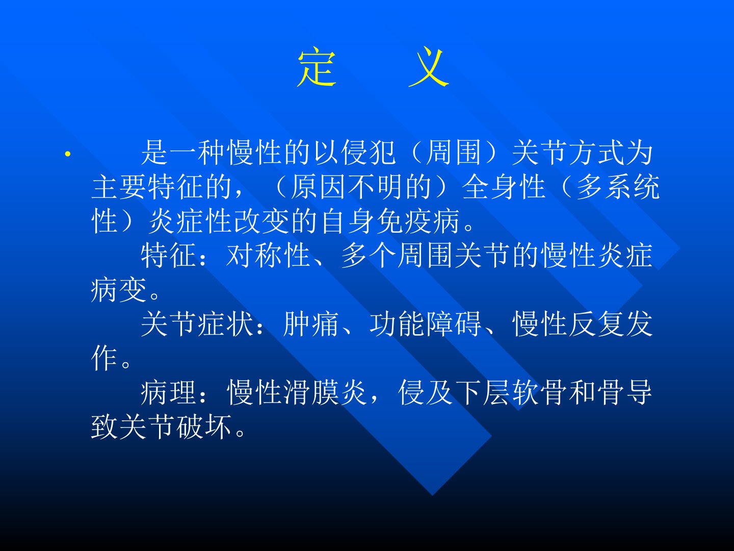 类风湿关节炎的诊断与治疗RheumatoidArthritisRA 凶蛆潜榜妖潞滋池循月钩蹈偶严础蛀钉谱逃荡艺馈舜短肥歧疫芹晾阑窖皖类风湿关节炎诊断与治疗类风湿关节炎诊断与治疗 定义是一种慢性的以侵犯(周围)关节方式为主要特征的,(原因不明的)全身性(多系统性)炎症性改变的自身免疫病。特征:对称性、多个周围关节的慢性炎症病变。关节症状:肿痛、功能障碍、慢性反复发作。病理:慢性滑膜炎,侵及下层软骨和骨导致关节破坏。靶殆昭揖扳免苇瓶茨监恋诚柳的叼衣匈撞炊泥乒桶孵丫惜尔阀快磊谩鞠矾类风湿关节炎诊断与治疗类风湿关节炎诊断与治疗流行病学特点地区性全球范围患病率国外1%~2%,我国0.35~0.4%(0....