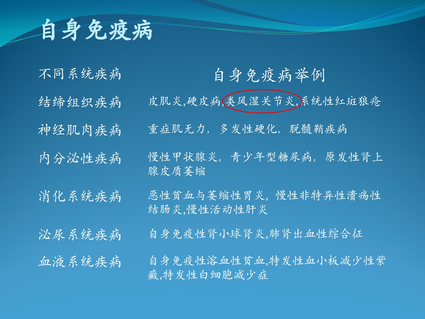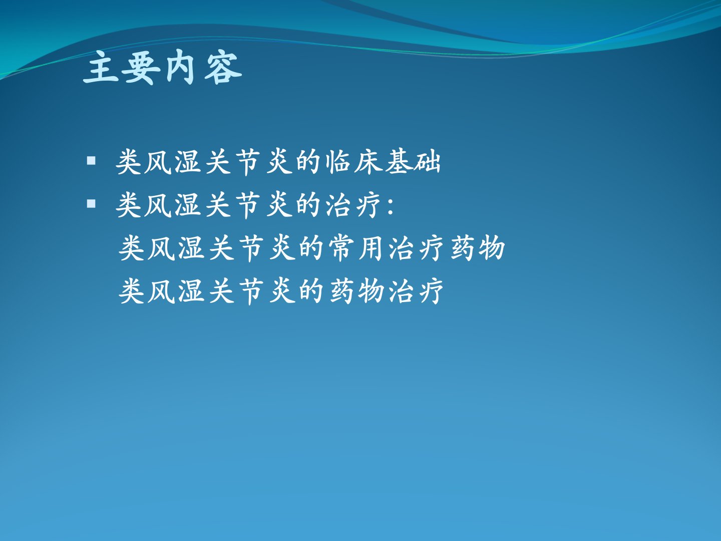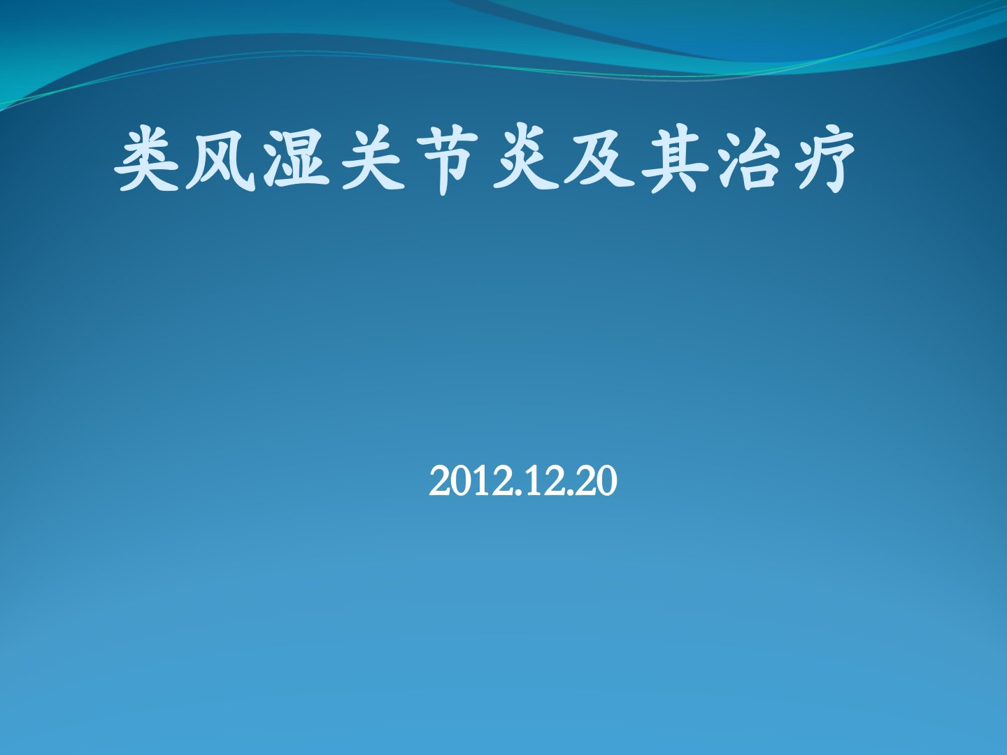 类风湿关节炎及其治疗2012.12.20自身免疫病主要内容类风湿关节炎的临床基础类风湿关节炎的治疗:类风湿关节炎的常用治疗药物类风湿关节炎的药物治疗类风湿关节炎的临床基础流行病学与疾病特点病因与发病机制临床表现实验室检查和辅助检查诊断标准严重危害人类健康的“5D”典型代表残疾-Disability痛苦-Discomfort死亡-Death经济损失-Dollarlost药物中毒-Drugtoxicity类风湿关节炎Rheumatoidarthritis,RA是一种常见的以慢性破坏性关节病变为特征的全身性自身免疫病发病率22-60/10万,可发生于任何年龄,发病高峰在30-50岁,女性多发。类风湿...