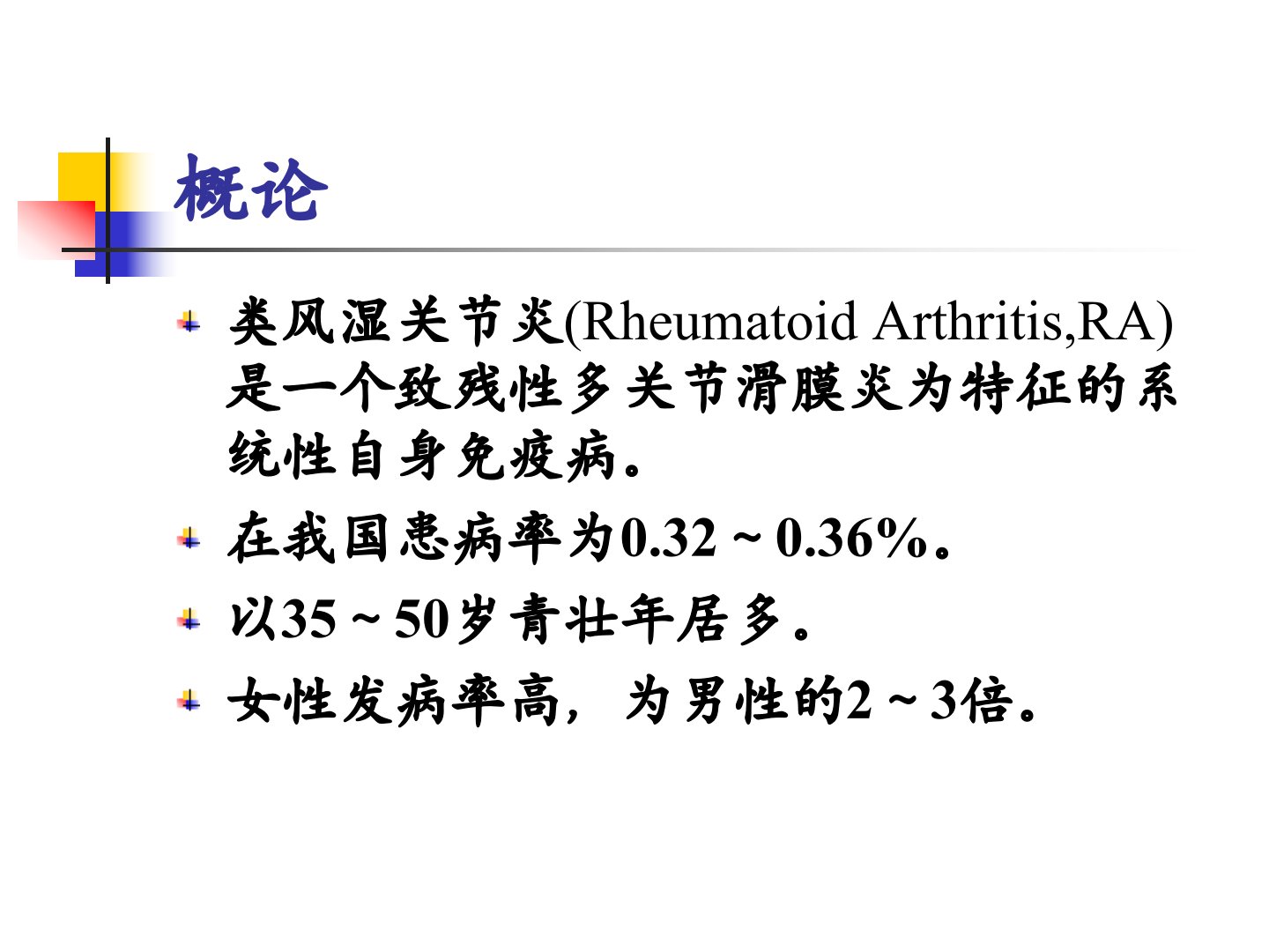 类风湿关节炎(RA)是致残性多关节滑膜炎的系统性自身免疫病我国患病率为0320363550岁青壮年居多女性发病率是男性的23倍。其临床特征为慢性、多关节、对称性、破坏性、外周关节为主的肿胀、疼痛、活动受限病理特征为慢性滑膜炎血清学特征为出现多种抗体。RA病因包括感染、遗传、内分泌因素如性激素、环境、疲劳、吸烟及精神因素等。RA基本病理改变是滑膜炎急性期为渗出性和细胞浸润慢性期为滑膜细胞增生等绒毛血管翳是造成关节破坏的病理基础。RA临床表现多样包括全身症状、关节表现、关节功能障碍及关节外表现。实验室和辅助检查包括自身抗体、血象、血沉、C反应蛋白、关节滑液、关节镜及针刺活检、影像学检查等。1987年ACR修订的RA分类标准不适合RA早期诊断2010年标准便于早期诊断包含了抗CCP抗体、超声及MRI敏感性提高特异性无下降。RA治疗目标为完全缓解治疗包括改变病情的抗风湿药物(DMARDs)、生物制剂治疗、小分子DMRDs、联合治疗、糖皮质激素的使用及手术治疗。RA预后大多病程迁延23年内致残率最高10可自行缓解影响预后的因素包括性别、发病年龄、起病时关节受累数等。