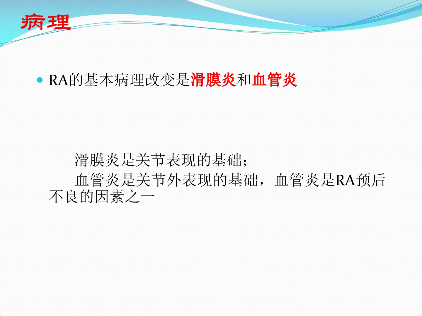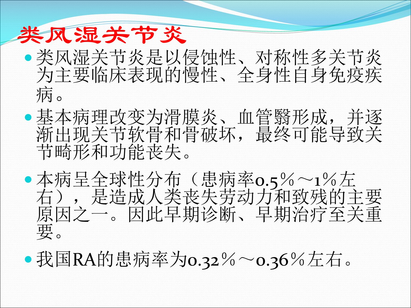 类风湿关节炎摘要类风湿关节炎(RA)是慢性全身性自身免疫病以侵蚀性、对称性多关节炎为主要表现可致关节畸形和功能丧失。全球患病率约05我国为032036早期诊断治疗至关重要。病理RA基本病理改变为滑膜炎和血管炎。急性期滑膜表现为渗出性和细胞浸润性慢性期滑膜肥厚形成绒毛样突起破坏关节。血管炎可累及全身各组织器官类风湿结节是其表现之一。病因RA病因和发病机制尚不完全清楚感染、遗传易感性、免疫紊乱等因素均可能参与发病。临床表现RA临床表现多样包括关节表现和关节外多系统受累表现。关节表现包括晨僵、关节痛与压痛、关节肿、关节畸形和功能障碍等。关节外表现包括类风湿结节、类风湿血管炎、肺、心脏、胃肠道、肾、神经系统、血液系统受累等。诊断RA诊断采用ACR分类标准包括关节受累情况、血清学检测、急性时相反应和病程等方面。同时需与骨关节炎等疾病进行鉴别诊断。治疗RA治疗包括一般治疗、药物治疗和外科治疗。药物治疗包括非甾体抗炎药、缓解病情抗风湿药、糖皮质激素、植物药和生物制剂等。外科治疗主要用于正规内科治疗无效或严重关节功能障碍者。随着对RA认识加深和生物制剂出现RA预后已明显改善。