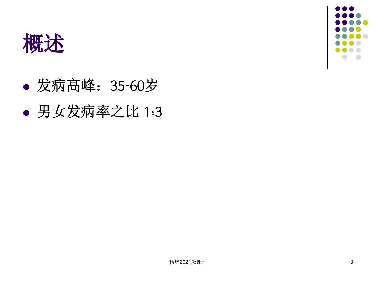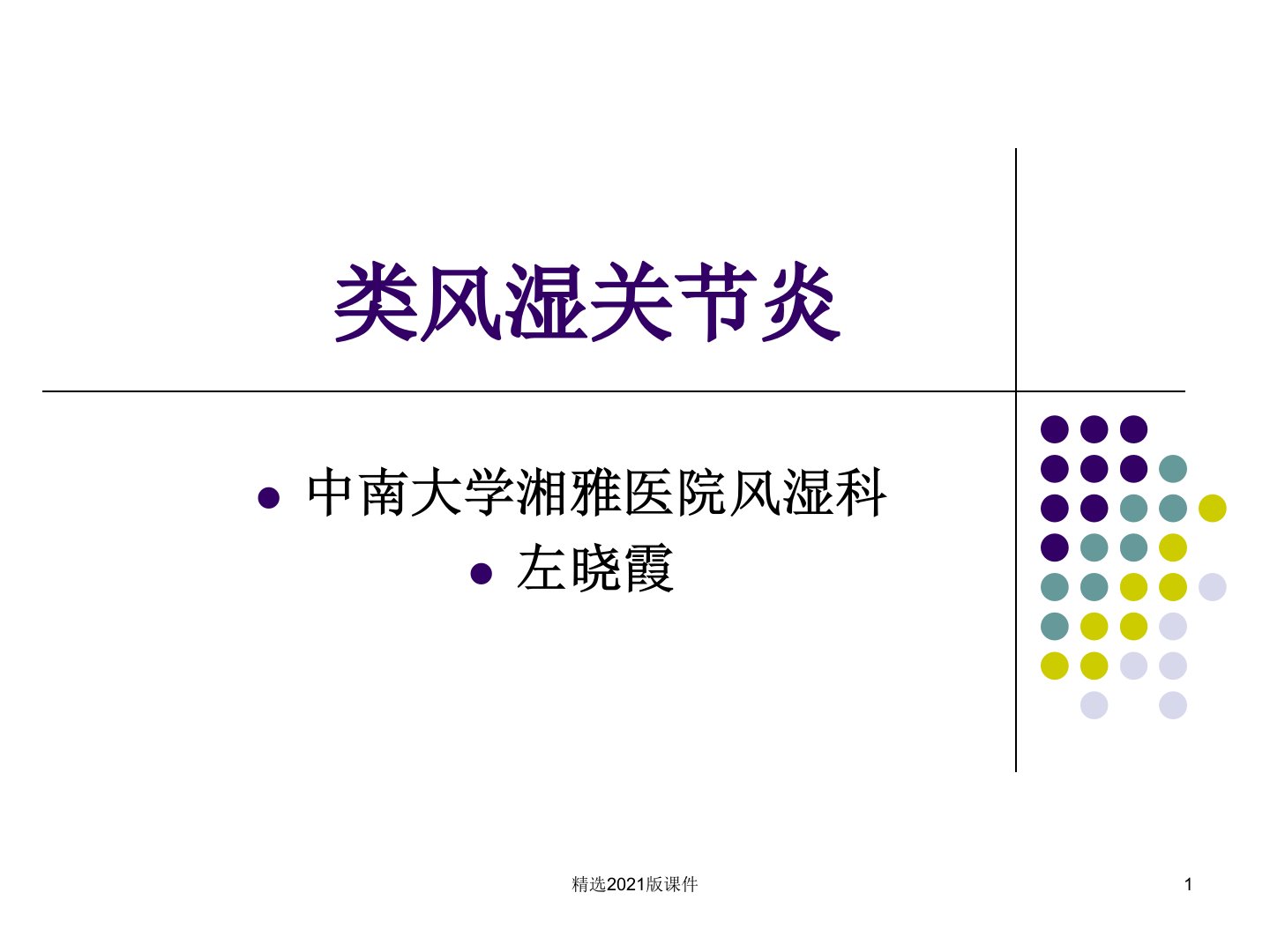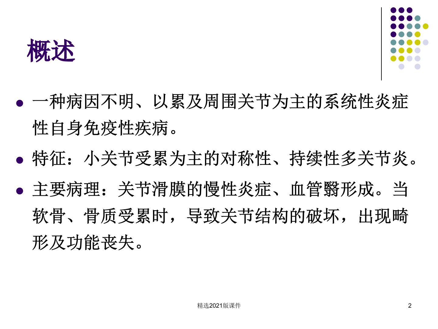 类风湿关节炎(RA)是一种病因不明的系统性炎症性自身免疫病以小关节受累为主特征为对称性、持续性多关节炎主要病理为关节滑膜慢性炎症和血管翳形成可导致关节结构破坏、畸形及功能丧失发病高峰为3560岁男女发病率之比为13。其病因包含遗传、感染、内分泌等因素临床表现有关节和关节外表现关节表现包括晨僵、疼痛肿胀、畸形、骨质疏松等关节外表现包括类风湿结节、类风湿血管炎以及循环系统、呼吸系统、胃肠道、血液系统、肾脏、神经系统、眼部等病变。实验室检查可见血常规、血沉、C反应蛋白、自身抗体等异常关节X线检查对诊断及病程分期有意义CT和MRI敏感性更高。RA诊断采用1987年ACR分类标准或2009年新标准需与骨关节炎、痛风、强直性脊柱炎等疾病鉴别。RA活动性判断依据疲劳程度、晨僵时间、炎性指标等不良预后指标包括全身症状、ESR、CRP过高等。治疗包括一般治疗、药物治疗、生物制剂和免疫性治疗、糖皮质激素、植物药制剂和外科治疗。