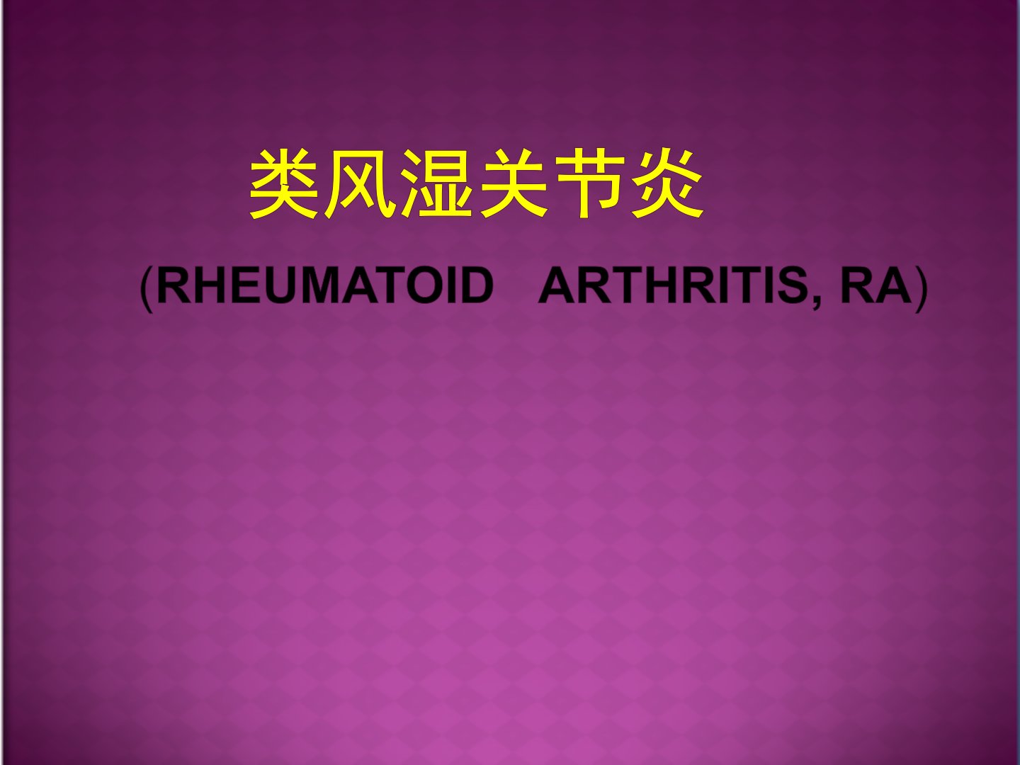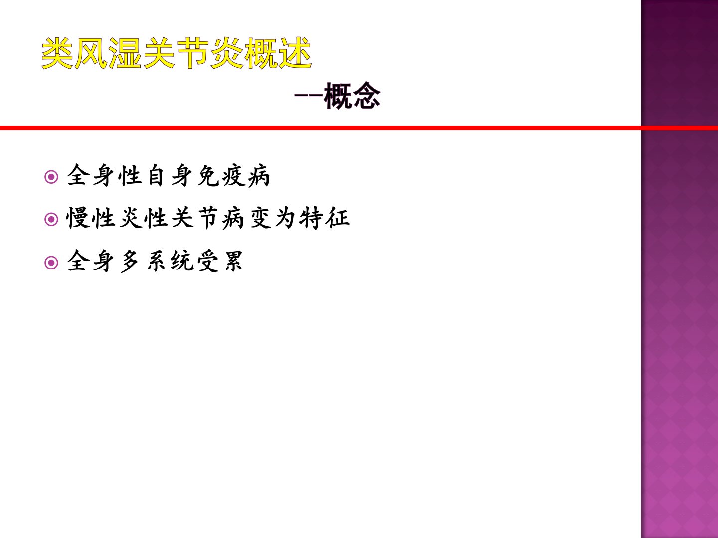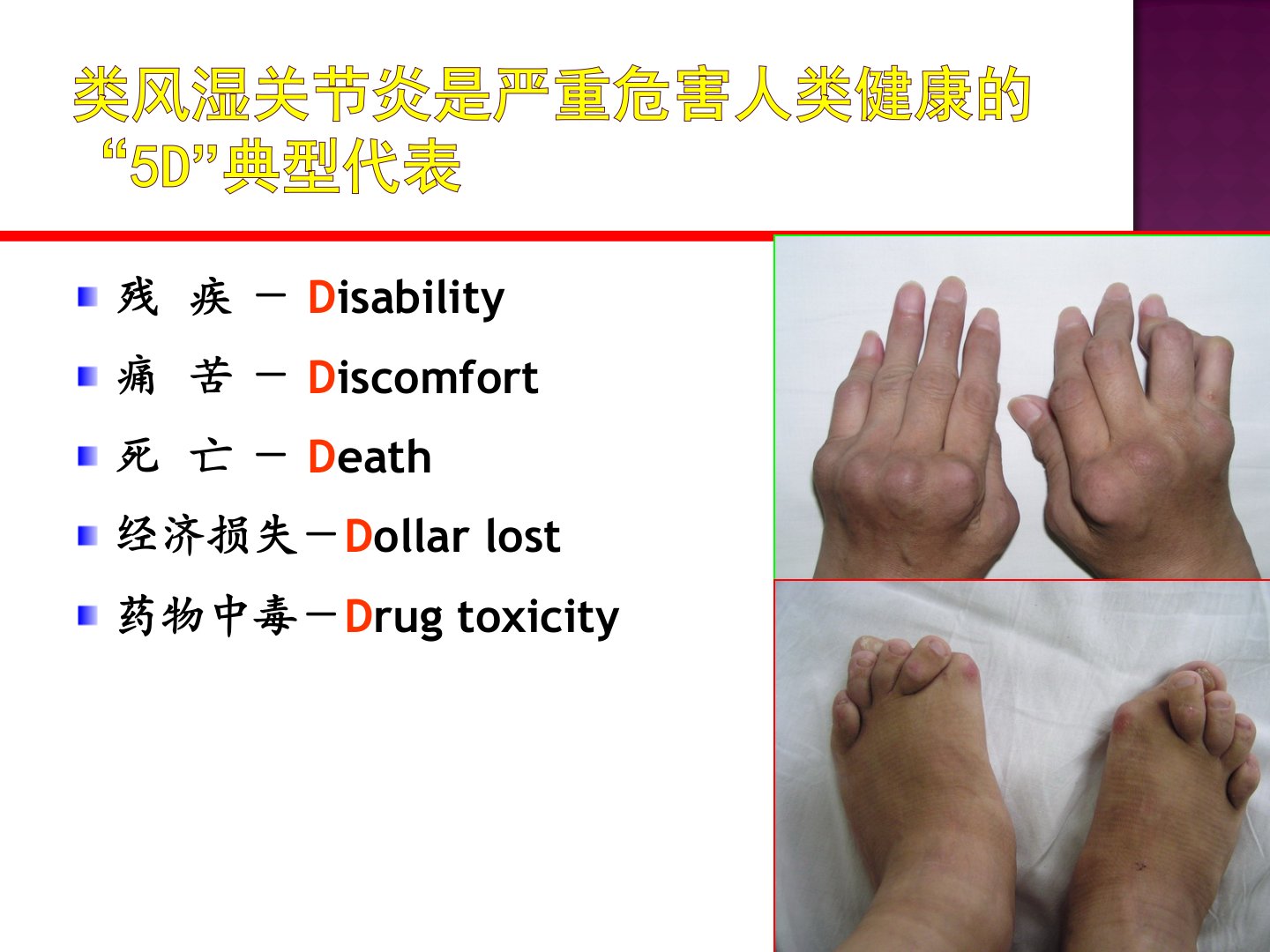 类风湿关节炎(RA)是全身性自身免疫病以慢性炎性关节病变为特征可导致全身多系统受累是严重危害人类健康的“5D”典型代表(残疾、痛苦、死亡、经济损失、药物中毒)。RA可累及所有人种3050岁为发病高峰男女之比13国内存在误诊误治现象。RA的病因及发病机制涉及抗原介导、多因素参与感染和自身免疫反应是发病和病情迁延的中心环节内分泌、遗传和环境因素使易感性增加。RA的病理特点为炎性滑膜血管翳形成主要细胞类型包括T淋巴细胞、巨噬细胞等。RA关节受累特点为小关节、多关节、对称性早期可单侧受累持续性6周以上伴晨僵1小时。RA的关节外表现包括全身表现、皮下结节、血管炎、脏器受累等。实验室检查包括自身抗体、炎症指标、常规检查及遗传标记等。RA诊断主要靠1987年ACR分类标准及2010年分类标准需与骨关节炎、强直性脊柱炎等鉴别。RA治疗原则包括功能活动与患者教育、早期治疗、联合治疗、个体化治疗。一线药物为非甾体抗炎药二线药物为慢作用抗风湿药起效缓慢但作用持久。激素在RA治疗中有一定作用但需掌握适应症不宜单用。顽固性RA可采用生物制剂、免疫净化、干细胞移植等治疗。预后方面大多数RA患者可以完全缓解前提是诊