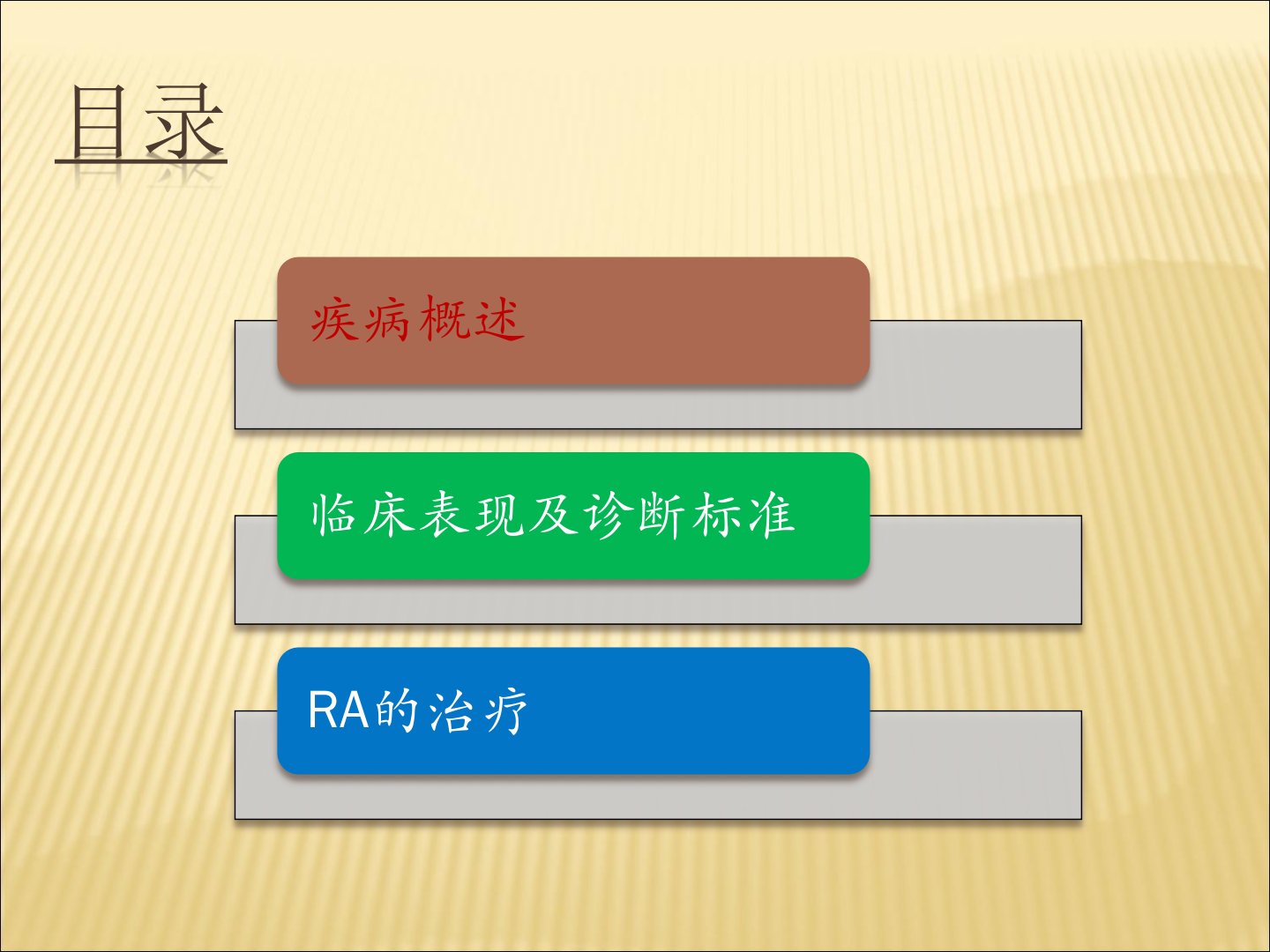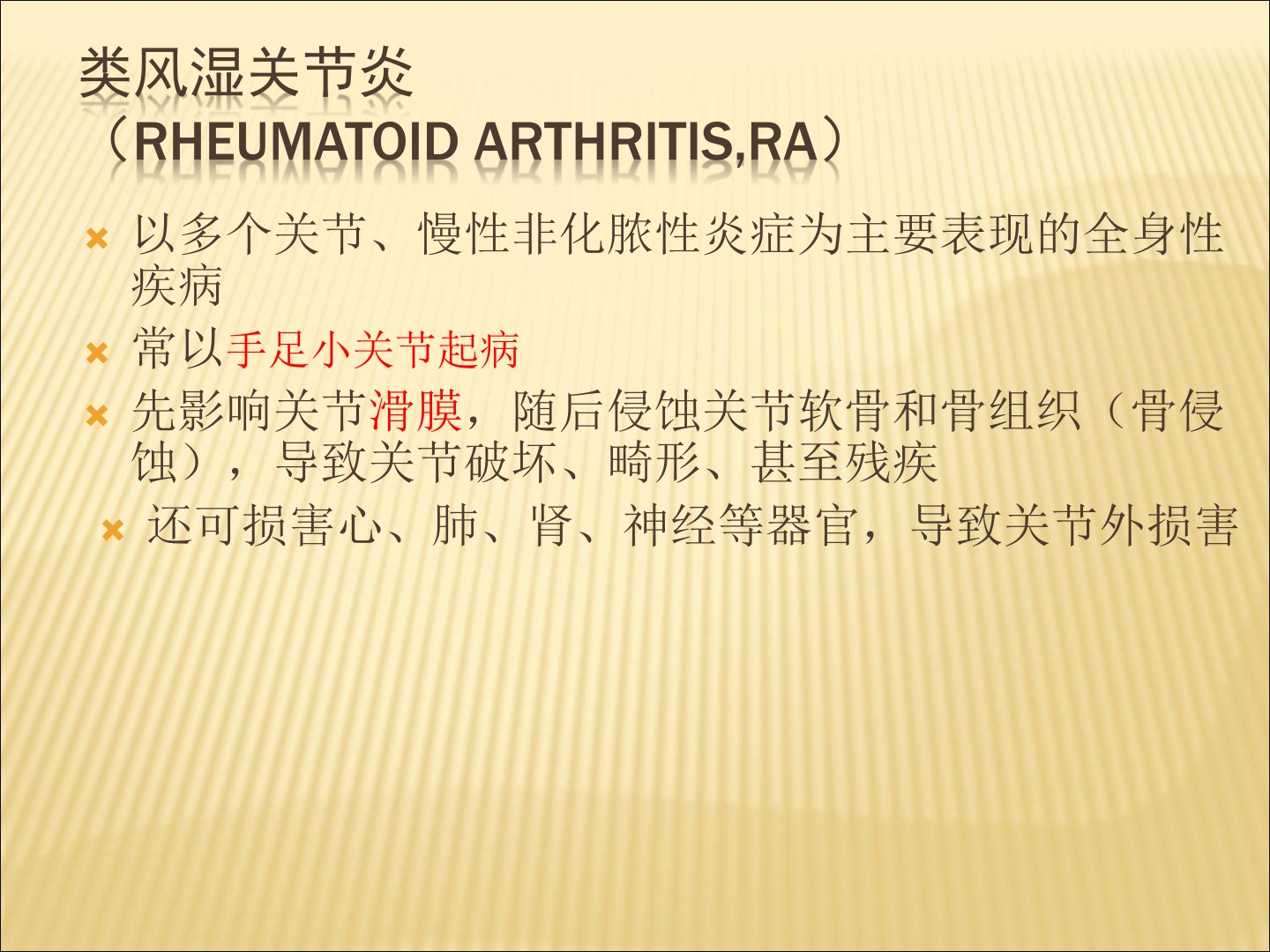 类风湿关节炎(RA)是全身性疾病以多个关节慢性非化脓性炎症为主常从手足小关节起病可致关节破坏、畸形、残疾还会损害心肺肾神经等器官。我国发病率03约500万患者女性多于男性以中年女性多见45岁为发病顶峰有遗传易感性病因未完全明确。临床表现有关节和关节外表现关节外表现包括类风湿结节、血管炎等。实验室检查可见血沉、C反应蛋白升高部分患者类风湿因子、抗CCP抗体阳性。1987年ACR和2010年ACREULAR有相关诊断标准。RA治疗策略包括早期诊断、达标治疗等首要目标是临床缓解早期病人应达到临床缓解长病程病人低疾病活动度是替代目标。治疗有非甾体抗炎药、糖皮质激素、改变病情药(DMARDs)、生物制剂等其中甲氨喋呤是RA治疗“金标准”但有一定副作用。