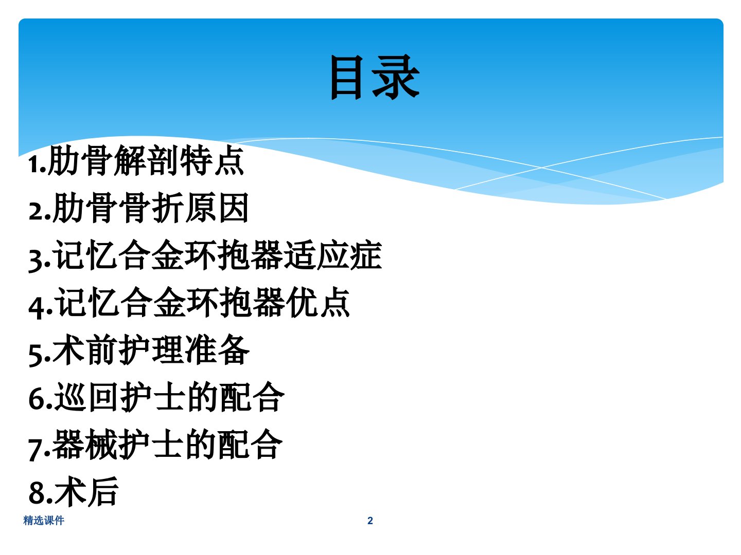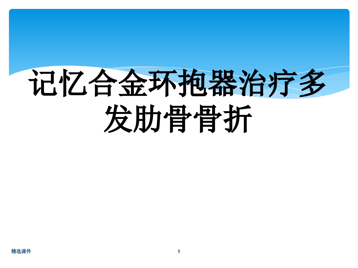 记忆合金环抱器治疗多发肋骨骨折课件摘要本课件聚焦记忆合金环抱器治疗多发肋骨骨折。首先介绍肋骨解剖特点12对肋骨左右对称第47肋最长最易骨折第1112肋前端游离不易骨折。肋骨骨折病因包括直接、间接、混合暴力及肌肉收缩。记忆合金环抱器内固定术适应症有:肋骨骨折合并胸内器官损伤需开胸手术、连枷胸、多发性骨折致胸廓严重变形、骨折明显错位伴剧痛等。其优点众多如可根据骨折情况选型固定牢靠且对血管神经损伤小无需完全剥离骨膜利于骨折愈合手术简单易掌握不影响胸部CT、MRI检查。术前护理准备包括术前访视、准备器械包等。巡回护士负责核对药物器械、引导患者、建立通路、协助手术等;器械护士检查器械、协助选择环抱器做好环抱器塑形、放置、固定等工作。术后根据骨折情况选择平卧或侧卧位完成清点止血等常规操作。
