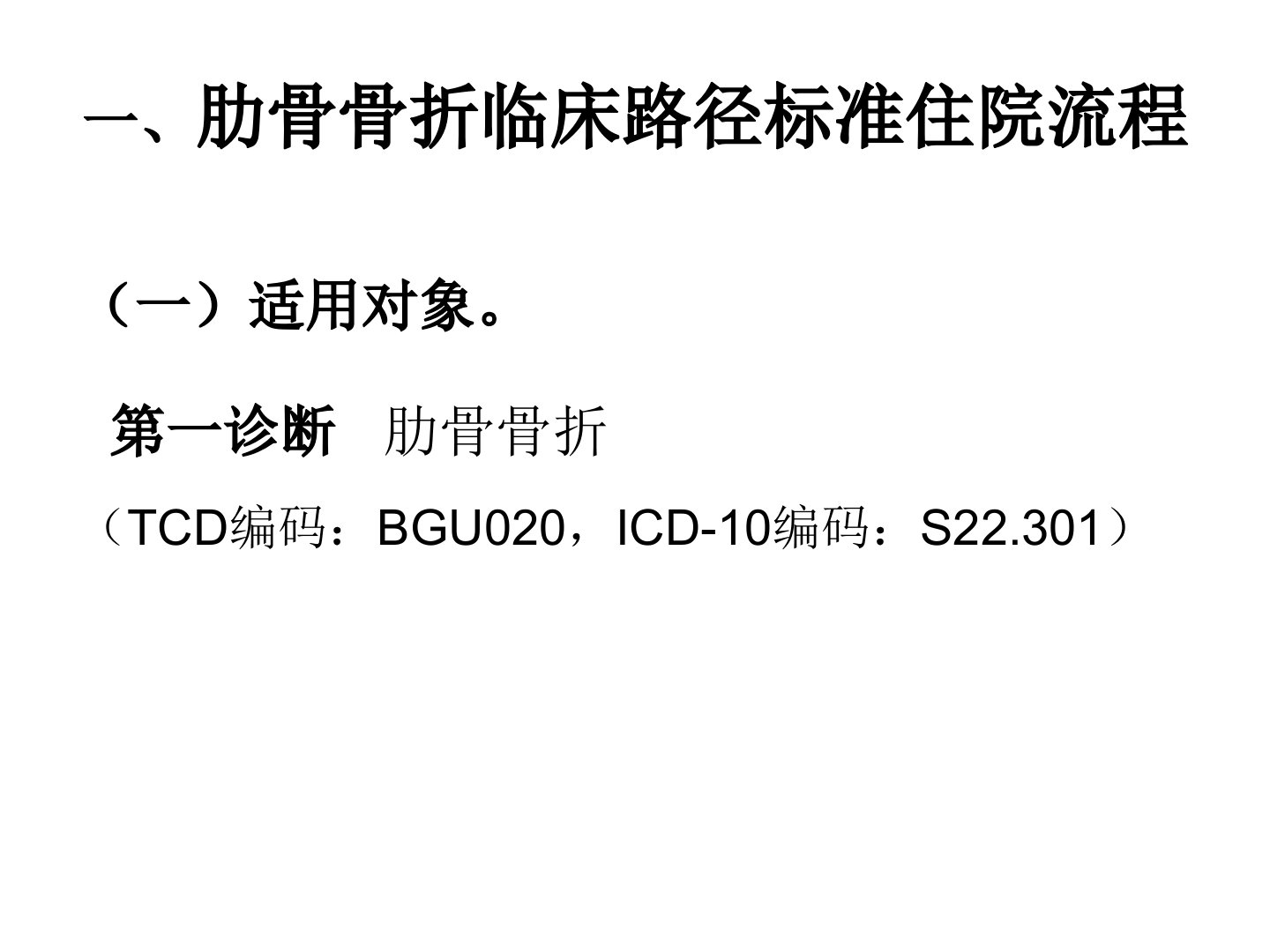 肋骨骨折临床路径摘要一、适用对象第一诊断为肋骨骨折的患者(TCD编码:BGU020ICD10编码:S22301)。二、诊断依据1疾病诊断:中医参照《中医病症诊断疗效标准(1995)》西医参照《外科学第8版》。2疾病分期:早期伤后23周内中期伤后48周晚期伤后8周以上。3分型:少数肋骨一处骨折、多数肋骨一处骨折、肋骨多处骨折。4证候诊断:血瘀气滞证、淤血凝滞证、肝肾不足证。三、治疗方案1选择依据:参照国家中医药管理局《肋骨骨折诊疗方案(试行)》患者适合并接受中、西医综合治疗。2标准住院日:15天。3治疗原则:有效止痛、呼吸管理、胸廓固定、肺部物理治疗、尽早下床活动。4治疗方法:包括药物治疗、呼吸管理、外固定治疗、手术治疗、辩证选择中药、针灸治疗、功能锻炼及护理调摄。四、出院标准胸部疼痛基本缓解X线或CT片复查肺挫伤及胸腔积气积血基本吸收。五、变异及原因分析包括病情严重需手术、合并其他疾病病情加重、发生药物反应、患者及家属意愿影响路径执行等情况。