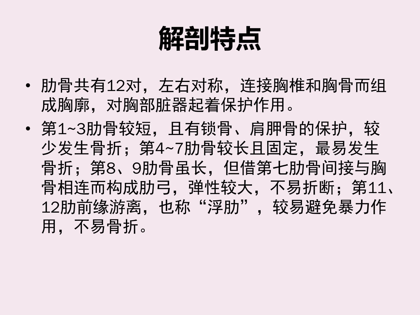 肋骨共12对左右对称第47肋较长且固定最易骨折。肋骨骨折多见于成年人暴力形式通常有四种:直接暴力骨折多横断或粉碎型易刺伤肺脏;间接暴力多造成斜形骨折;混合暴力常致多段骨折易造成胸内损伤;肌肉收缩偶发于体质弱、骨质疏松者。单纯性骨折有不全骨折、完全骨折多发性骨折有一骨双折、多肋骨折。肋骨骨折诊断要点包括伤后局部疼痛、肿胀等症状以及胸廓挤压试验阳性等体征影像学检查可明确骨折情况。肋骨骨折并发症包括气胸、血胸等严重时可危及生命。治疗原则为镇痛、清理呼吸道分泌物、固定胸廓、恢复胸壁功能和防治并发症具体方法包括口服、注射镇痛剂胸壁固定对于多根肋骨双折可采用肋骨切开内固定术、肋骨牵引术等合并气胸、血胸等并发症时需采取相应治疗措施。