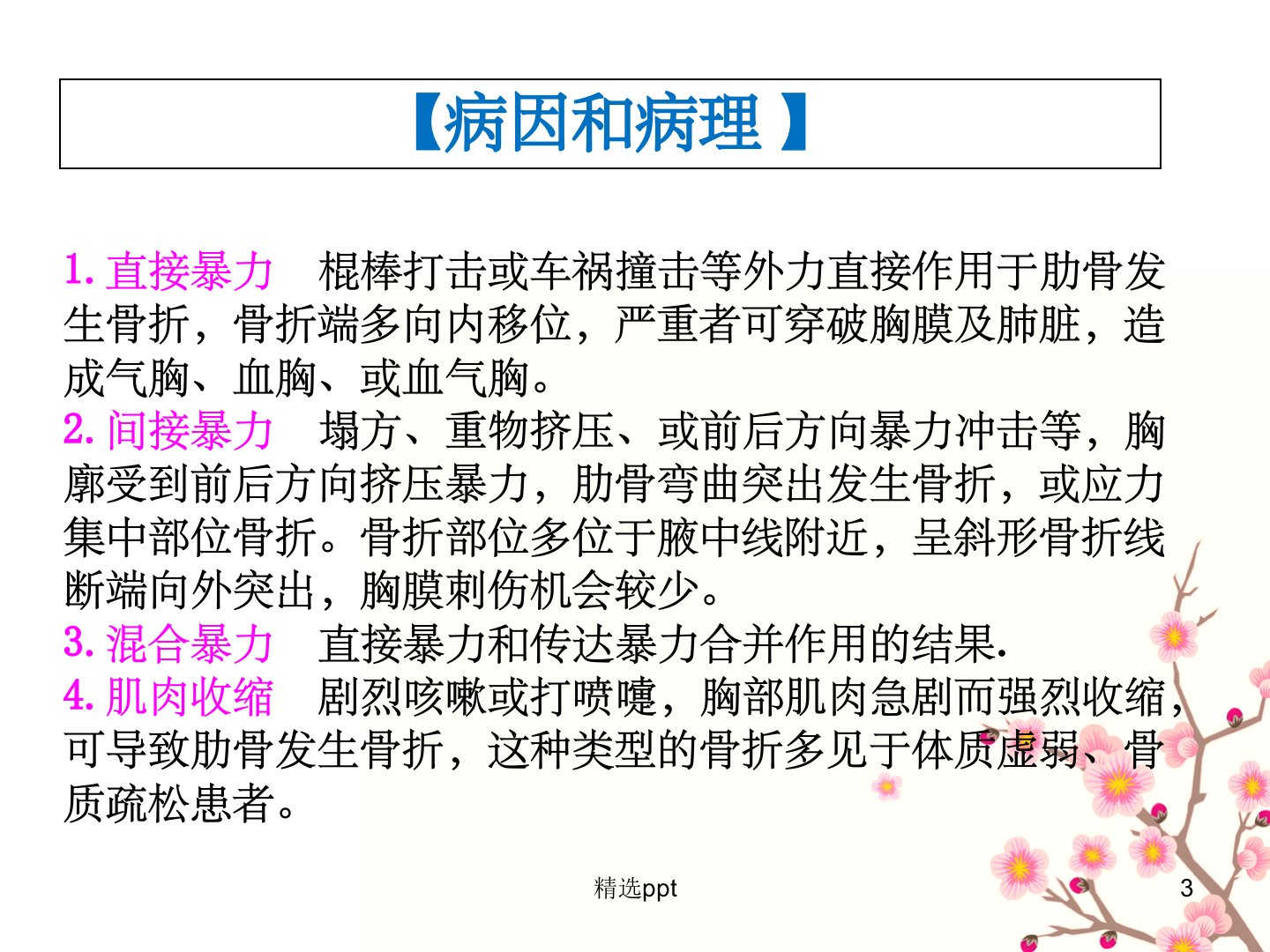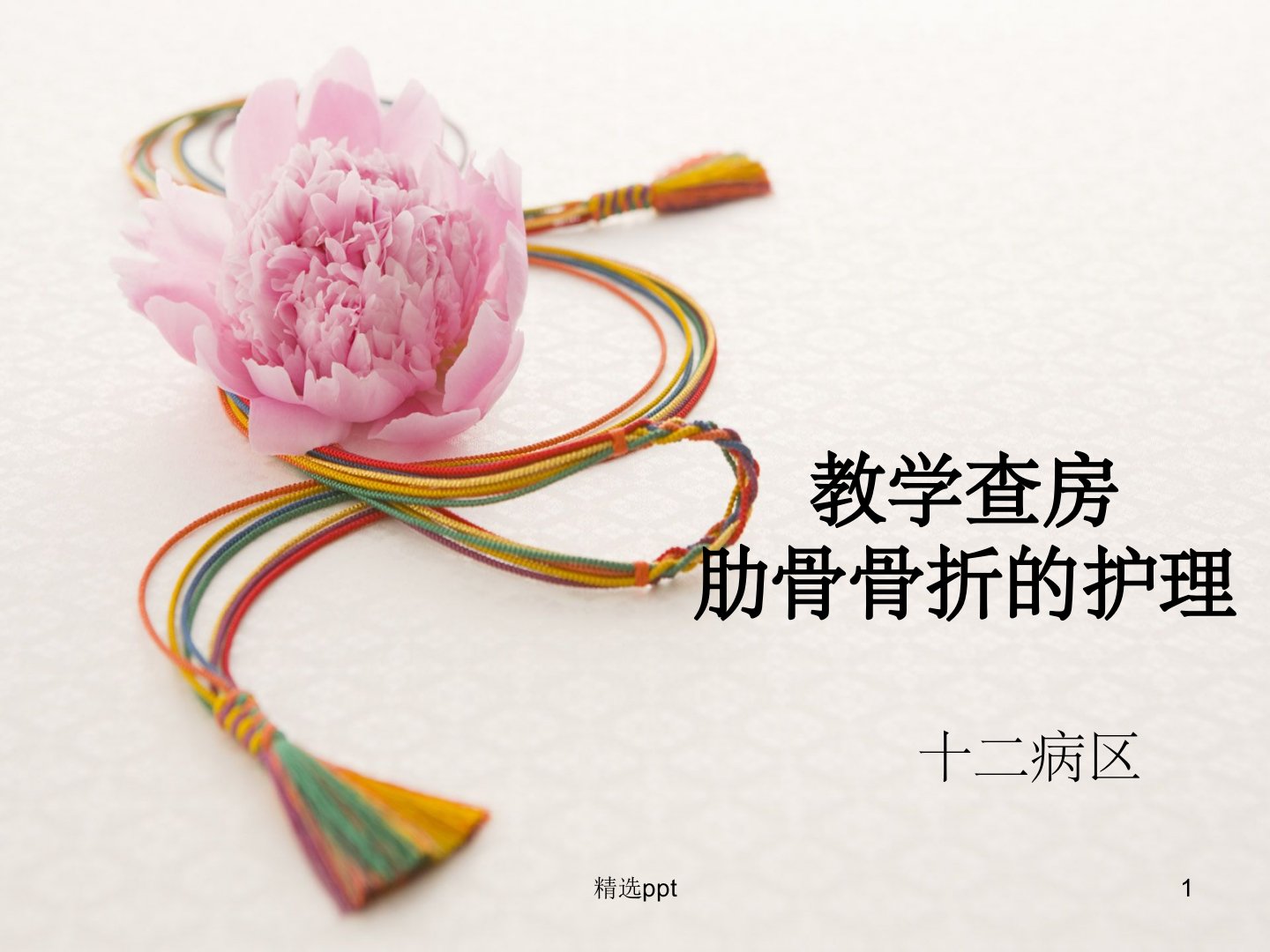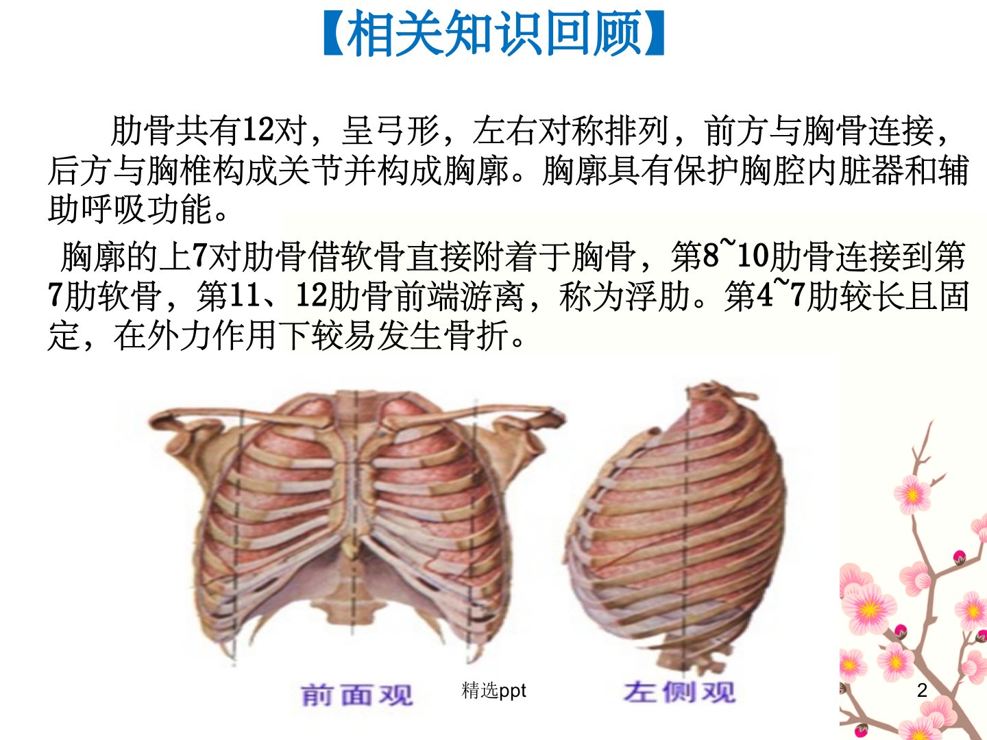 十二病区教学查房肋骨骨折的护理精选ppt【相关知识回顾】 肋骨共有12对,呈弓形,左右对称排列,前方与胸骨连接,后方与胸椎构成关节并构成胸廓。胸廓具有保护胸腔内脏器和辅助呼吸功能。胸廓的上7对肋骨借软骨直接附着于胸骨,第8~10肋骨连接到第7肋软骨,第11、12肋骨前端游离,称为浮肋。第4~7肋较长且固定,在外力作用下较易发生骨折。精选ppt【病因和病理】直接暴力棍棒打击或车祸撞击等外力直接作用于肋骨发生骨折,骨折端多向内移位,严重者可穿破胸膜及肺脏,造成气胸、血胸、或血气胸。间接暴力塌方、重物挤压、或前后方向暴力冲击等,胸廓受到前后方向挤压暴力,肋骨弯曲突出发生骨折,或应力集中部位骨折。骨...