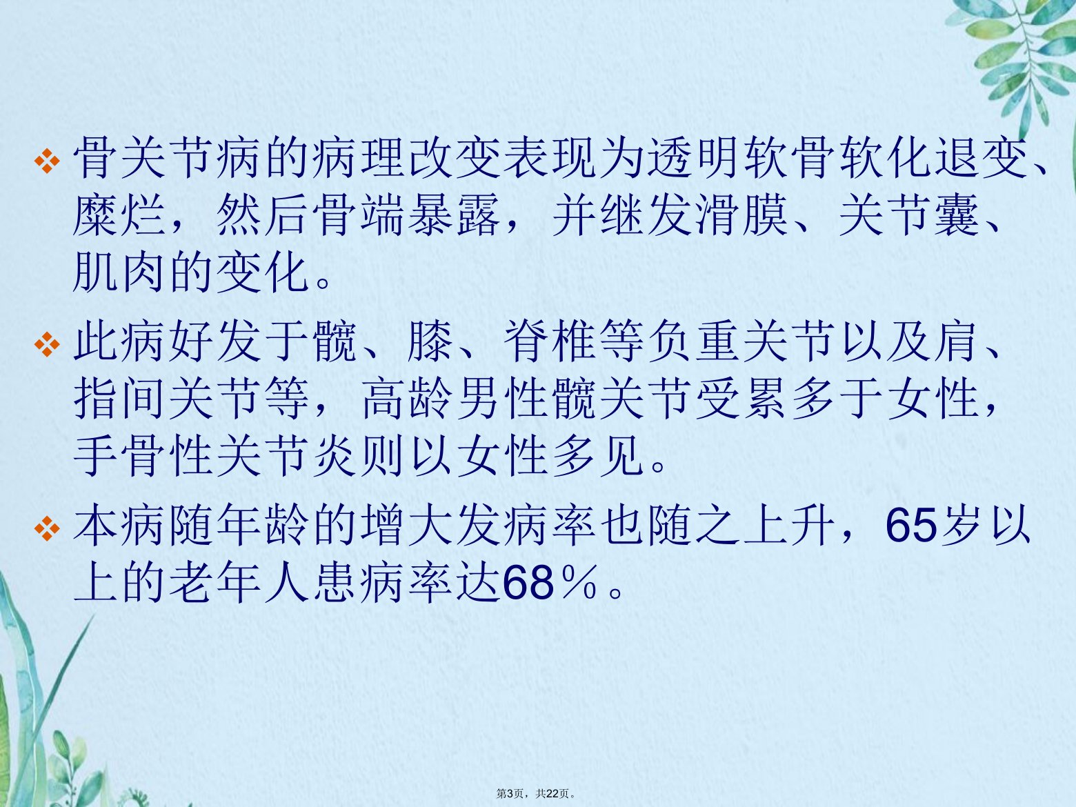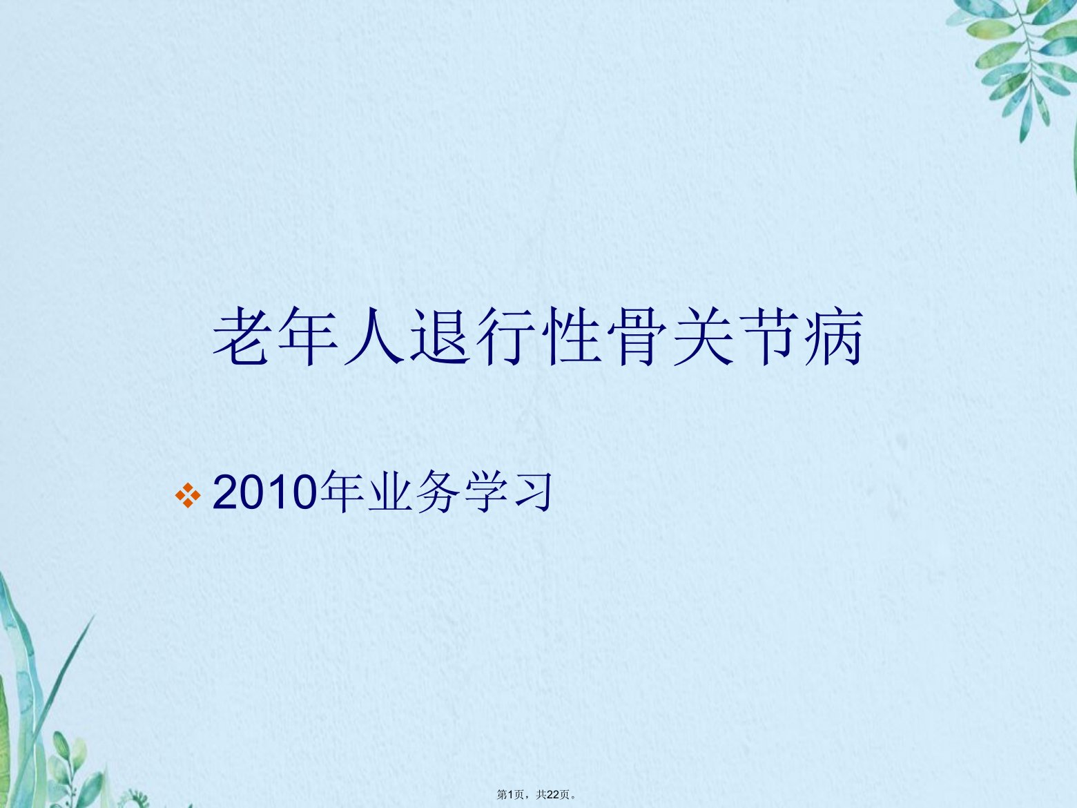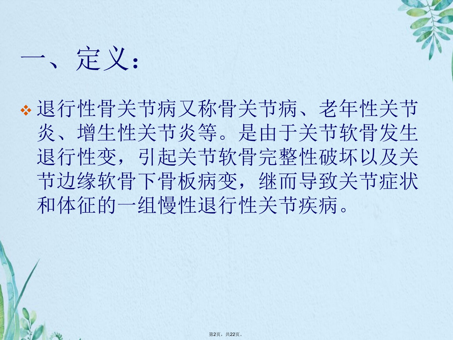 老年人退行性骨关节病业务学习摘要本文聚焦老年人退行性骨关节病。该病又称骨关节病等是关节软骨退行性变引发关节软骨完整性破坏及关节边缘软骨下骨板病变导致关节症状和体征的慢性退行性关节疾病。病理上透明软骨先软化退变、糜烂后骨端暴露继发滑膜等变化。好发于髋、膝等负重关节及肩、指间关节65岁以上老年人患病率达68。疾病分原发性和继发性前者与遗传、生理性老化、肥胖等因素有关后者常见于关节先天性畸形等。临床表现有关节疼痛、僵硬等开始为活动后酸痛后期休息也痛不同关节病变疼痛位置和症状有差异。辅助检查方面X线平片可见关节间隙狭窄等;CT对椎间盘病检查效果优;MRI能发现早期软骨病变。常见护理问题有慢性疼痛、躯体活动障碍等。护理措施包括减轻关节负重、进行功能锻炼、为老人安排有利环境等。健康指导涵盖知识讲解、关节保护、用药及心理指导。