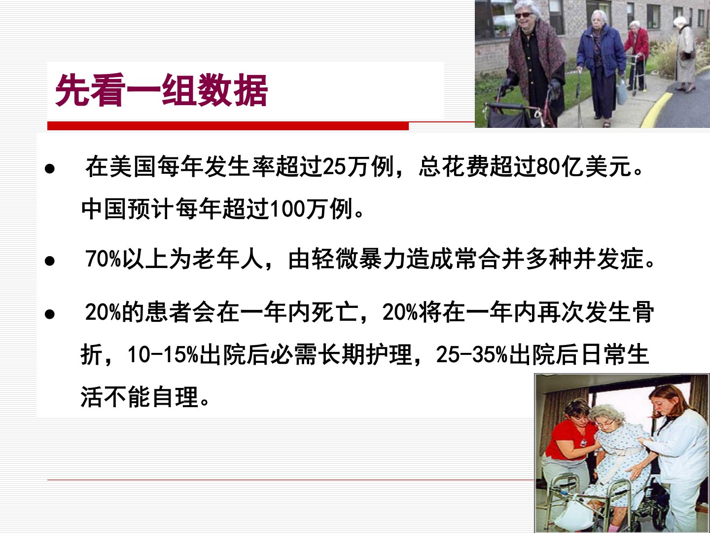 老年髋部骨折在老年群体中高发美国每年发生率超25万例中国预计超100万例70岁以上老人居多常由轻微暴力造成且合并多种并发症20患者一年内死亡20会再次骨折部分出院后需长期护理或生活不能自理。老年髋部骨折包括股骨颈骨折、股骨转子间骨折危险因素有骨质疏松、内分泌紊乱、运动功能障碍等。目前治疗趋势是早期手术和活动围术期评估与处理极为重要手术时机和方式选择应个性化。治疗前需对心血管、呼吸等系统及营养状况、精神状态等进行评估。治疗有保守和手术两种保守治疗需专业护理但并发症多;手术治疗应尽早伤后2448小时内手术并发症及死亡率低手术方式多样需根据骨折类型和患者情况选择。此外围术期需做好护理这是预防再次骨折、治疗骨质疏松的最佳时机。