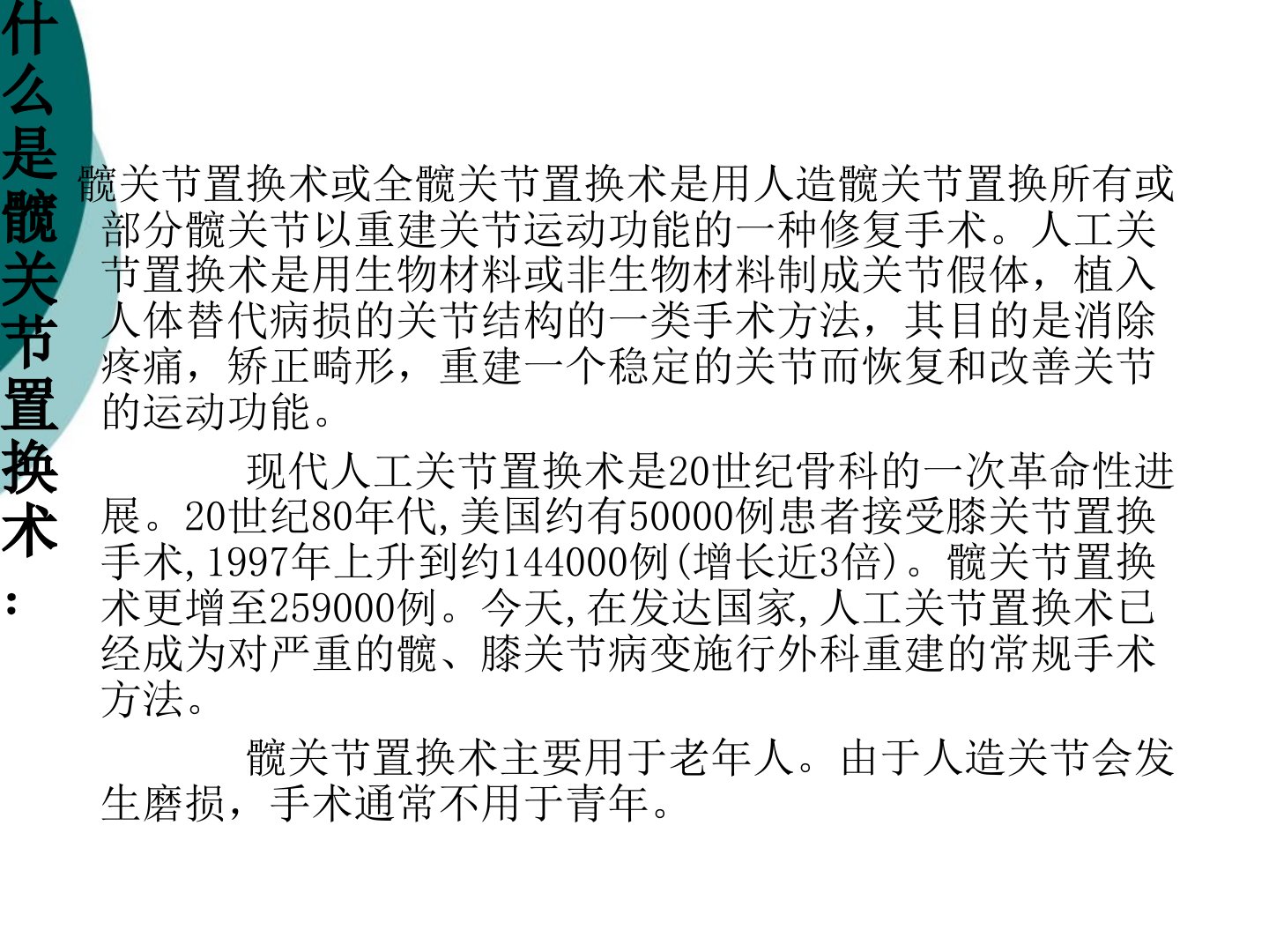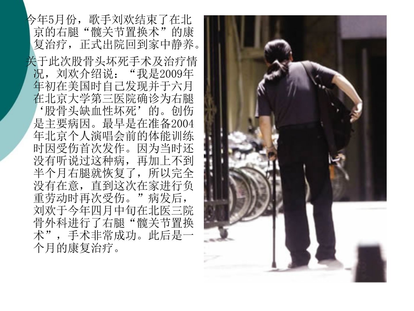今年5月歌手刘欢结束右腿“髋关节置换术”的康复治疗出院。他于2009年确诊为右腿股骨头缺血性坏死创伤是主要病因2004年首次发作但未在意直至此次负重劳动时再次受伤。今年4月中旬刘欢进行了髋关节置换术手术成功术后进行了为期一个月的康复治疗。髋关节置换术是用生物或非生物材料制成关节假体植入人体替代病损的关节结构以重建关节运动功能。它主要用于老年人因为人造关节会发生磨损手术通常不用于青年。髋关节常见疾病包括髋关节骨折、脱位等。髋关节置换术的术前准备包括心理准备和生理准备。术后家庭护理需注意少爬楼梯、避免摔倒、使用升降马桶等。康复训练早期平卧锻炼对促进患肢血运防止下肢静脉栓塞形成起着十分重要的作用同时对下肢关节功能恢复也非常关键。住院期间康复训练包括体位摆放、理疗、运动疗法等。出院计划要求病人出院后具备生活自理能力无术后早期并发症迹象掌握康复计划。术后还需注意预防神经损伤和下肢静脉血栓形成等并发症。