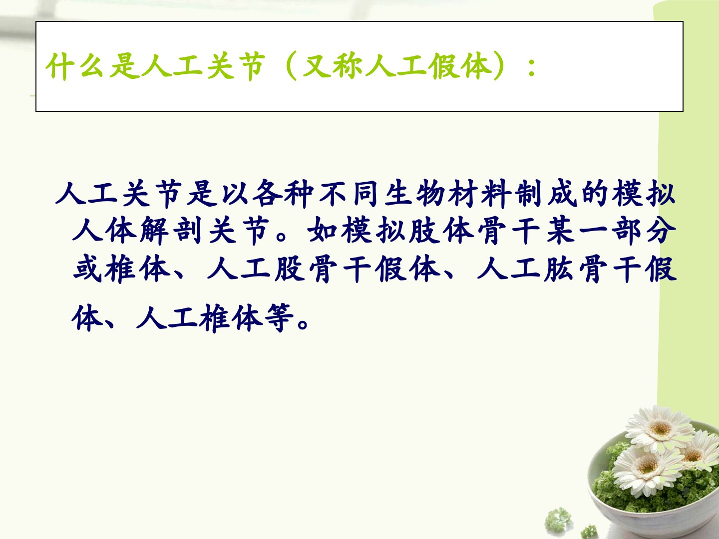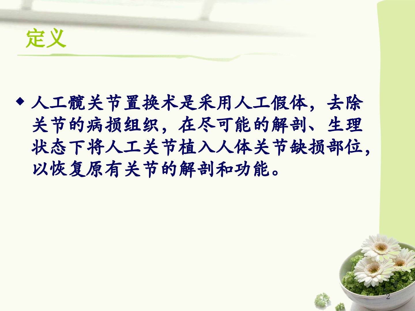 人工髋关节置换术是用人工假体替换病损关节恢复其功能。人工关节以生物材料模拟人体关节制成。该手术适应症包括骨折、坏死、关节炎等但急性炎症、神经性病变、骨骼未成熟等患者不宜进行。术后护理关键:保持患肢外展位防脱位;患肢置于髋关节外展1030度、屈曲1015度中立位防过度屈伸外旋内收;护理负压引流管保持通畅观察引流液;针对沟通障碍、焦虑、组织灌注量不足、髋关节脱位、下肢深静脉血栓形成、感染、疼痛、移动障碍、知识缺乏等护理问题采取相应措施。术后康复训练分阶段进行从减轻症状到恢复负重能力。出院后患者需注意饮食、体位避免增加关节负荷的活动预防感染避免高冲击性运动延长假体使用寿命并遵医嘱定期复诊。