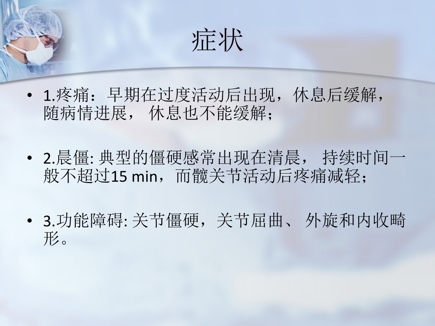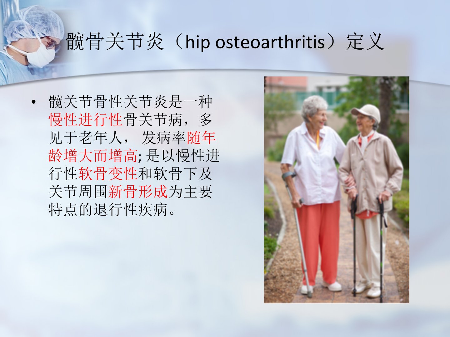 髋关节骨性关节炎是老年人常见的慢性进行性骨关节病以软骨变性和新骨形成为主要特点。症状包括疼痛、晨僵和功能障碍早期活动后疼痛、休息缓解晚期休息亦不能缓解且伴有关节僵硬和畸形。体征上晚期关节压痛明显内旋时疼痛加剧。诊断依据2007年骨关节炎诊治指南包括近1个月反复髋关节疼痛、红细胞沉降率升高、X线片示骨赘形成和髋关节间隙变窄等标准。治疗目的在于减轻疼痛、矫正畸形、改善功能。方式包括非药物治疗、药物治疗、手术治疗及健康教育。药物治疗分控制症状和改善病情两类透明质酸钠和糖皮质激素可关节腔注射氨基葡萄糖和双醋瑞因可修复和维护软骨。手术治疗包括保髋手术和髋关节重建术如关节镜下手术、截骨术、髋关节融合术和置换术等。