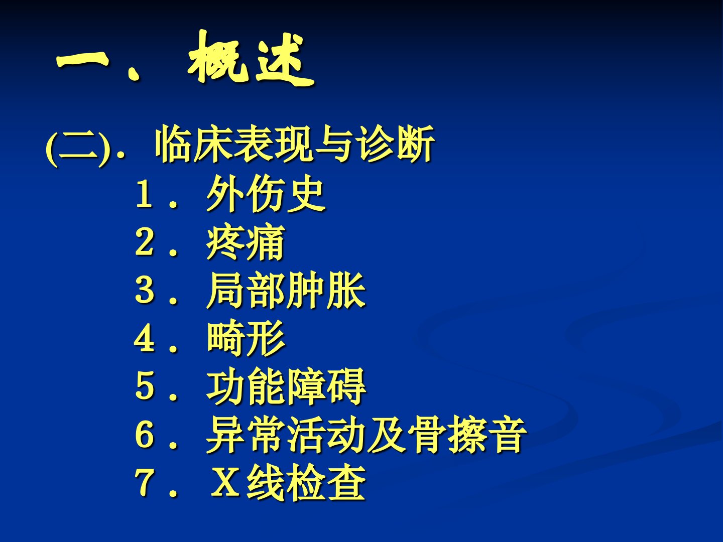 骨折指骨或骨小梁的完整性和连续性断离其康复涉及多方面。临床表现包括外伤史、疼痛、肿胀、畸形、功能障碍、异常活动及骨擦音需通过X线检查诊断。临床治疗包括整复、固定和康复训练。康复评定涉及关节活动范围、肌力、肢体围径和长度、感觉功能及骨折愈合评定。治疗原则为保持骨折良好对位对线恢复和增强肢体功能循序渐进地进行治疗且需在专业医务人员指导下进行充分发挥患者的主观能动性。康复方法包括早期消除肿胀、缓解疼痛进行主动运动和物理治疗;后期消除残肿、软化纤维组织增加肌力和关节活动度根据肌力等级采用不同恢复方法。此外还介绍了上肢和下肢不同部位骨折的康复要点。
