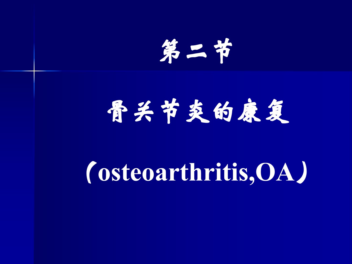 第二节聚焦骨关节炎(OA)的康复。骨关节炎是因多种因素导致关节软骨纤维化、皲裂、溃疡、脱失而引发的关节疾病有功能障碍等临床表现。康复方面首先进行康复评定涵盖感觉功能(如疼痛)、运动功能(包括关节活动度、肌力、耐力、2m步行时间、握力测定)、平衡功能、日常生活活动及社会参与能力的评定。治疗上物理治疗有物理因子治疗和运动治疗;作业治疗注重能量节约与关节保护;还可借助康复辅具必要时进行药物治疗和手术治疗。对于膝关节要避免关节囊与腘绳肌挛缩保持关节伸直避免垫枕可进行肌肉等长收缩。