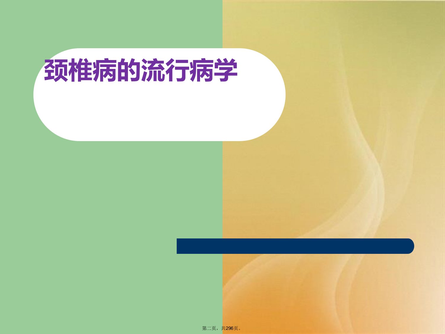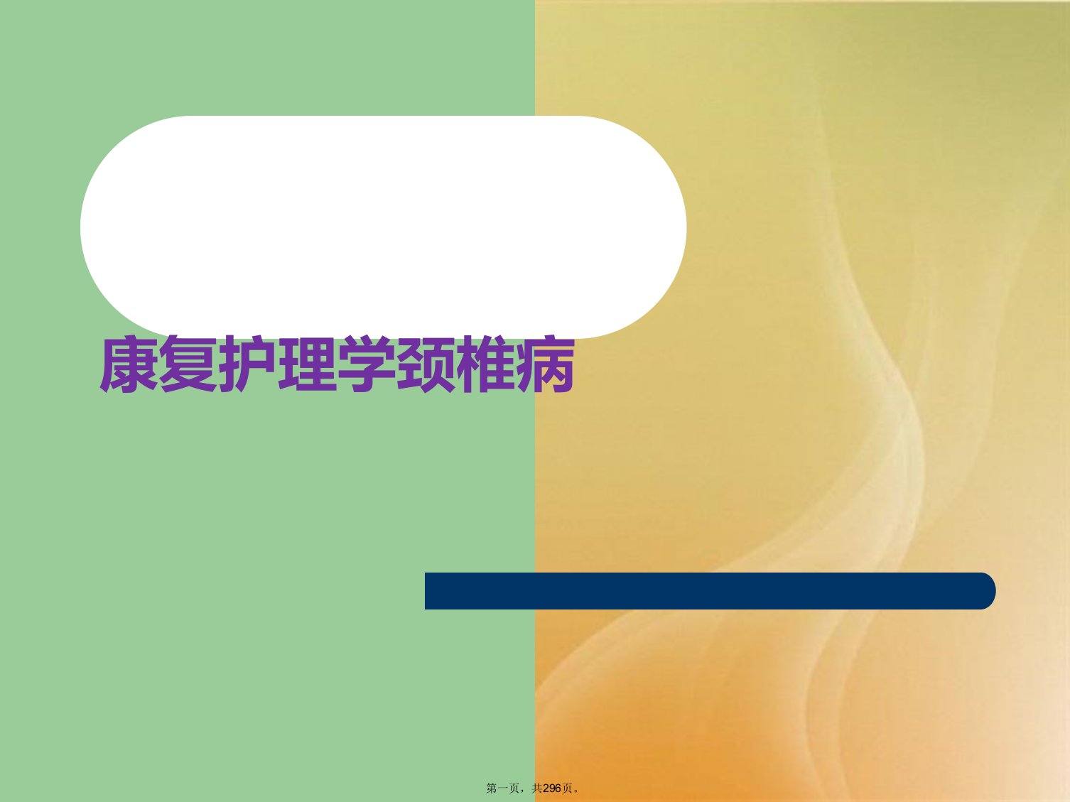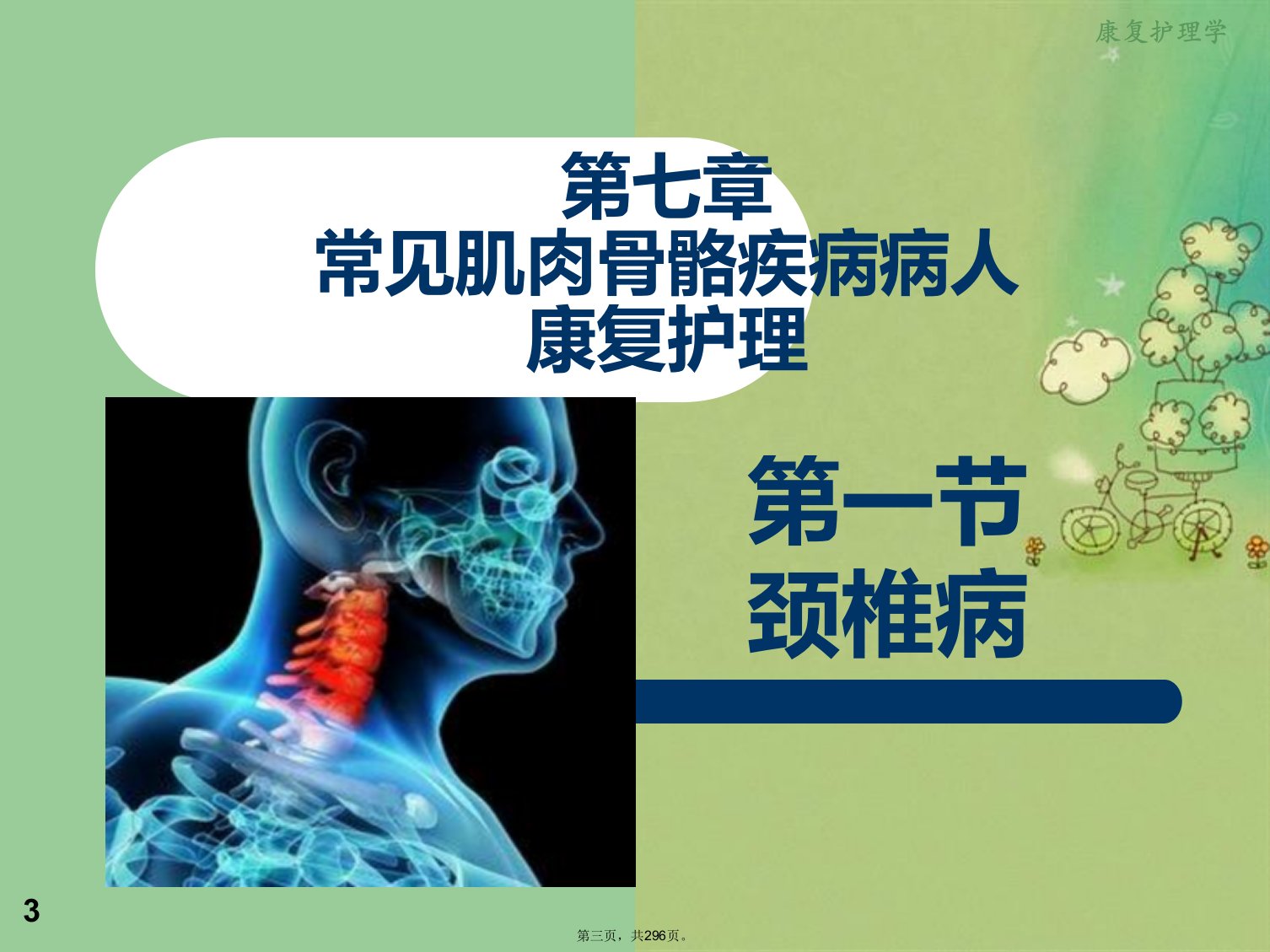 康复护理学颈椎病第一页,共296页。第二页,共296页。第七章常见肌肉骨骼疾病病人康复护理康复护理学第一节颈椎病第三页,共296页。●识记定义、颈椎病的分型、临床表现●熟悉主要功能障碍、康复护理评估、康复护理原则与目标●应用康复护理措施、康复护理指导康复护理学教学目标第四页,共296页。颈椎病的定义是颈椎椎间盘组织退行性改变及其继发病理改变累及周围组织结构(脊髓、神经根、椎动脉、交感神经等),并出现相应的临床表现。康复护理学一、概述第五页,共296页。第六页,共296页。颈椎病的定义颈椎椎间盘组织退行性改变及其继发病理改变累及周围组织结构(脊髓、神经根、椎动脉、交感神经等),并出现相应的临床表...