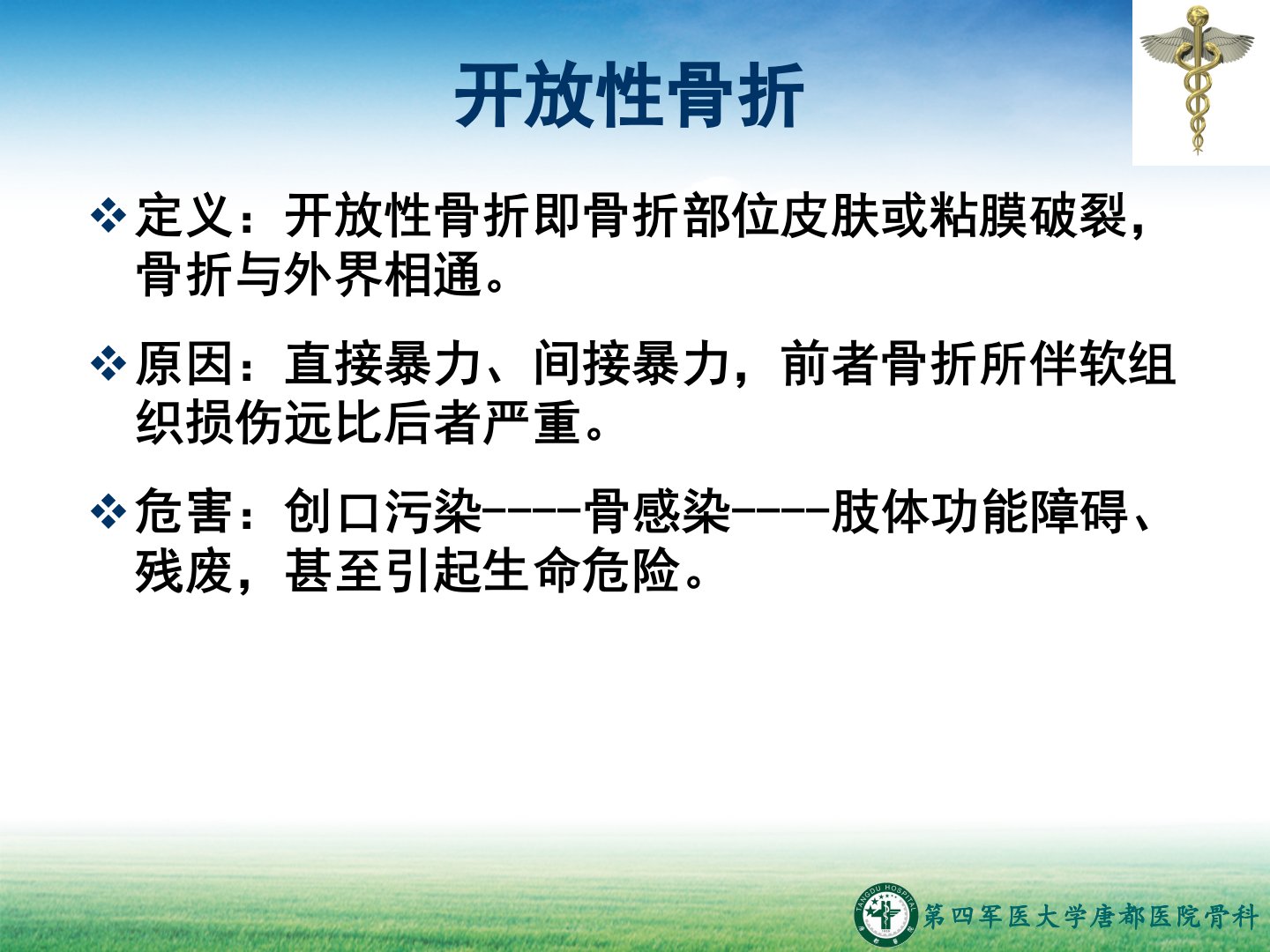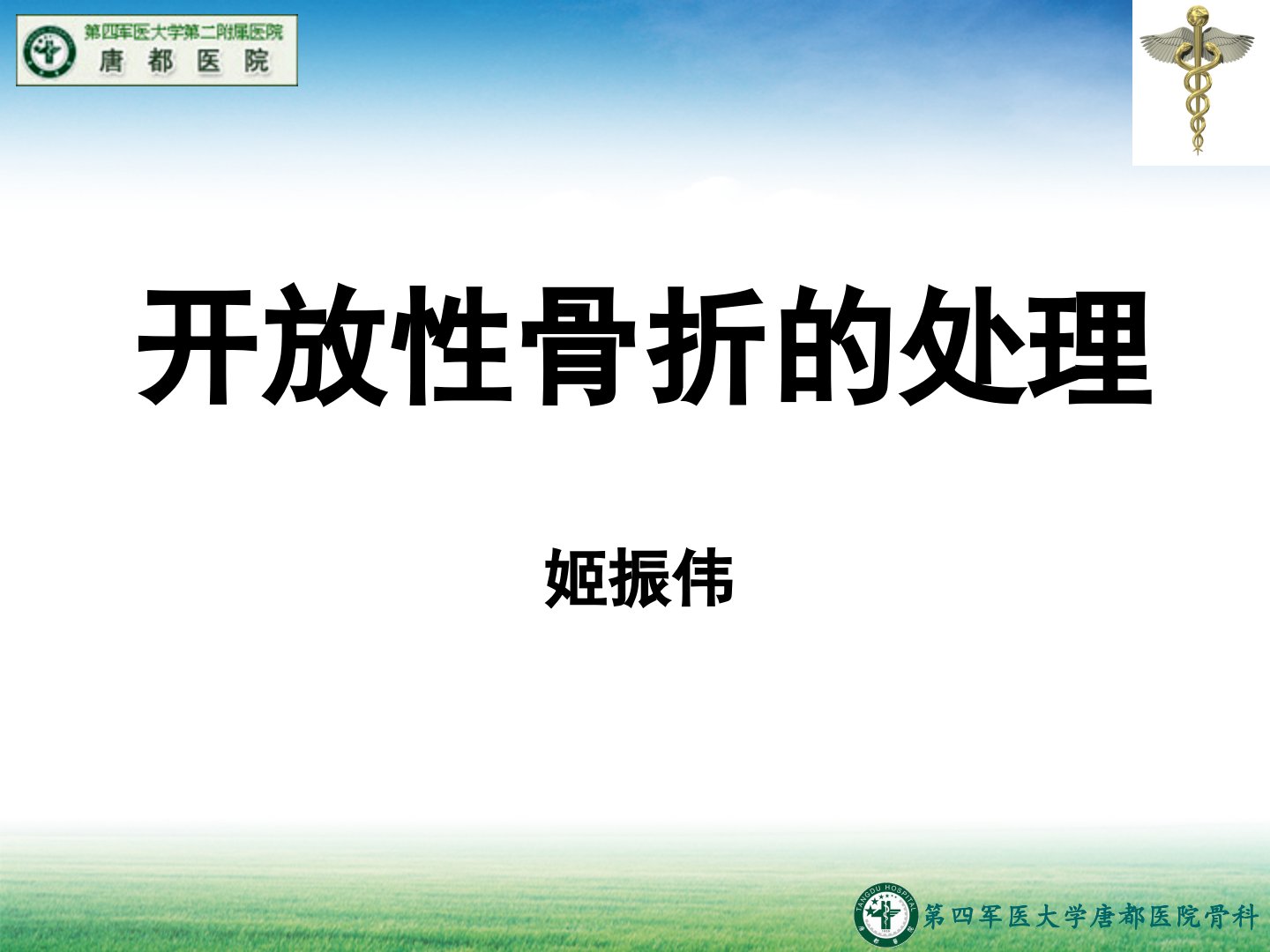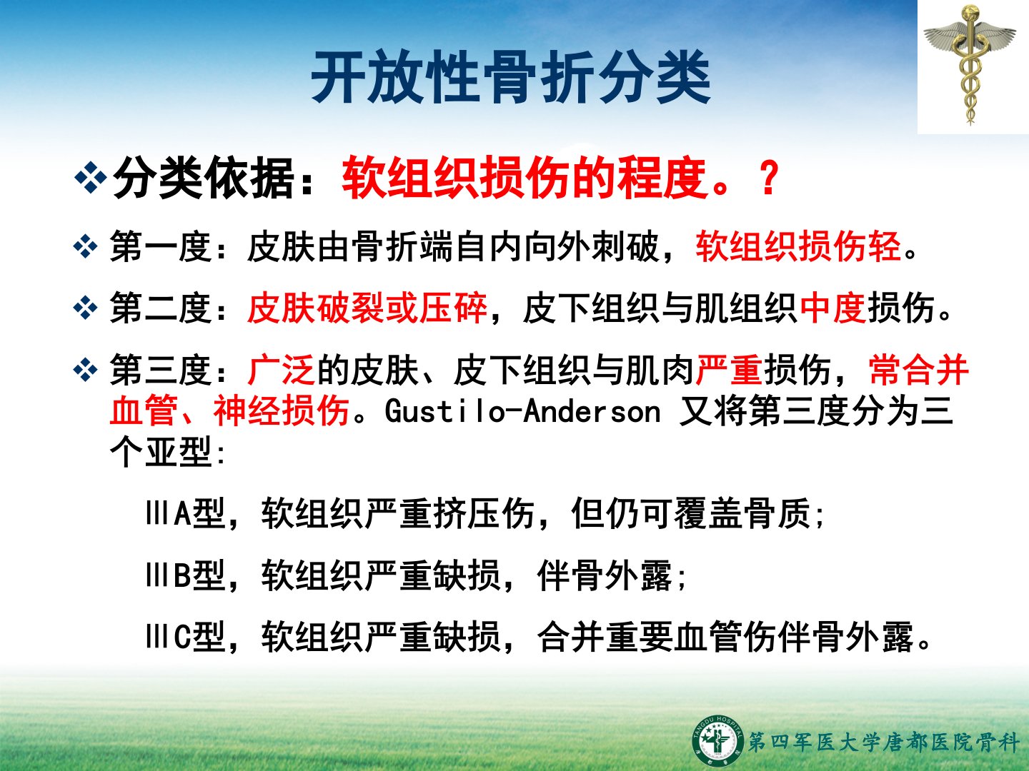 开放性骨折的处理摘要姬振伟医生介绍了开放性骨折的定义即骨折部位皮肤或粘膜破裂骨折与外界相通多由直接或间接暴力导致危害包括创口污染、骨感染、肢体功能障碍甚至生命危险。根据软组织损伤程度开放性骨折可分为三度其中第三度又细分为三个亚型。处理原则是及时正确处理创口防止感染将开放性骨折转化为闭合性骨折。术前需询问病史、检查全身情况、确定神经血管损伤、观察伤口并拍摄X线片。清创时间原则上越早越好感染潜伏期为伤后68小时。清创缝合术要求严格包括清洗消毒、切除坏死组织、处理关节韧带等。组织修复包括骨折复位固定、重要软组织修复和创口引流。最后需固定患肢使用抗生素预防感染并应用破伤风抗毒素。开放性关节损伤处理原则与开放性骨折相似旨在防止关节感染和恢复关节功能。