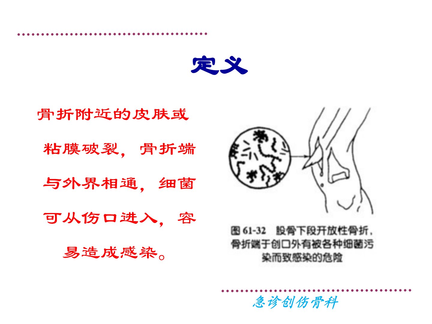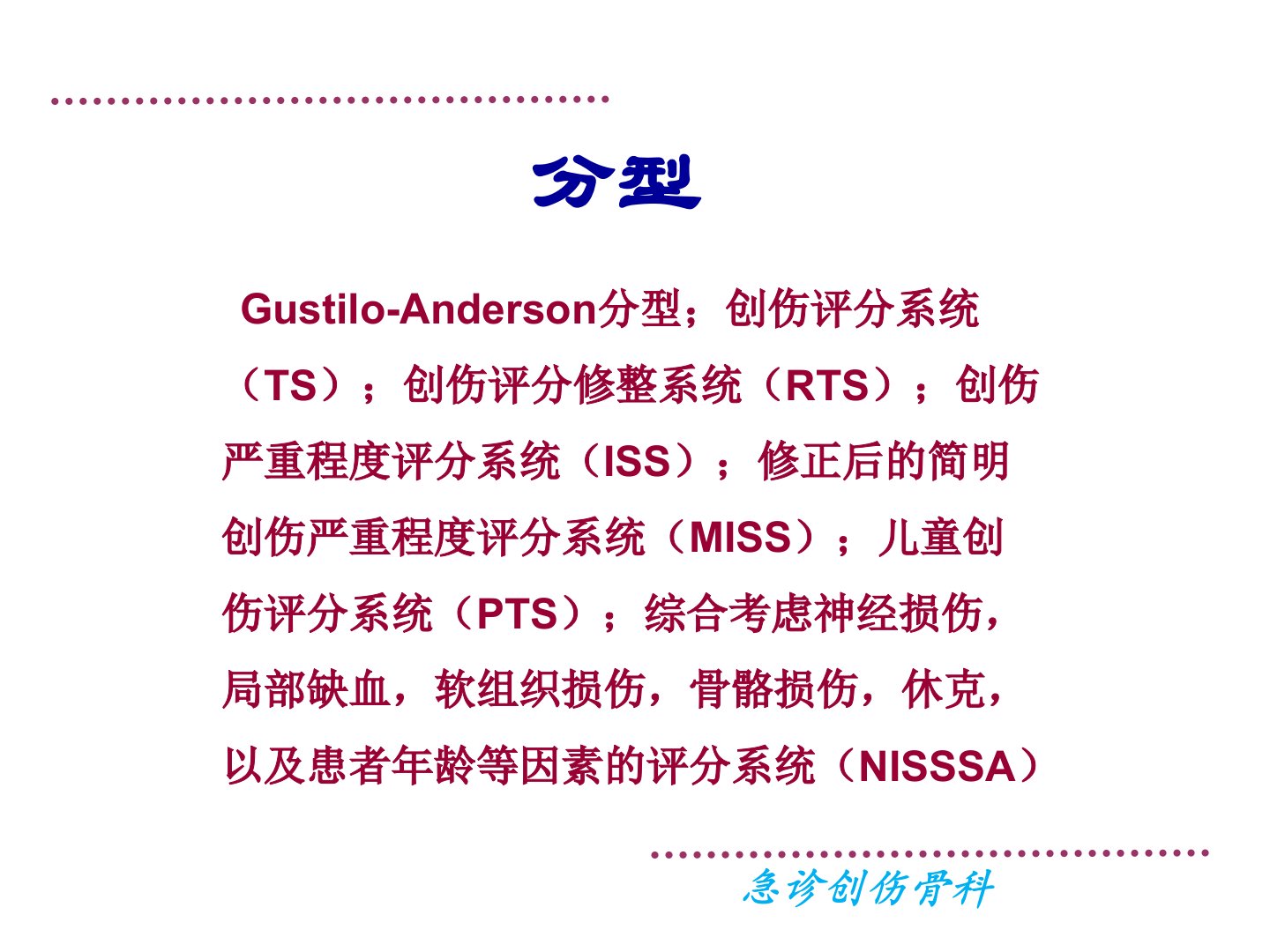开放性骨折指骨折附近皮肤或粘膜破裂骨折端与外界相通细菌易从伤口进入造成感染。急诊创伤骨科采用GustiloAnderson分型等多种分型系统综合考虑神经、局部缺血、软组织、骨骼损伤、休克及患者年龄等因素进行评分和分类。骨折类型按AO分型软组织损伤有分级系统新提出的开放骨折分类法(OTA2010)也对污染、骨缺损程度进行了分类。治疗方面需尽快恢复肢体功能保证骨折愈合避免伤口感染。充分清创是关键包括用无菌纱布覆盖创口、清水冲洗、刷洗创口周围、冲洗创口内部等步骤。对所有Gustilo型开放性骨折需多次清创且对可疑伤口重复清创和冲洗。创口闭合方面外科技术提高使一期闭合伤口达到一期愈合成为理想目标。此外修复血管神经肌腱骨折并以对损伤区域血供及周围软组织损伤最小的方法固定开放性骨折。