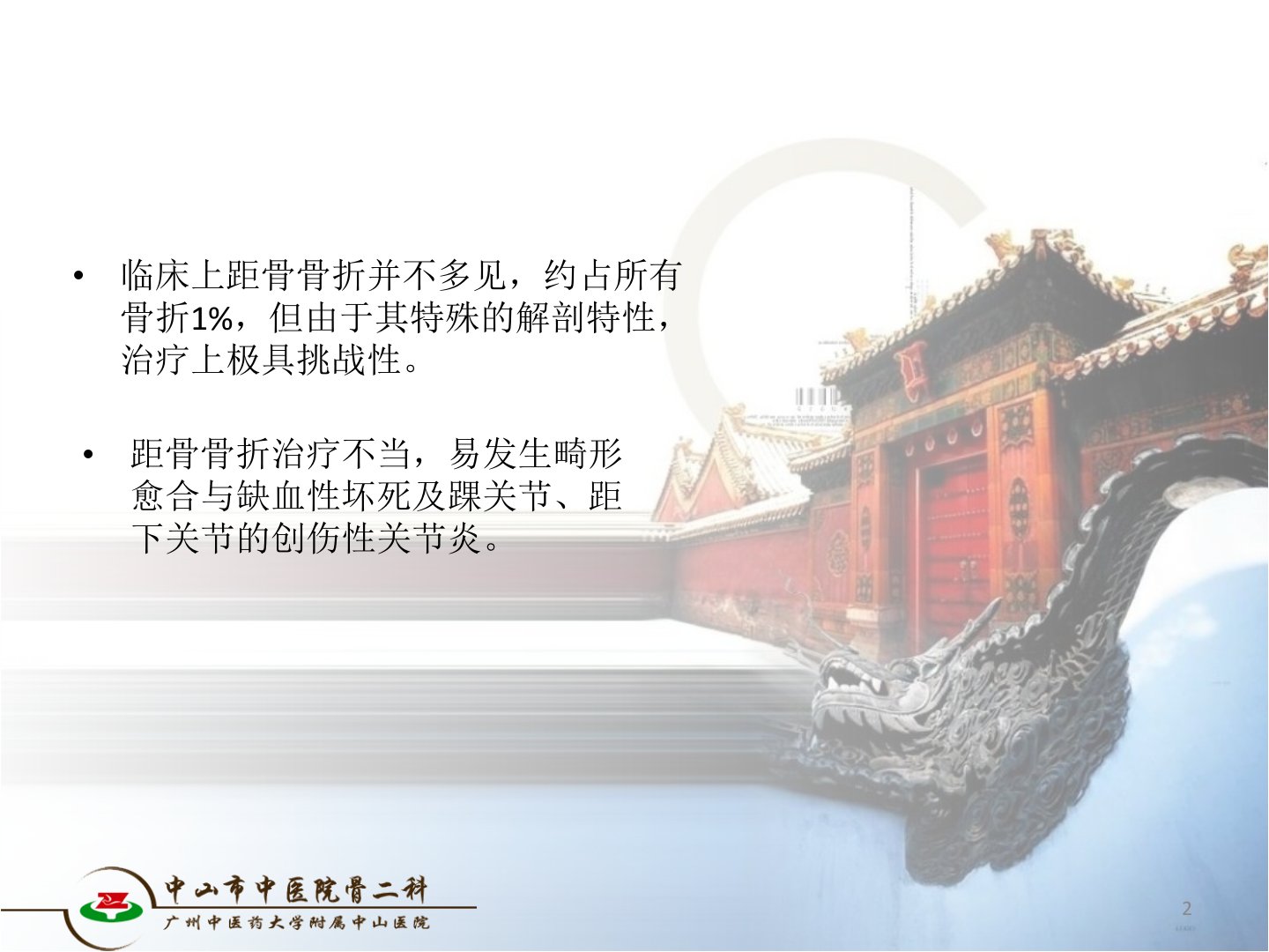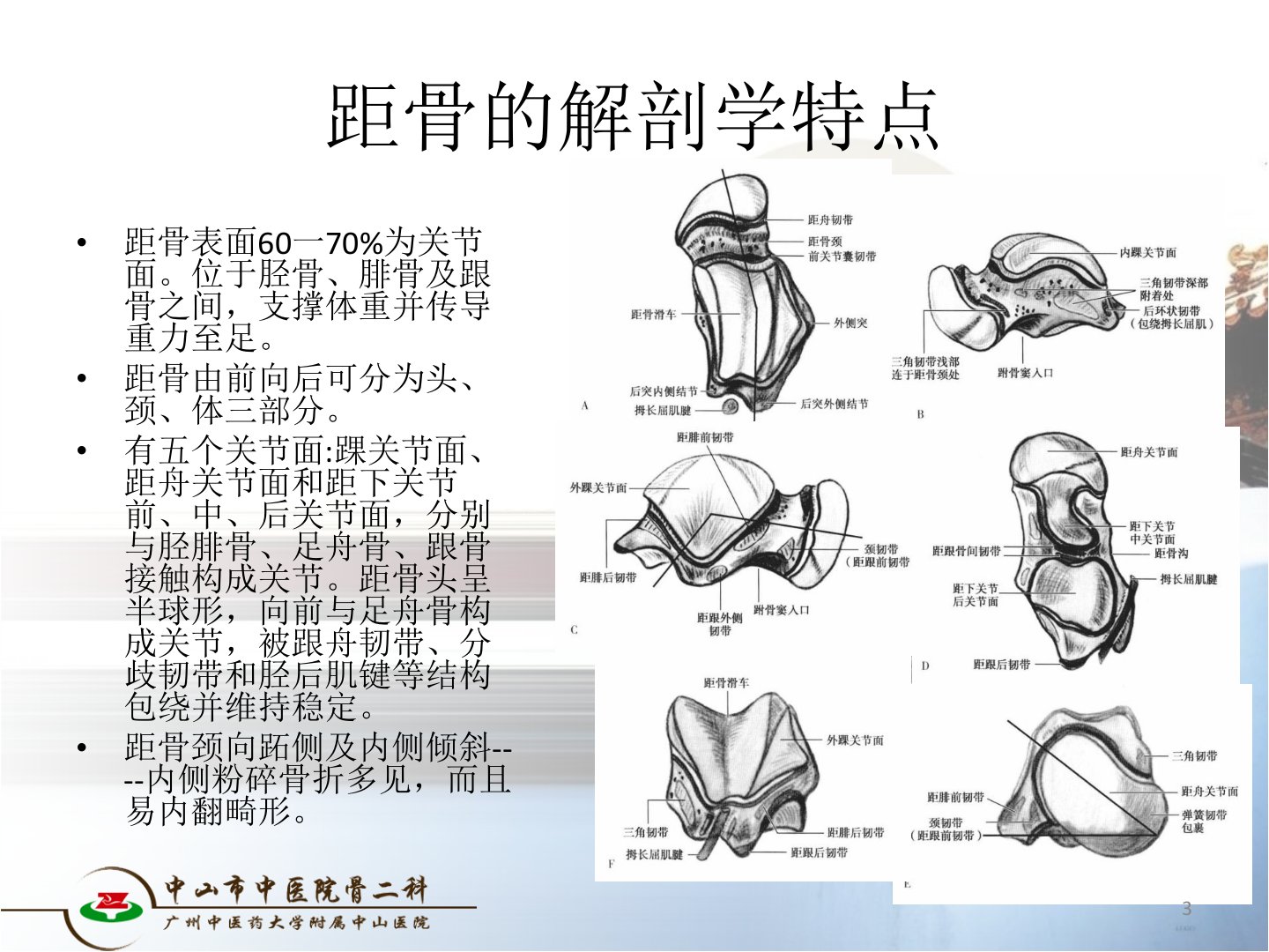 距骨骨折临床少见但治疗挑战大因距骨解剖特殊其6070为关节面由头、颈、体三部分构成血供脆弱易坏死。距骨骨折分为距骨头、距骨颈、距骨体骨折三类各有受伤机制、临床表现。距骨头骨折多因轴向负荷X线难发现多需CT治疗依移位情况选石膏固定或切开复位内固定;距骨颈骨折最常见约5064易并发其他骨折缺血坏死率高分HawkinsIIV型治疗依分型选石膏固定、闭合切开复位内固定术后早期活动定期复查;距骨体骨折血运差坏死、关节炎发生率高分IV型治疗首选保守依情况选石膏固定、关节镜检查、摘除固定碎片、同种异体骨软骨移植等累及关节面需切开复位内固定粉碎性骨折术后坏死率及创伤性关节炎极高。