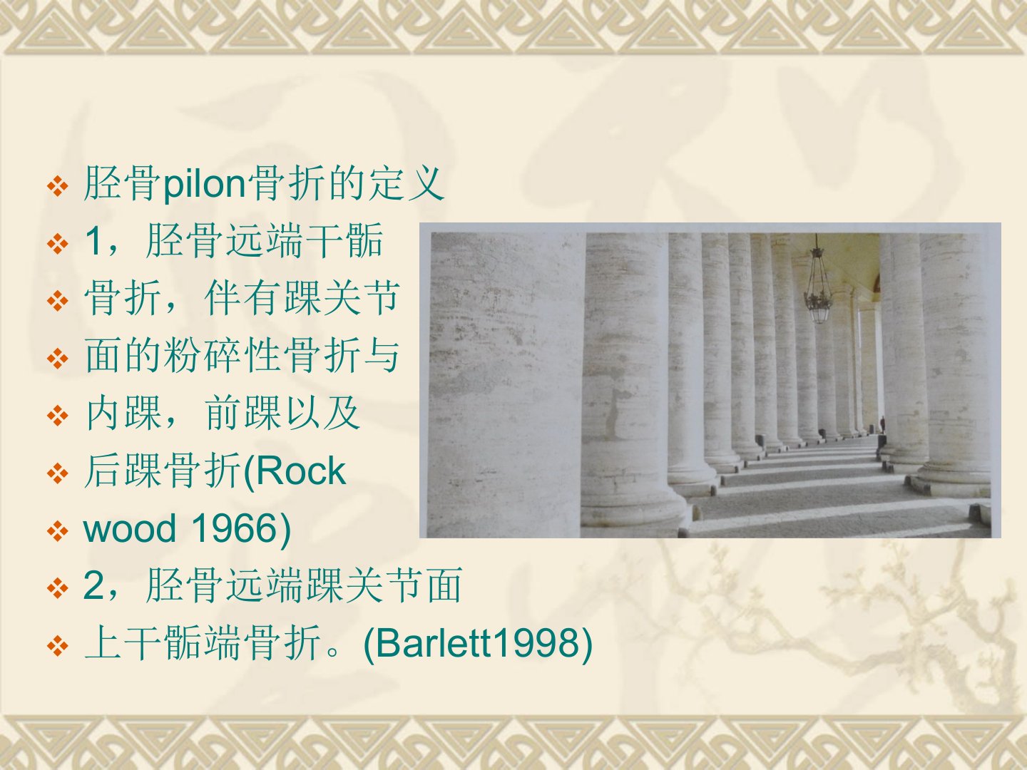 胫骨pilon骨折指胫骨远端干骺端骨折伴踝关节面粉碎性骨折及内、前、后踝骨折。RuediAllgower分类最为常用。切口选择方面前外侧切口远端起自第4跖骨基部近端止于胫骨与腓骨之间长度不宜超踝上7cm切开相关组织可暴露距骨颈及骨折块进行复位。切口选择(前内侧或前外侧)取决于前外侧骨折块大小术前放射学评估重要。关节面三块主要骨折块的内固定物选用与干骺端骨折粉碎程度、手术途径、软组织覆盖度有关有内翻畸形且干骺端内侧粉碎骨折支持经前内侧切口内侧放钢板;有外翻畸形且外侧干骺端粉碎骨折外侧或前外侧需放强有力内固定物。前外侧切口适用于完全性、部分性关节面骨折等情况但踝关节内侧部分暴露差、向上端延伸有限。高能量损伤移位骨折伴重度软组织损伤第一期闭合复位选用外固定支架;第二期521天内再次内固定手术。术后处理不上石膏患肢抬高25天主动活动68周负重。