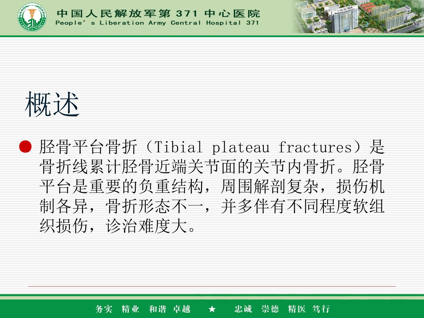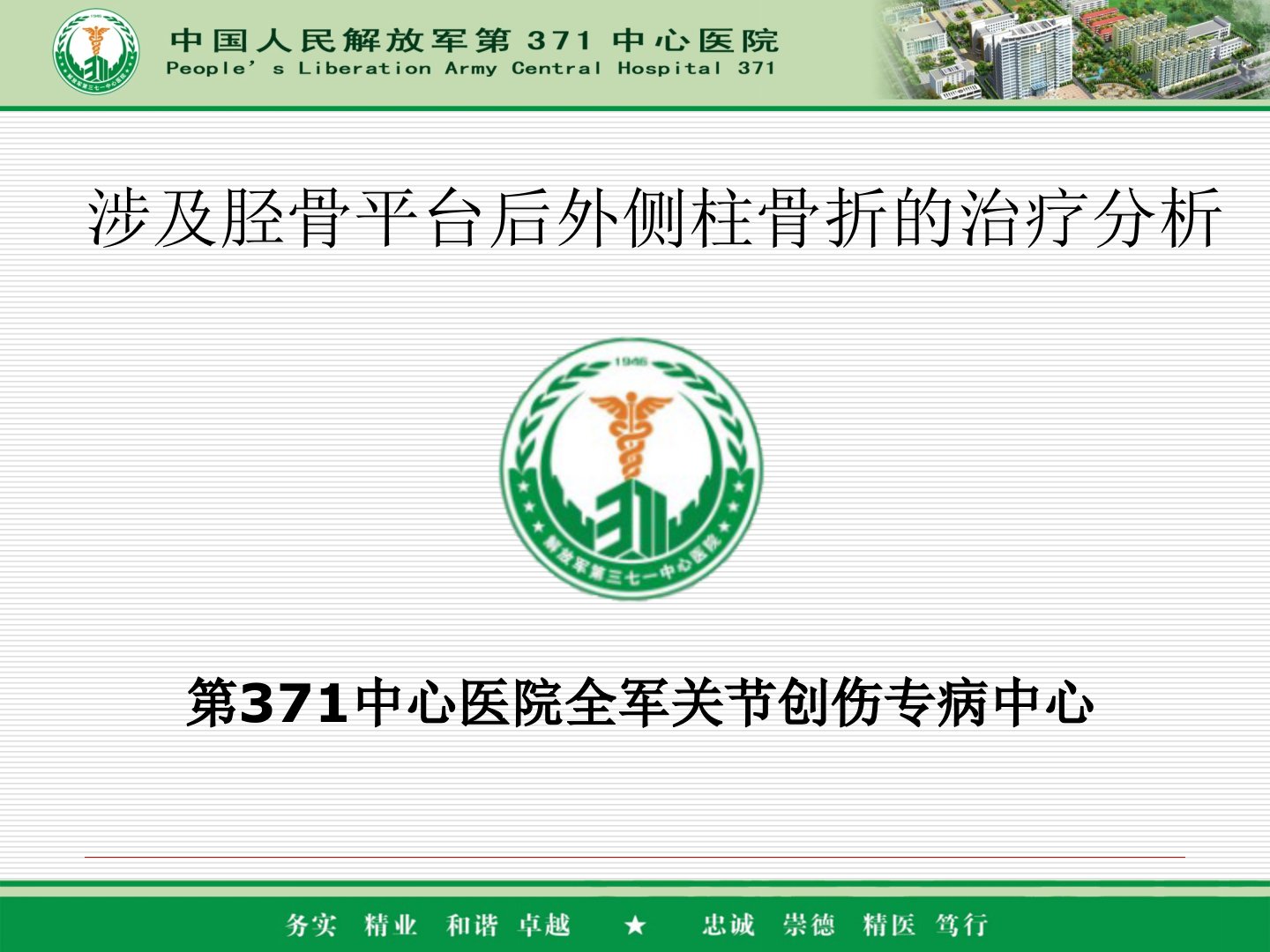 第371中心医院全军关节创伤专病中心对胫骨平台骨折进行了深入研究。胫骨平台骨折是涉及胫骨近端关节面的关节内骨折解剖复杂损伤机制多样骨折形态不一多伴有软组织损伤诊治难度大。其中胫骨平台后外侧柱骨折在所有胫骨平台骨折中占比815常见于电动车等低速交通工具侧翻摔倒致伤机制主要为膝关节屈曲或半屈曲时遭受外翻和轴向联合暴力。Schatzker分型存在缺陷不能很好评估平台后侧骨折三柱分型弥补了其不足。治疗目标是获得平整关节面、正常力线、稳定关节等。对于关节塌陷和分离3mm、干骺端明显移位或成角5等手术适应证需行手术治疗。后外侧柱骨折常见入路包括膝后正中“S”入路、膝关节后外侧弧形切口双肌间隙入路、腓骨小头上入路等各有优缺点。
