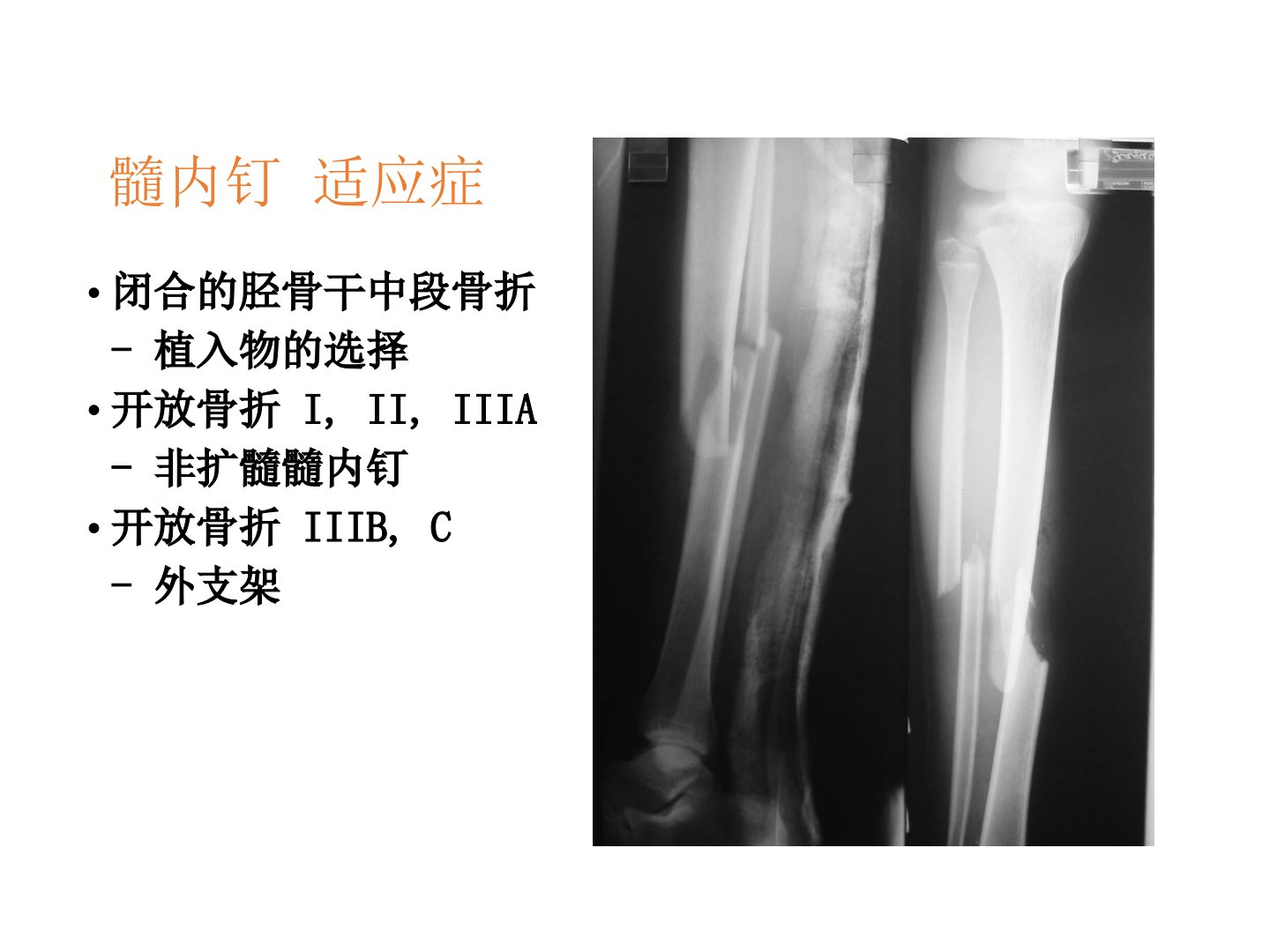 胫骨干骨折治疗目的在于预防感染、促进骨性愈合和恢复功能。胫骨干骨折特征多样包括简单、蝶形、粉碎等类型并可能涉及腓骨骨折和大面积软组织损伤可用AO分型评估。软组织损伤分型常用Gustilo及Anderson分型方便记忆但仅为60的骨科医生接受。诊断方面X线正侧位、超声及动脉造影有助于排除筋膜间隙综合症。治疗方案包括非手术治疗(石膏固定)和手术治疗(髓内固定、髓外固定)。髓内钉适用于胫骨干骨折尤其是闭合性骨折具备良好力线且对软组织损伤小;外支架则适用于IIIB、IIIC型开放骨折不破坏骨折血运且出血量少。同时需关注筋膜间隙综合症其指有限空间内压力增高影响软组织血液循环需紧急降低外部压力并预防高血钾。总之胫骨骨折治疗需根据骨折类型和软组织损伤程度选择合适方法。