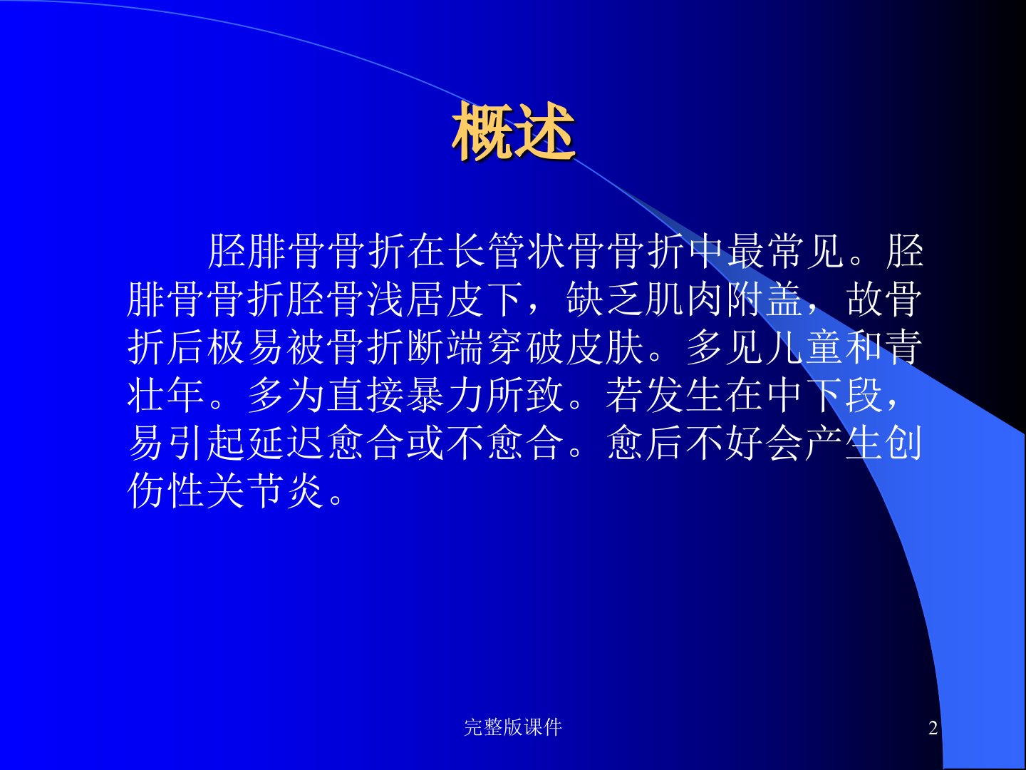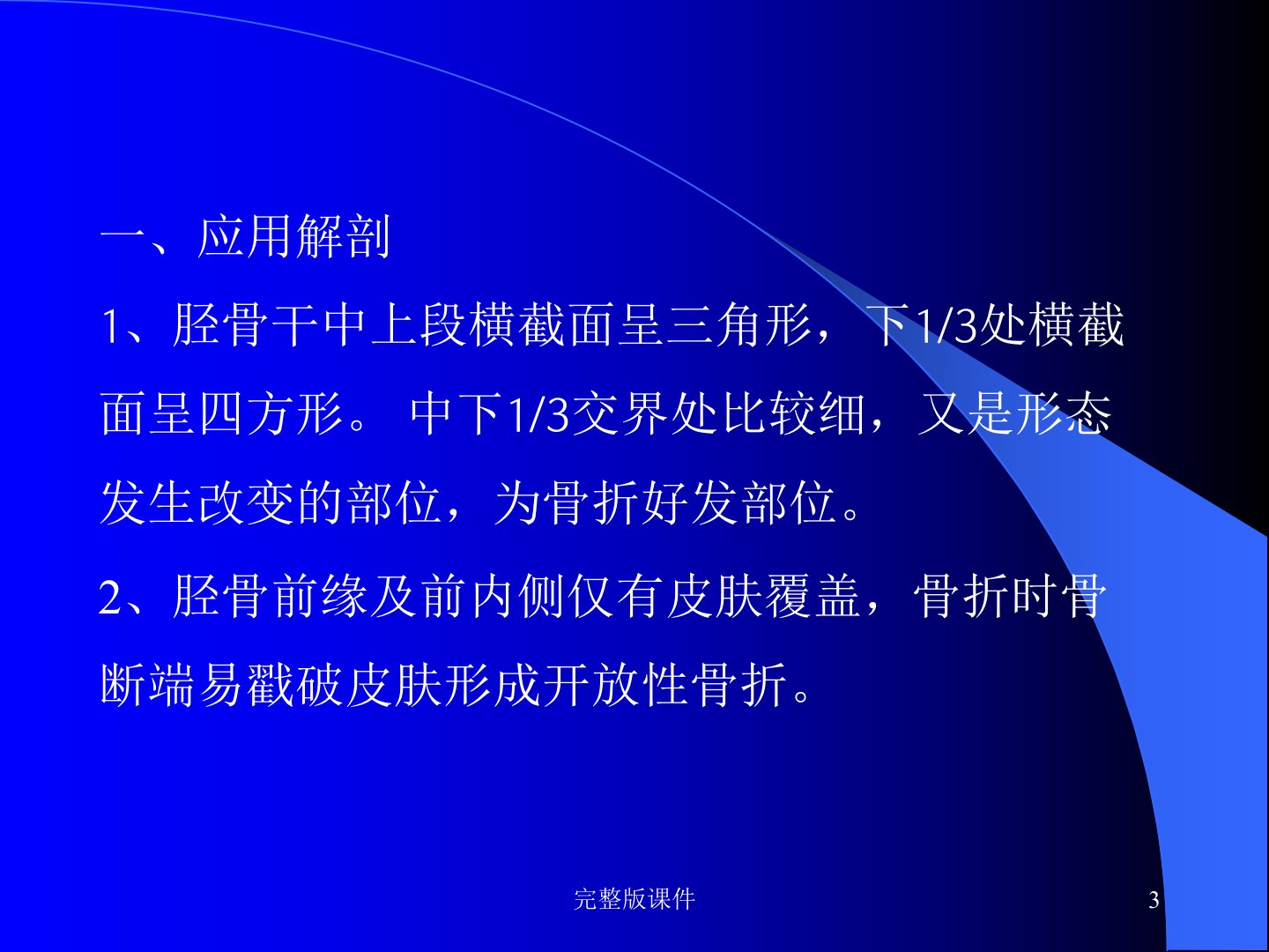 胫腓骨骨折骨一科完整版课件摘要胫腓骨骨折是长管状骨骨折中最常见类型多见于儿童和青壮年多为直接暴力所致。胫骨浅居皮下骨折后易形成开放性骨折中下段骨折易延迟愈合或不愈合愈后不佳可能产生创伤性关节炎。应用解剖:胫骨干中上段横截面呈三角形下13处呈四方形中下13交界处为骨折好发部位。腓总神经绕行于腓骨头下外侧腓骨上端骨折时易损伤。病因病理:儿童以胫骨干骨折最多成人多为胫腓骨干双骨折。直接暴力多致粉碎或横断骨折间接暴力多为螺旋或斜行骨折。肌肉牵拉、重力等影响骨折移位骨折后易出现骨筋膜间隙综合症损伤胫前、胫后动脉且中下段骨折易迟缓愈合或不愈合。诊断与治疗:外伤史、局部肿痛瘀活动受限、X线检查可诊断。治疗原则是恢复小腿长度和负重功能处理胫骨骨折对位对线包括无移位骨折夹板固定、有移位骨折手法复位夹板固定或跟骨牵引、开放性骨折清创、合并筋膜间隙综合症切开减压、手术治疗等。护理:包括病情观察、疼痛护理、术后处理、预防感染等。功能锻炼分愈合期和恢复期出院后需定期复查、按时服药、加强功能锻炼、保持心情愉快、劳逸适度、加强营养。