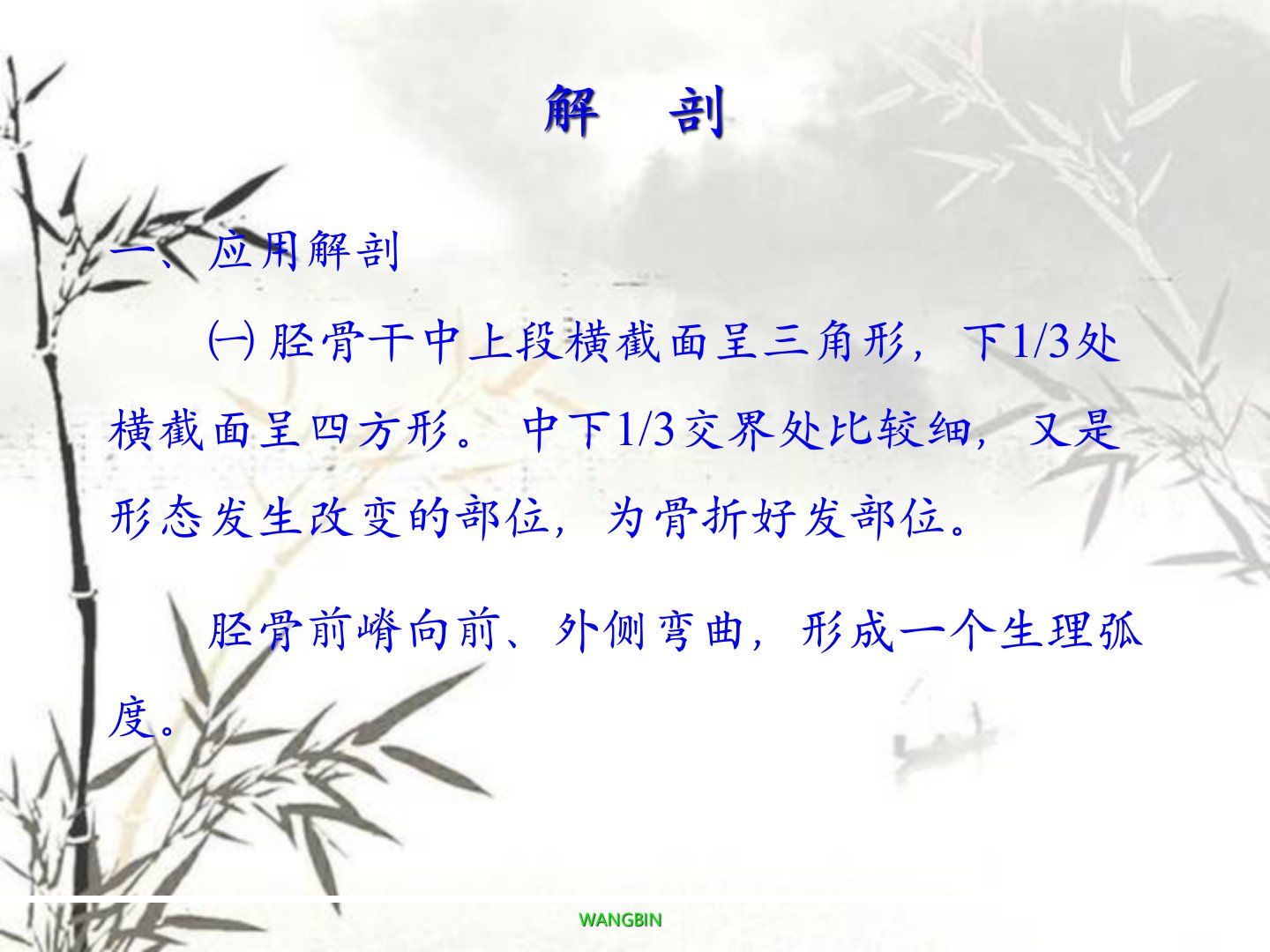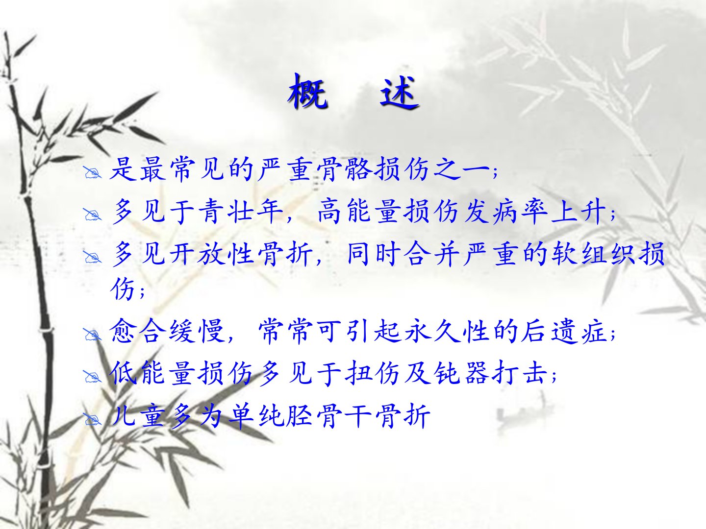 胫腓骨干骨折是常见严重骨骼损伤多见于青壮年高能量损伤导致开放性骨折及严重软组织损伤的情况增多且愈合缓慢易留下后遗症。儿童则多为单纯胫骨干骨折。胫骨干中上段横截面呈三角形下13处呈四方形中下13交界处为骨折好发部位。胫骨前嵴向前外侧弯曲形成生理弧度承担约16体重腓骨则主要供小腿肌肉附着。骨折病因包括直接和间接暴力前者多导致开放性损伤后者则多为螺旋或斜行骨折。骨折后易出现骨筋膜间隙综合症和缺血性挛缩中下段骨折还易发生迟缓愈合或不愈合。诊断要点包括外伤史、局部肿痛瘀斑、活动受限等X线检查应包括膝、踝关节必要时进行CT检查。治疗原则为恢复小腿长度和负重功能重点处理胫骨骨折对位对线治疗方法包括保守和手术治疗。术后需进行功能锻炼护理措施包括功能锻炼指导出院后需继续功能锻炼并定期复查。