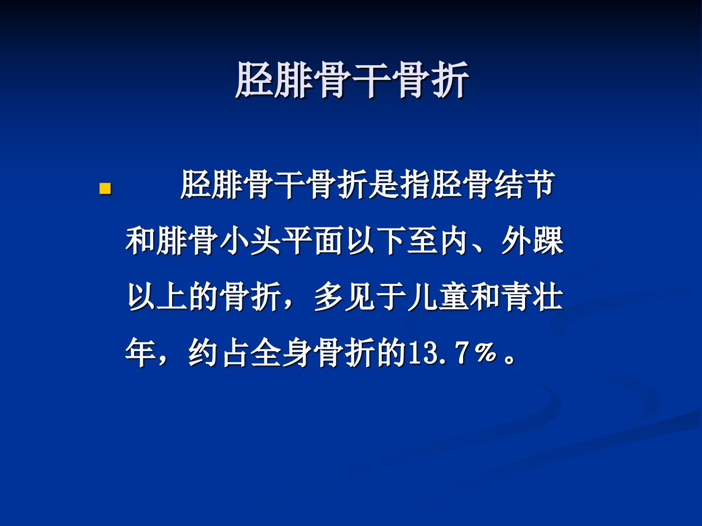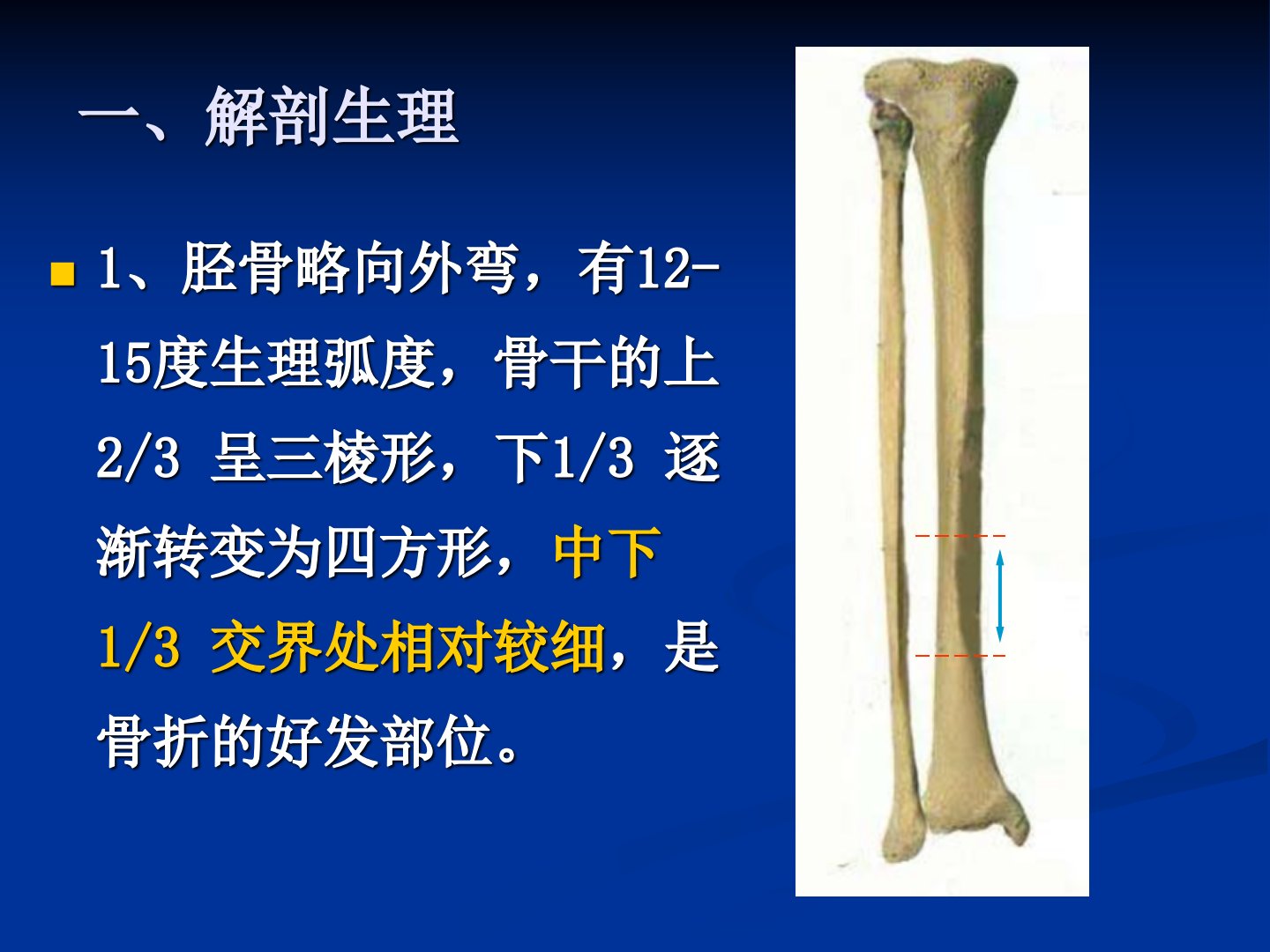 胫腓骨干骨折指胫骨结节和腓骨小头平面以下至踝部以上骨折多见于儿童和青壮年占全身骨折的137。解剖上胫骨有生理弧度中下13交界处较细易骨折且胫骨前内侧无肌肉附着易造成开放性损伤。胫骨上13后方有重要血管通过腓骨小头内下方有腓总神经该部位骨折可能损伤血管和神经且胫骨中下段血供特殊骨折后易迟缓愈合或不愈合。病因上直接暴力导致横形或粉碎形骨折间接暴力则多为斜形或螺旋形骨折。诊断依据包括伤后小腿症状、畸形、压痛、异常活动和骨擦音以及X片显示。并发症有开放性骨折伴感染、骨筋膜室综合症、血管损伤、腓总神经损伤及骨折迟缓愈合或不愈合。治疗原则为恢复小腿长度和负重功能重点处理胫骨骨折稳定性骨折采用手法复位和固定不稳定骨折则配合跟骨牵引或外固定支架切开复位内固定适用于手法复位失败、开放性骨折等情况。