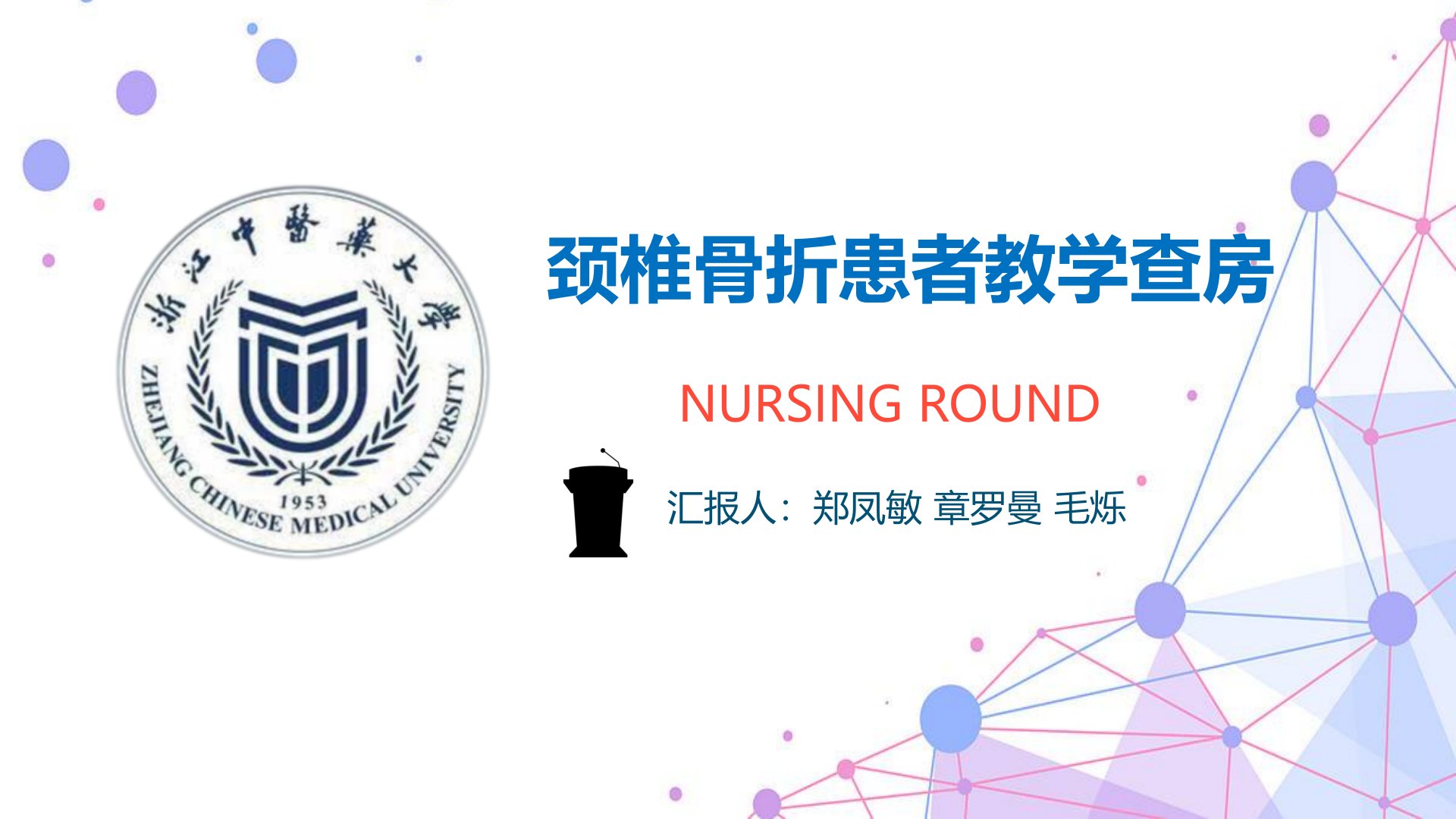 颈椎骨折患者教学查房NURSINGROUND汇报摘要汇报人:郑凤敏、章罗曼、毛烁查房目标为熟悉颈椎骨折病因、临床表现掌握常见护理问题、术后护理。疾病介绍部分阐述了颈椎解剖生理特点“颈椎骨折”多由暴力导致以头、颈痛颈部筋肉紧张活动受限等为主要表现多伴有脊髓损伤好发于颈45及颈67三个椎间隙。案例汇报中患者沈建明53岁疑似酒后骑电动车摔伤CT示颈椎骨折有高血压病史。入我院后急诊拟“高位截瘫椎骨折”收住留抢诊疗计划包括完善检查、对症治疗、限期手术。手术为脊髓损伤后路单开门式椎管扩大成形术后路固定术术后安返病房。护理问题与措施涵盖躯体活动障碍、疼痛等问题通过定时翻身、心理护理、生活协助等措施应对。术后并发症护理方面密切观察生命体征预防血肿、喉上喉返神经损伤、脊髓损伤加重等并发症。健康宣教强调制动、功能锻炼、定时翻身及饮食指导的重要性。