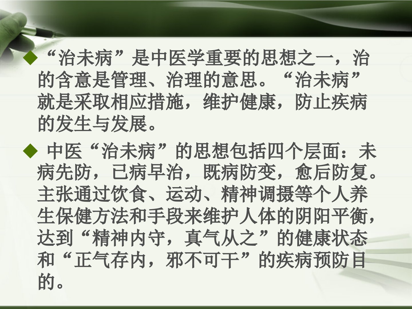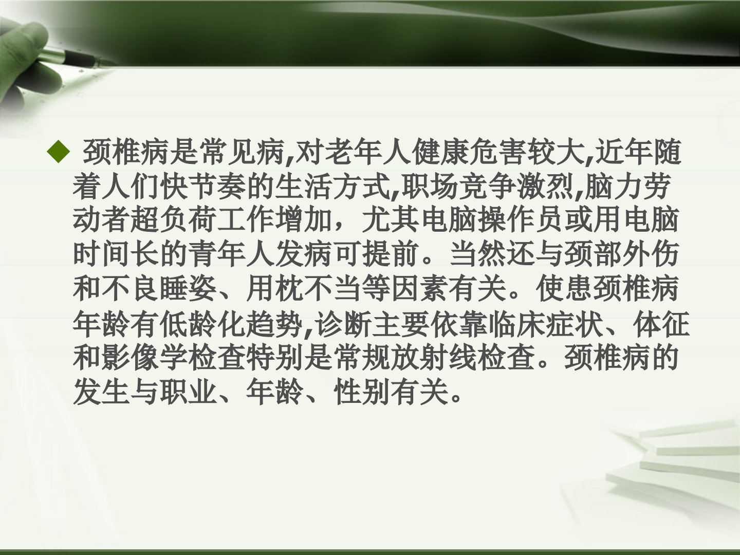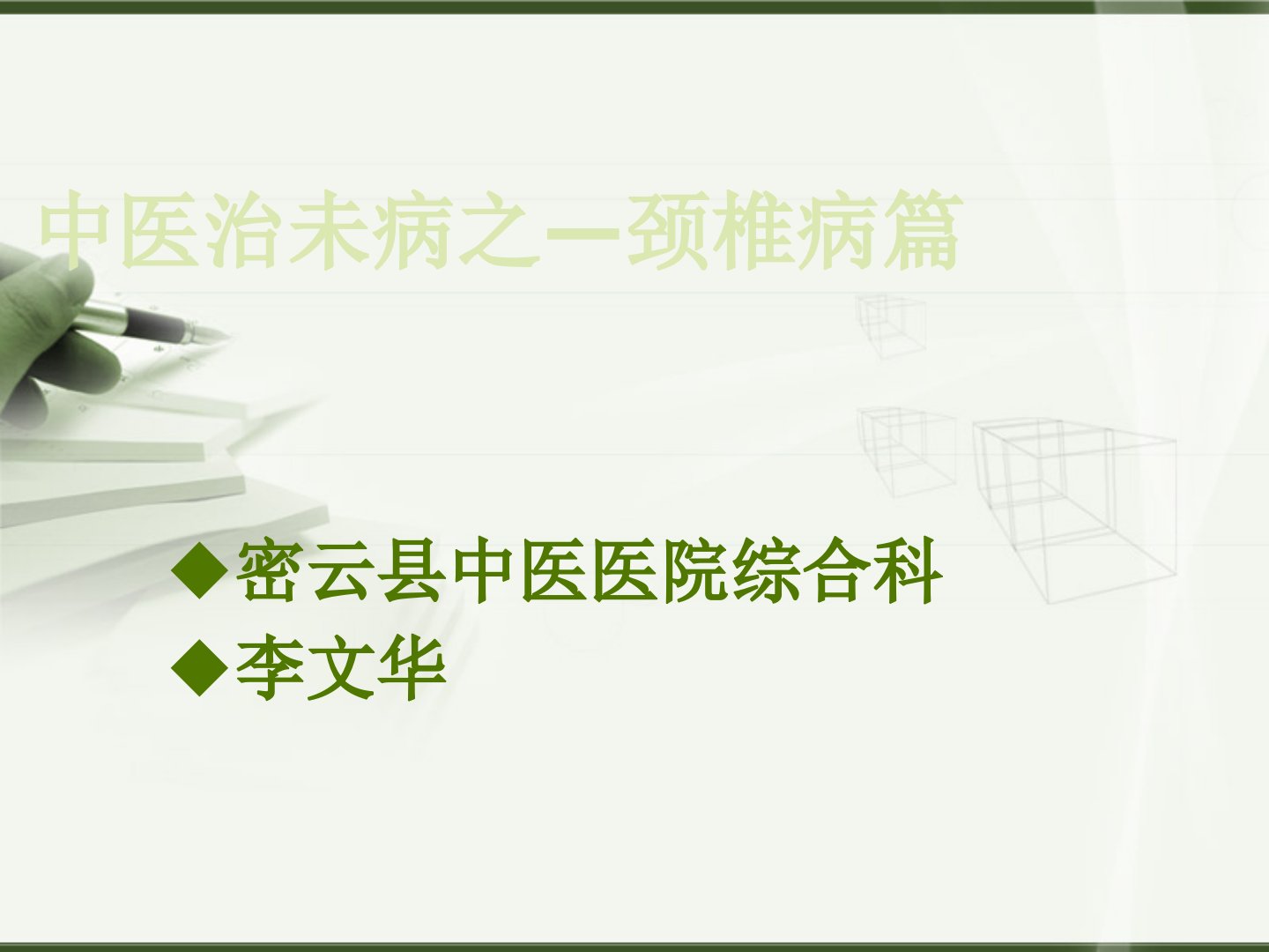 密云县中医医院李文华介绍了中医“治未病”思想在颈椎病防治中的应用。“治未病”指采取措施维护健康防止疾病发生发展包括未病先防、已病早治、既病防变、愈后防复四个层面。颈椎病近年呈低龄化趋势与职业、年龄、外伤、不良睡姿等因素有关高发于4150岁人群伏案工作者患病率高于体力劳动者。颈椎病症状包括头、颈、肩等酸痛活动受限严重者伴有恶心呕吐、四肢瘫痪等症状。颈椎病分交感神经型、神经根型、脊髓型、椎动脉型四种其中神经根型发病率最高。预防颈椎病日常应注意枕头高度和姿势避免长时间低头工作注意颈部保暖。按摩后溪穴、艾灸大椎穴等穴位以及进行功能锻炼也有助于预防。食疗方面药膳疗法可选取强筋壮骨食物肝肾亏虚者可用葛根当归煲猪脊骨等风寒湿痹者可用川芎白芷炖鱼头等。