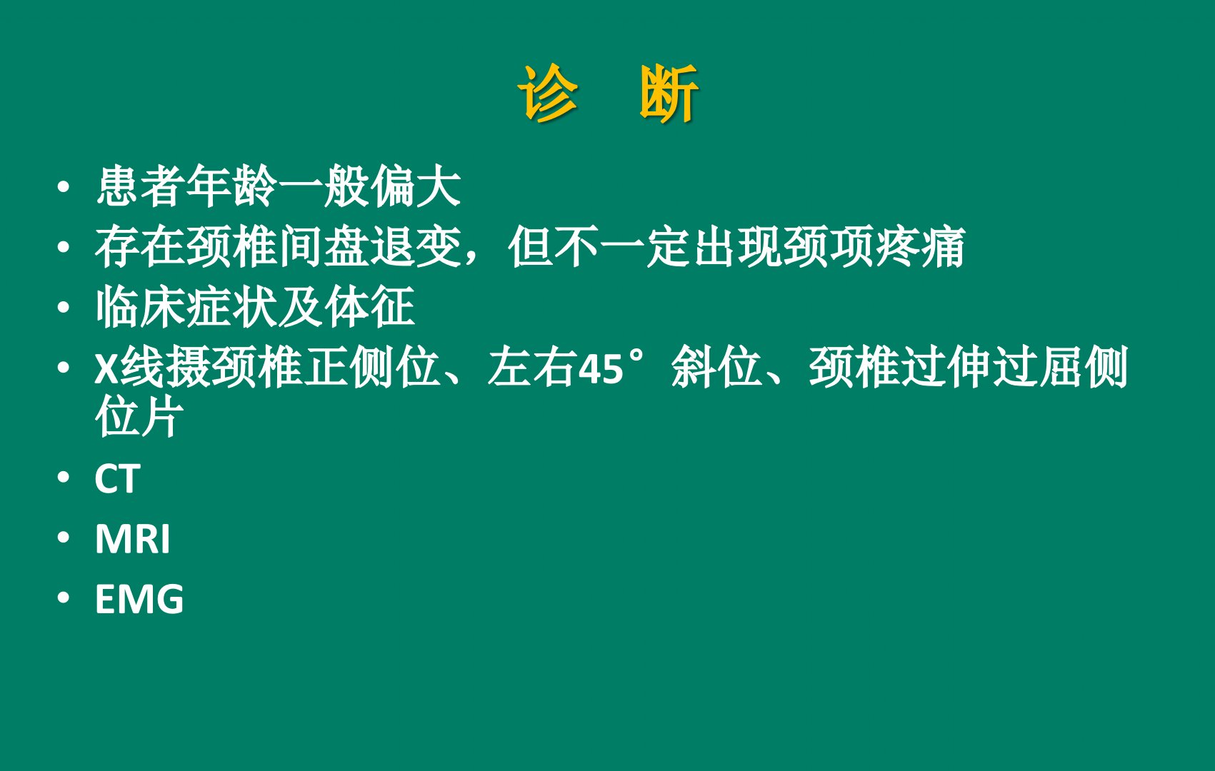 颈椎病多见于年龄偏大者但有年轻化趋势症状复杂多变常伴多种症状需与内科疾病仔细鉴别。诊断原则包括临床表现与影像学相符、排除其他疾患、无症状但影像学异常者不诊断。颈型颈椎病要点为颈肩枕部疼痛、活动受限X线片显示颈椎曲度改变等。神经根型有根性症状且与颈脊神经支配区域一致影像学与临床表现相符多种试验多为阳性。颈椎病需与落枕、侧索硬化症、过伸性损伤等多种疾病鉴别。颈椎病治疗方法多样总体分保守和手术两种。非手术疗法是基础可加速消除炎症反应、减轻症状适应征包括轻度颈椎间盘突出征等。手术疗法有严格适应证需客观评价设备与技术条件手术途径、范围与固定方式依病情决定以减压彻底、损伤少和不破坏颈椎稳定性为原则包括颈椎前路手术和颈椎后路手术各有适应症和并发症需做好预防。