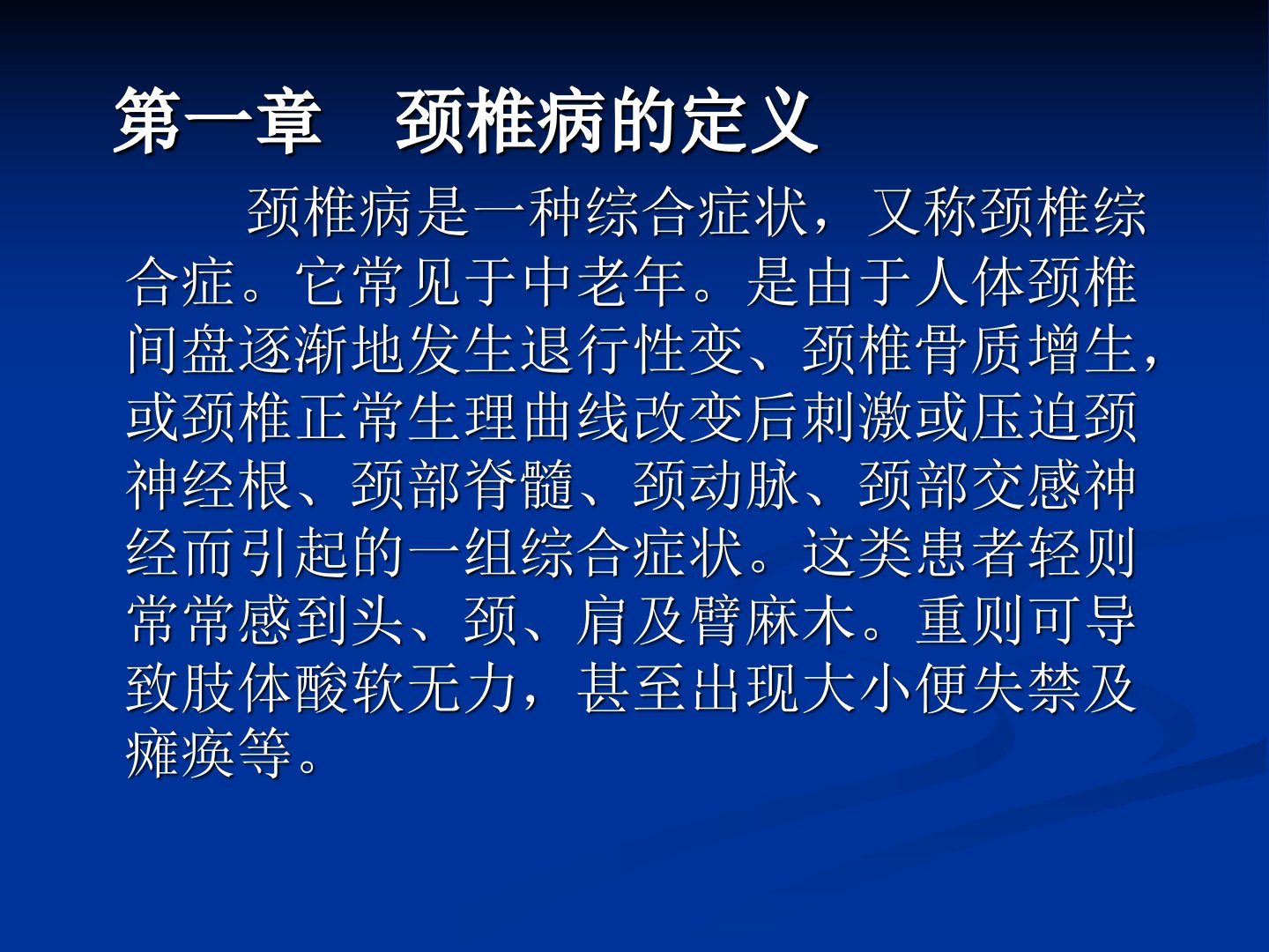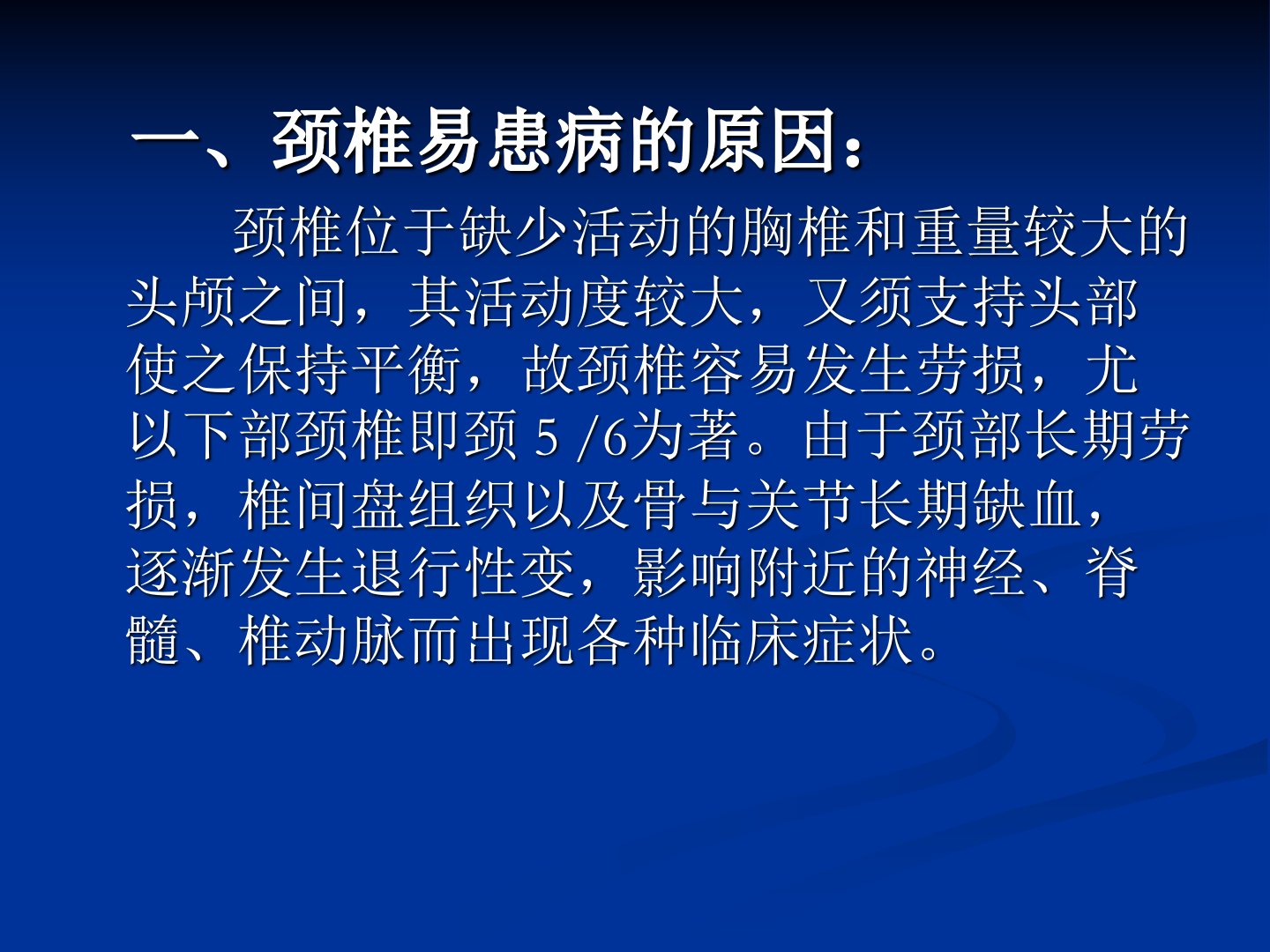 颈椎病讲义第一章颈椎病的定义一、颈椎易患病的原因:二、颈椎病发生的原因:目前通过对颈椎病的全程分析和全面观察,可以确信本病的原因如下:第一,退行性变:随着年龄增长而产生的颈椎间盘退行性变以及由此而致的整个颈椎和颈椎其它部位的退变是颈椎病的主因。第二,慢性劳损:所谓慢性劳损是指超过正常生理活动范围的最大限度的活动。包括有:1.睡眠的不良体位:因其持续时间长,会造成椎旁肌肉、韧带及关节的失调,而波及椎管内组织,加速退变过程。2.工作的姿势不当:处于坐位,尤其是低头工作的,虽工作量不大,强度不高,但颈椎病发病率特高。如,文秘、计算机员、会计、公务员,电子行业员工、教师,大中专学生等。生活中长时间打麻...