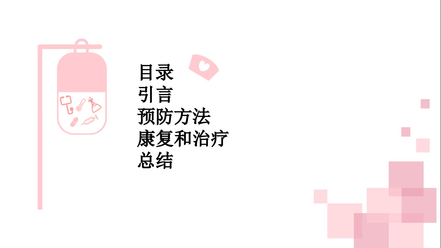 颈椎病健康教育PPT摘要引言:颈椎病是常见疾病多因颈部长时间姿势不正确致颈椎受损长时间不良姿势、缺乏休息是诱因会导致颈部疼痛、头晕等不适严重时手麻、头痛。预防方法:保持正确坐姿维持颈椎正常曲度;长时间静坐后起身活动拉伸颈部肌肉;睡眠选合适枕头避免颈部过度弯曲或挺直;加强颈部和肩部拉伸运动增强肌肉力量;控制电子产品使用时间减少长时间使用。康复和治疗:专业康复包括物理治疗和按摩;中药可改善血液循环、调节颈椎问题;注意避免长时间低头等不适动作;严重症状或需手术但风险大需慎重。总结:提醒大家预防颈椎病保持良好习惯及时就医遵循医生建议治疗康复。