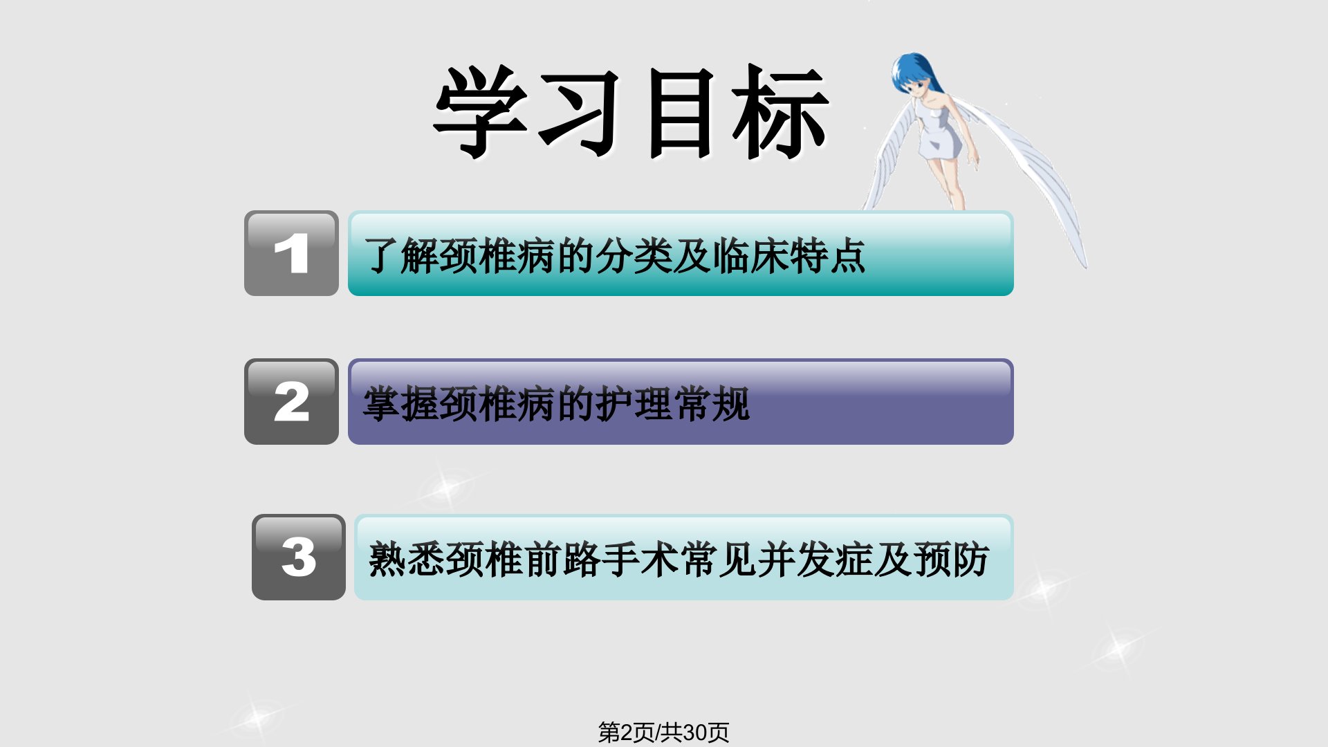 颈椎病护理常规摘要本文详细阐述了颈椎病的护理规范内容涵盖颈椎病定义、流行病学、分类、各类型临床特点。其中颈椎病由颈椎间盘退变等引发可压迫神经根、脊髓影响椎动脉血液供应。临床类型包括神经根型、脊髓型、椎动脉型、交感神经型、混合型及其他型。护理方面术前需全面评估患者病史、体格等开展心理、体位等训练并做好术前准备。术后要密切监测生命体征、肢体感觉运动等采取体位中立、呼吸道管理、脊髓神经功能恢复观察、饮食、切口引流管及尿管护理、疼痛护理等措施。同时需警惕并发症如颈深部血肿、植入物脱落、脑脊液漏、切口感染、喉头痉挛、喉返神经损伤、皮肤压迫性坏死等并采取相应预防措施。此外还强调了功能锻炼、健康宣教及出院指导包括颈围外固定、功能锻炼、佩戴颈托时间、避免颈部剧烈运动等确保患者顺利康复。