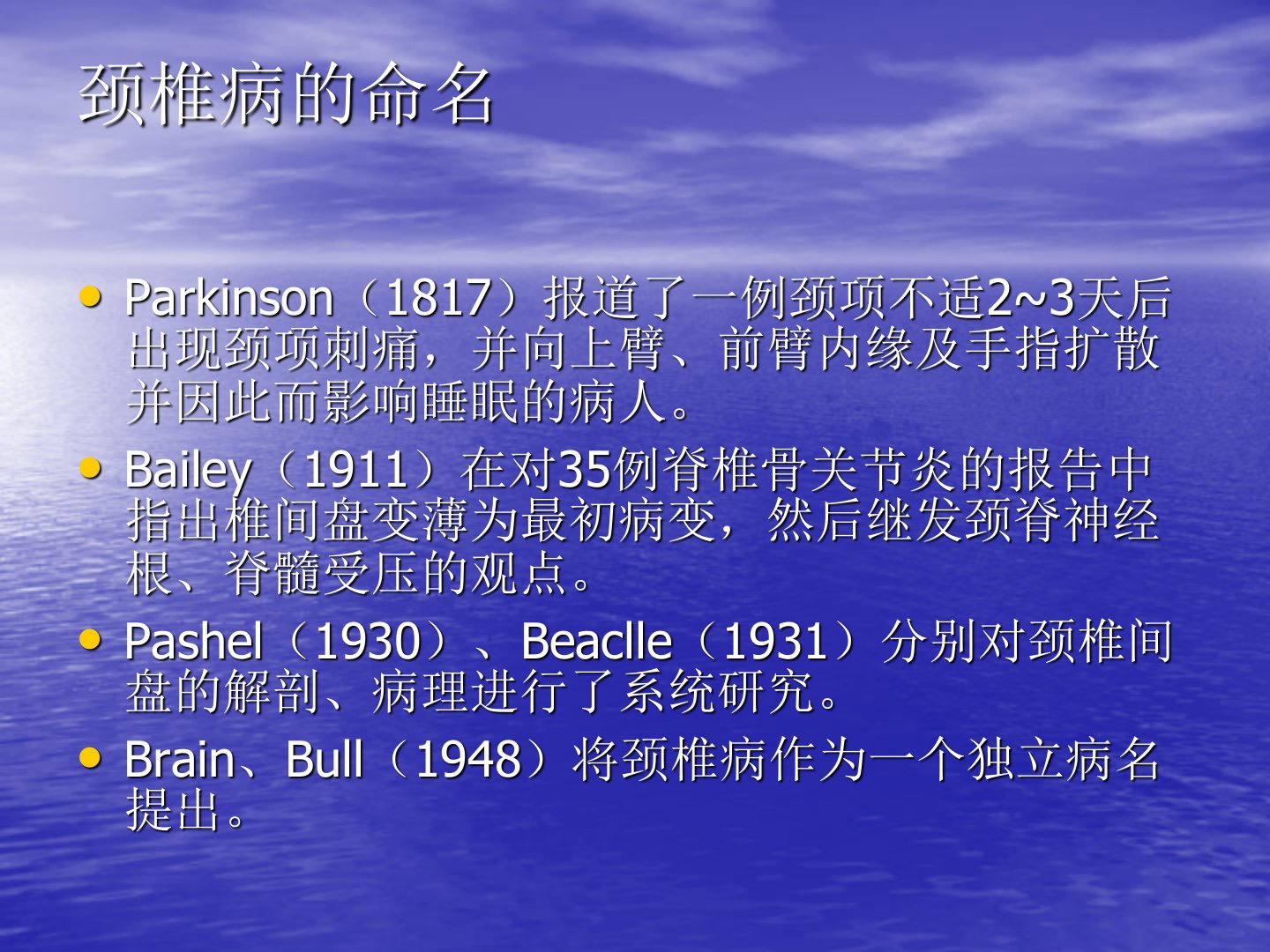 Parkinson(1817)报道了颈项不适扩散并影响睡眠的病例Brain等(1948)将颈椎病作为独立病名提出。Kellgren、Lawrence(1952)调查患病率为3575Irvine(1965)调查患病率为5853国内专家认为国人患病率在10左右。颈椎解剖变异如C23椎体融合、颈肋等会增加患病风险。钩突的特殊形态使颈椎活动范围增大稳定性降低易发生微细损伤头颅挤压和颈部过度活动会形成Luschka关节。影像学检查可判断横韧带断裂、颈椎失稳、椎间孔孔径变小等情况。颈椎病症状包括头、颈、肩等痛或麻感及运动障碍颈椎僵硬活动受限等应与多种疾病相鉴别。眩晕型颈椎病与体位有关慢性脑供血不足则症状多种多样。脊髓型颈椎病早期表现肢体沉重晚期出现瘫痪等症状。颈椎牵引可放松肌肉、解除痉挛、改善血液循环、减轻疼痛还能松解组织粘连、恢复颈椎力线、降低椎管内压、改善椎—基底动脉的血液循环起到制动和固定作用。