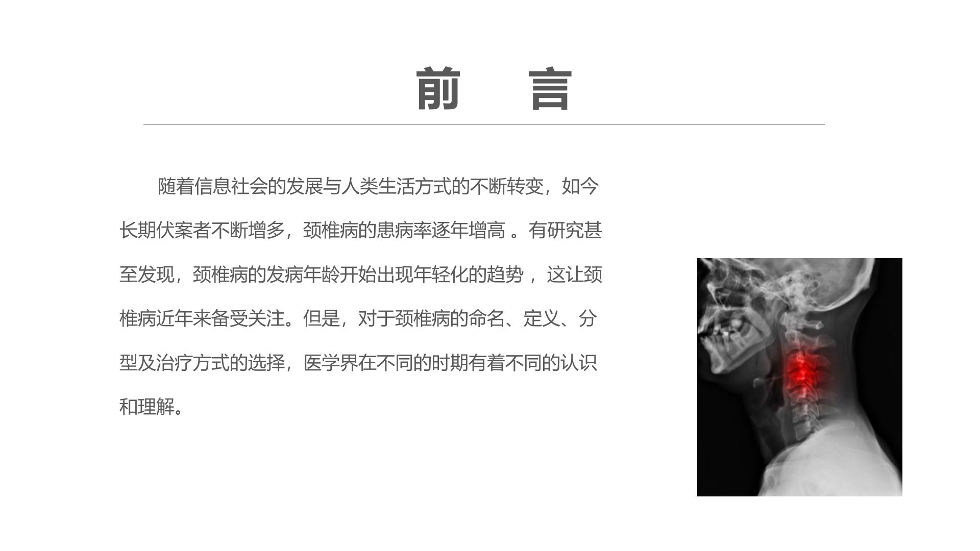 摘要随着社会发展与生活方式转变颈椎病患病率逐年上升且发病年龄年轻化其命名、定义、分型及治疗方式的选择医学界认识不一。在定义上1948年Brain首次提出“颈椎病”概念后经多次讨论目前基本统一为颈椎椎间盘退行性改变及其继发病理改变累及周围组织而引起的各种症状和体征。分型方面历经多次调整目前许多学者倾向于分为颈型、神经根型、脊髓型、椎动脉型和交感神经型。对于各型颈型多认为与颈部软组织等病变有关有观点认为应定义为颈背肌筋膜炎;脊髓型由多种因素压迫脊髓致功能障碍;椎动脉型是椎动脉血流减少致眩晕;神经根型是混合突出物致颈神经根炎;交感型是刺激颈交感神经致功能失调但“交感型颈椎病”能否独立分型存在分歧。目前“颈椎病”病名虽达成共识但存在过于笼统泛化的问题建议淡化该诊断采用更具体的名称分型应以解剖学规律和病理机制为依据。